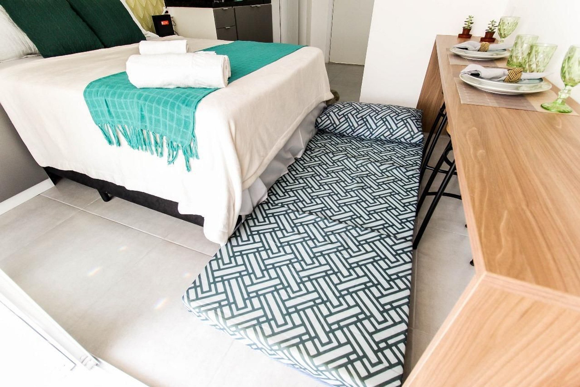 Quarto confortável com cama de casal e colchão adicional disponível, garantindo uma noite de sono tranquila.