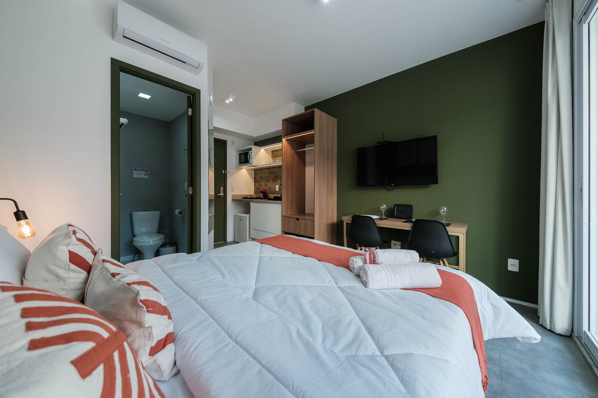 Localizado em um prédio moderno e completo, você terá tudo o que precisa para uma estadia inesquecível: relaxe na piscina, mantenha sua rotina na academia, aproveite a praticidade da lavanderia e do mercadinho no local, e conte com a segurança da portaria 24h. O apartamento é perfeito para até duas pessoas, com cama queen, ar-condicionado, micro-ondas e um enxoval de hotelaria impecável, garantindo todo o conforto de um hotel com o charme de se sentir em casa.