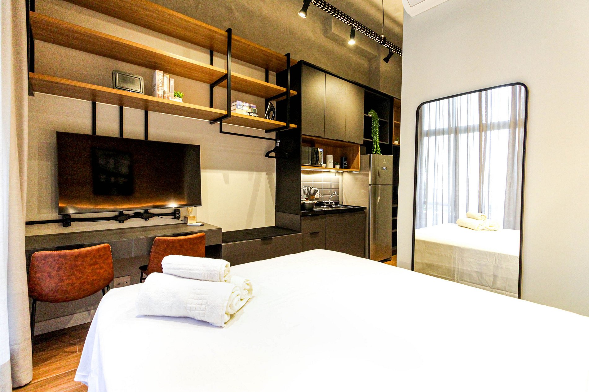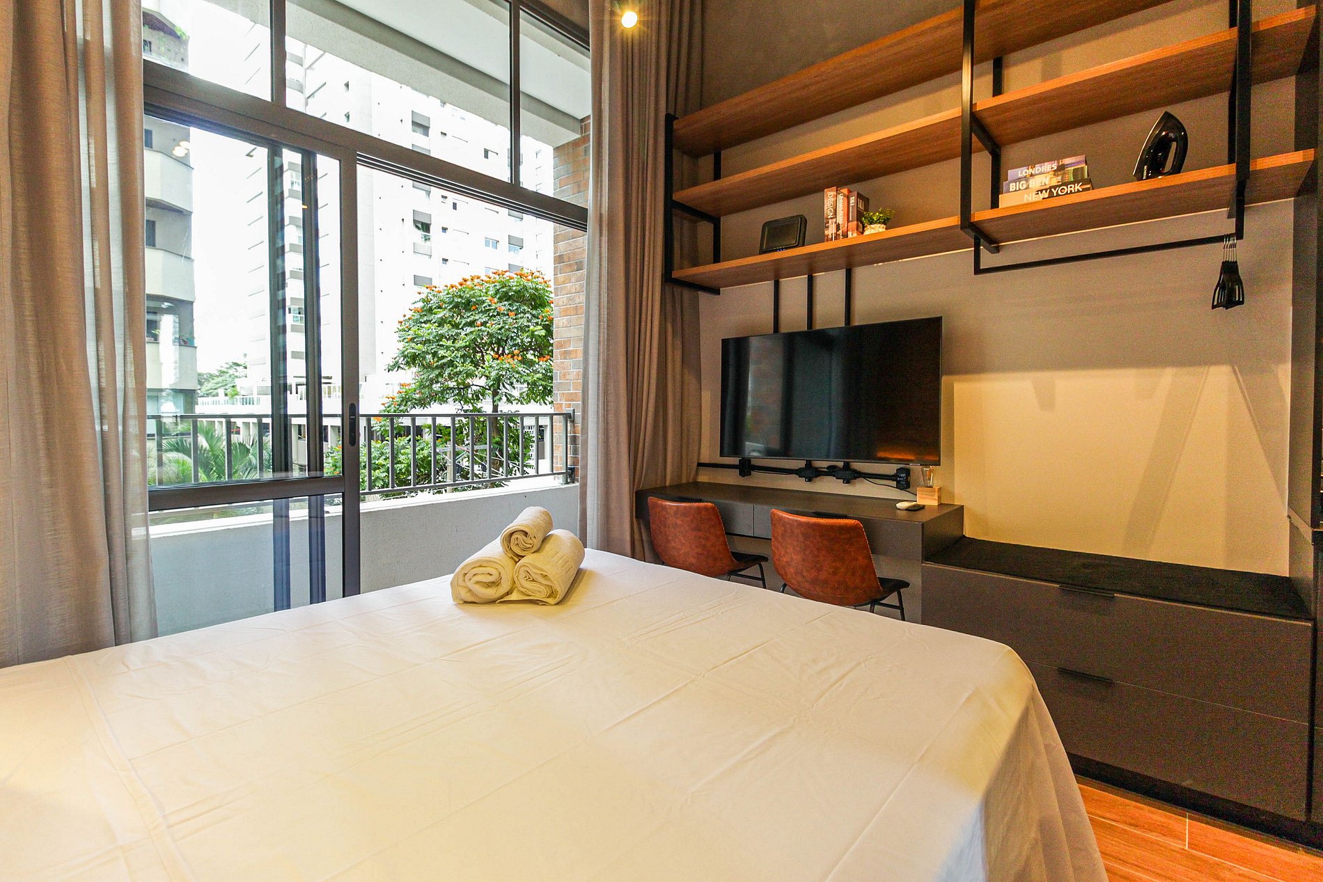 Decorado com enxoval de hotelaria, cama queen, geladeira e ar-condicionado, oferece conforto para até duas pessoas. O condomínio dispõe de lavanderia OMO, piscina, academia e coworking. A 500 metros da Estação Brooklin do Metrô, facilita o acesso à cidade. Próximo ao Shopping Morumbi e à Avenida Luís Carlos Berrini, está cercado por restaurantes renomados como o Vicolo Nostro e o Portucho. Hospitais de excelência, como o Sírio-Libanês, estão a uma curta distância.