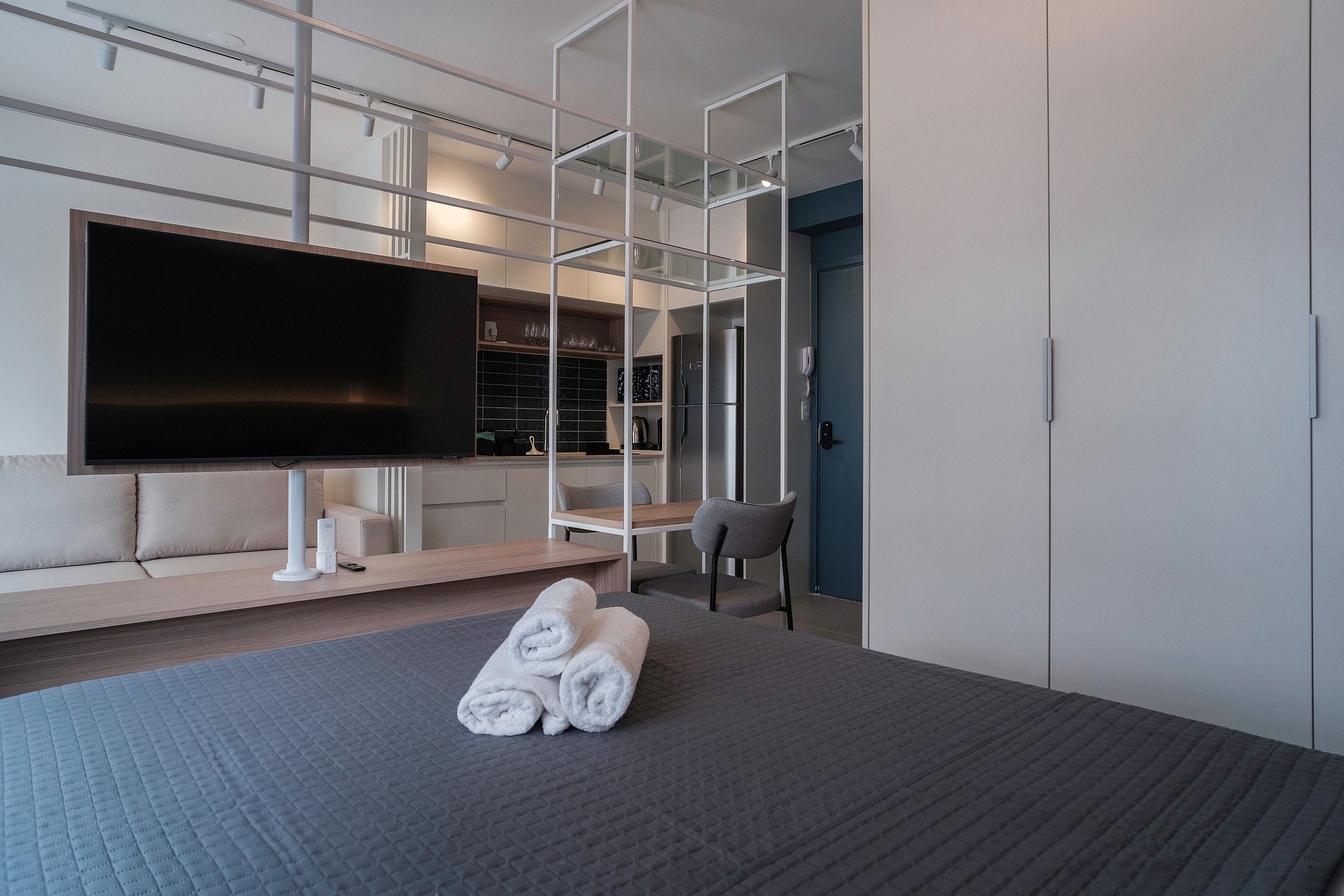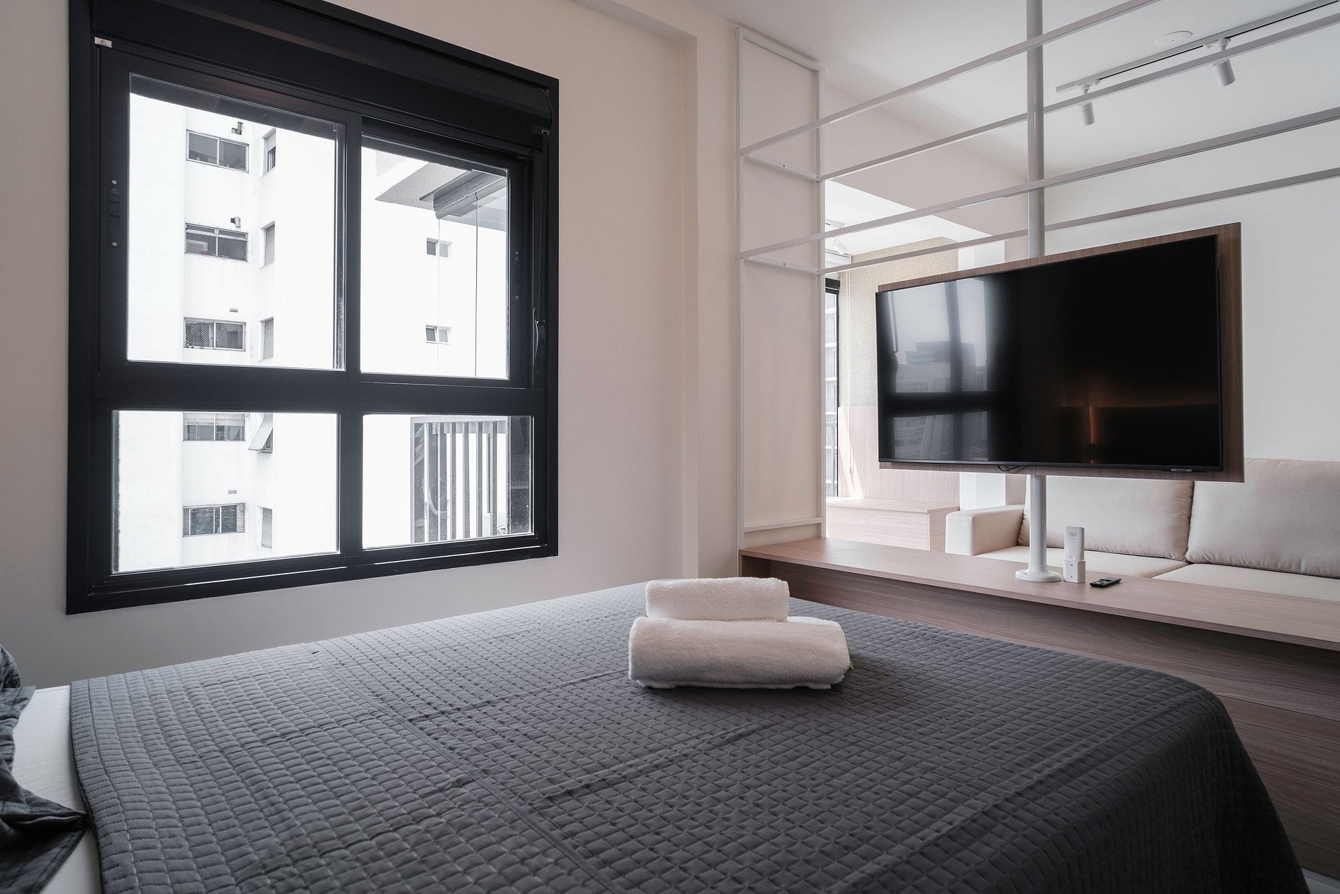 Amplo apartamento Studio, super arejado, mas que também conta com ar-condicionado dual split (Quente & Frio). Portaria 24h para a sua segurança, academia equipada, piscina externa e serviço de lavanderia OMO.