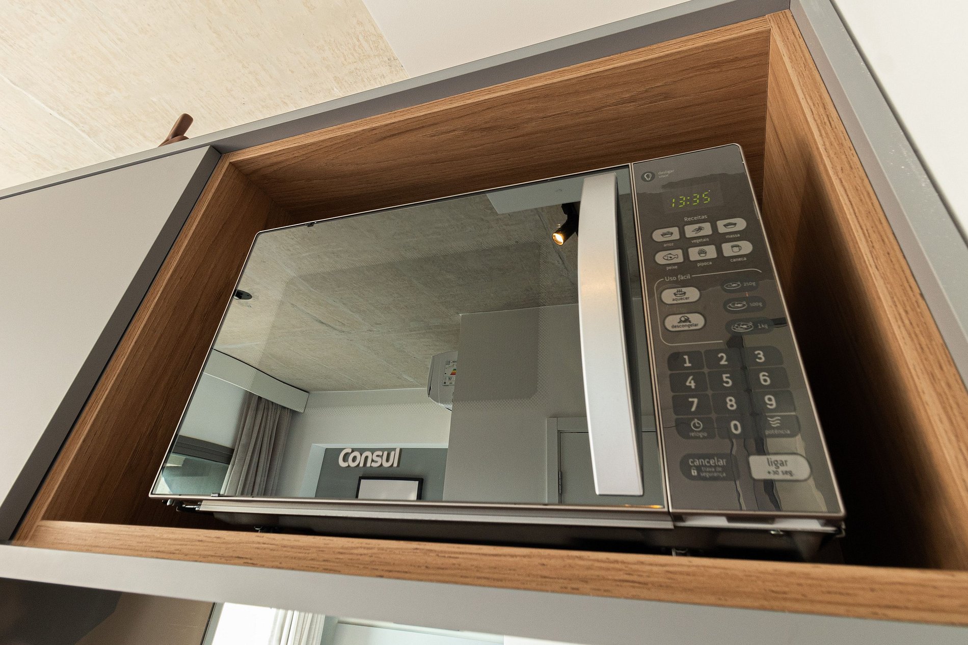 - Cozinha compacta equipada com geladeira, cooktop e micro-ondas