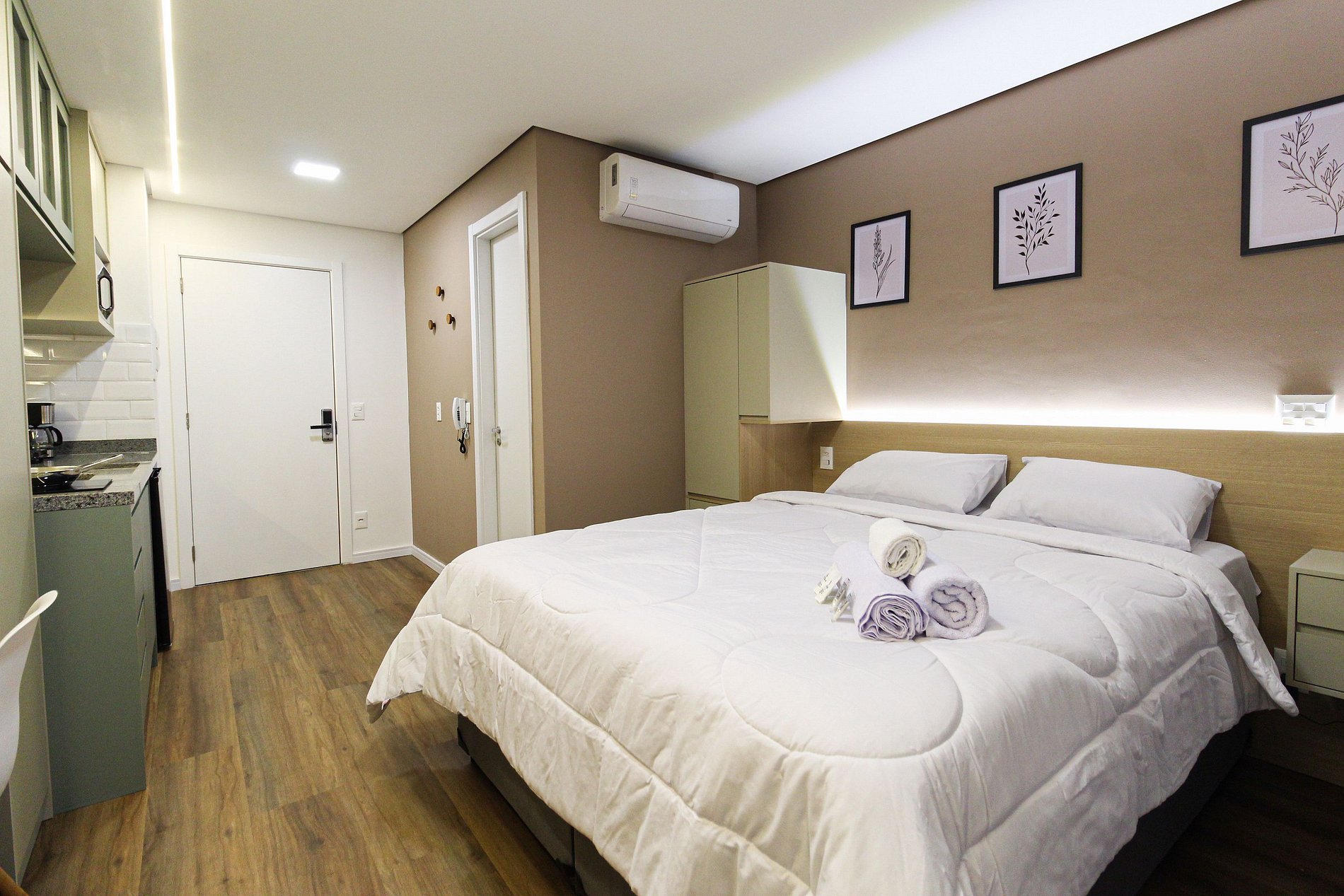 Este studio compacto e funcional é ideal para duas pessoas, oferecendo cama de casal, ar‑condicionado, varanda com vista para o bairro, cozinha equipada e banheiro privativo. O condomínio é completo: piscina adulto e infantil, academia moderna, lavanderia coletiva, churrasqueira, brinquedoteca, salão de festas, elevadores e portaria 24 horas.