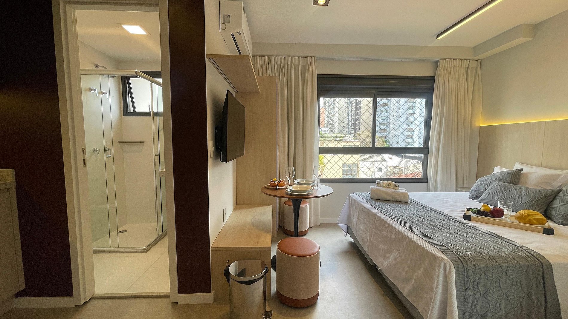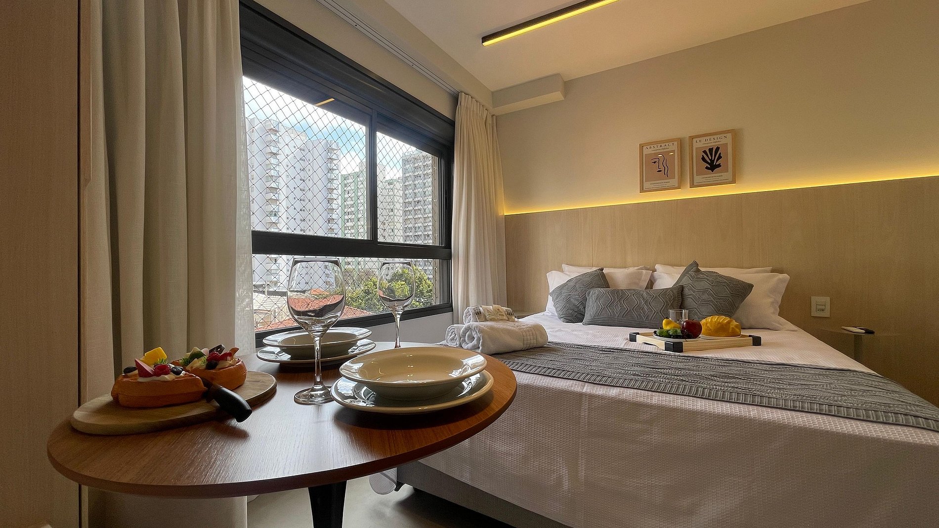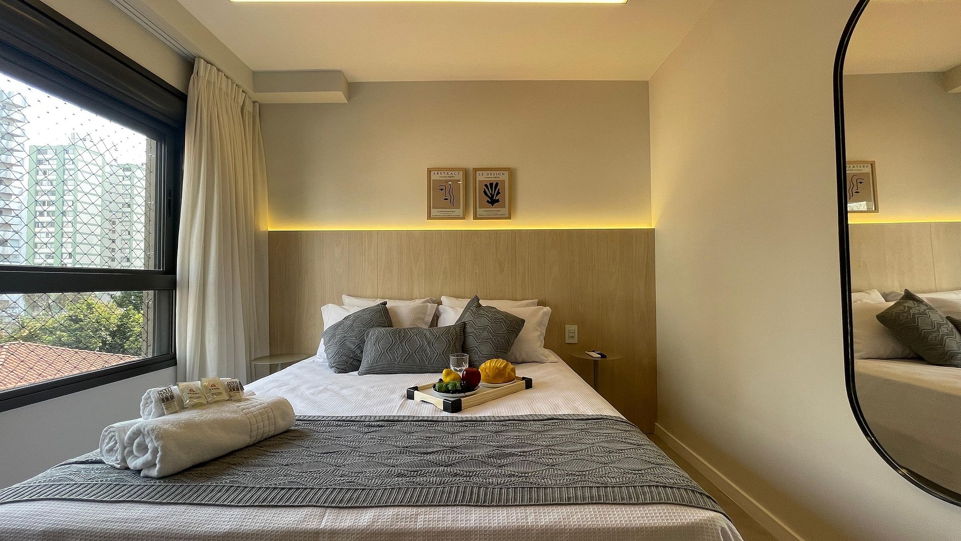 Studio elegante em Perdizes com cama queen, colchão de solteiro, ar-condicionado, enxoval de hotelaria, secador de cabelo, água filtrada e cafeteira. Cozinha equipada e condomínio com academia. Localização estratégica entre a PUC-SP e o metrô Sumaré, a poucos minutos do Allianz Parque, Shopping Bourbon e excelentes cafés e restaurantes. Ideal para quem busca conforto, praticidade e conveniência em São Paulo.
