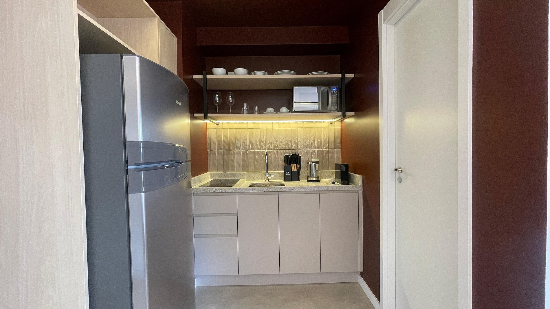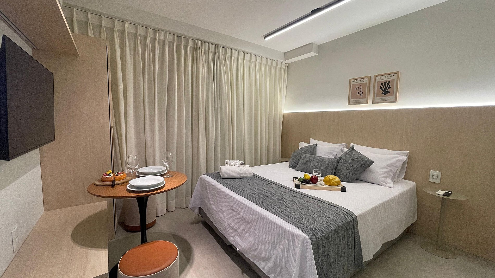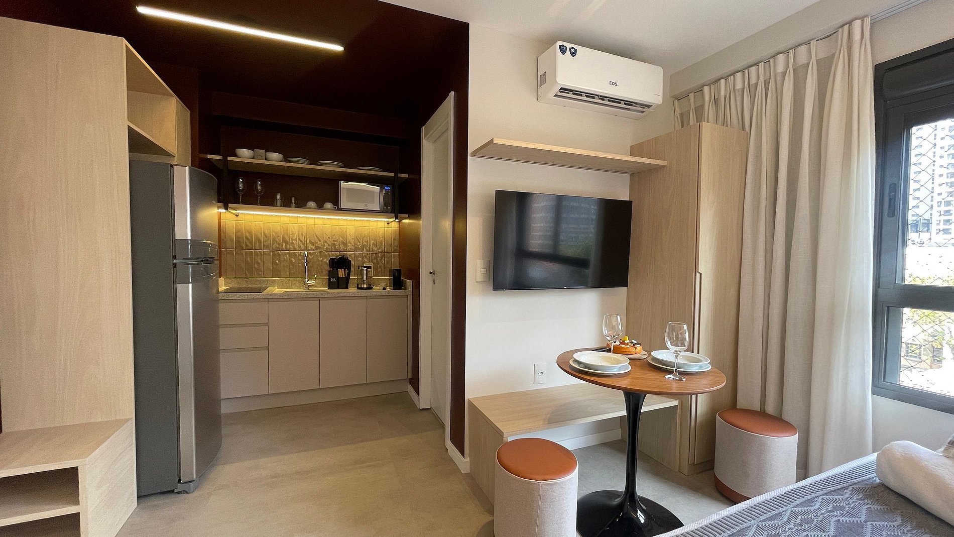 Studio elegante em Perdizes com cama queen, colchão de solteiro, ar-condicionado, enxoval de hotelaria, secador de cabelo, água filtrada e cafeteira. Cozinha equipada e condomínio com academia. Localização estratégica entre a PUC-SP e o metrô Sumaré, a poucos minutos do Allianz Parque, Shopping Bourbon e excelentes cafés e restaurantes. Ideal para quem busca conforto, praticidade e conveniência em São Paulo.