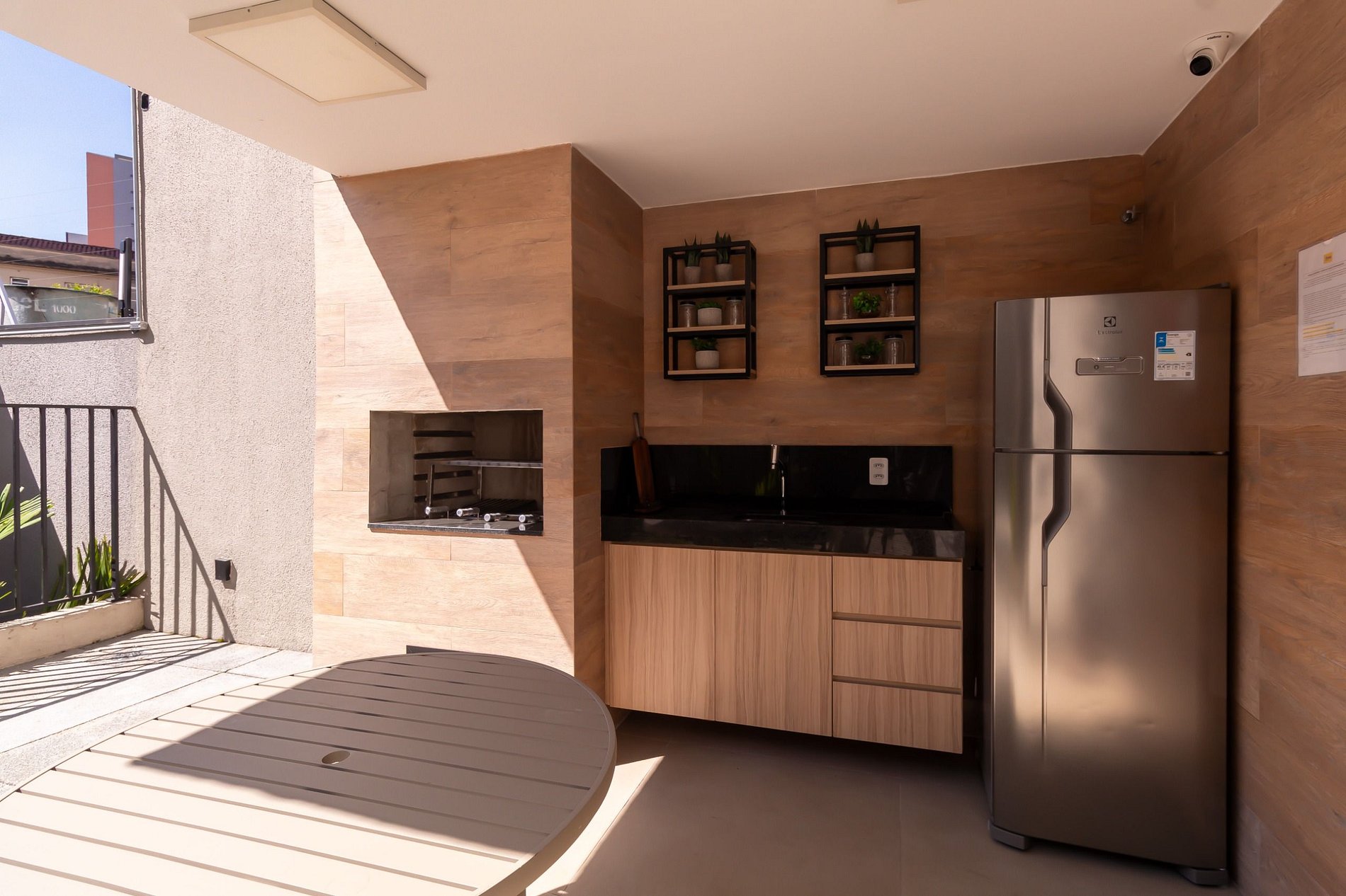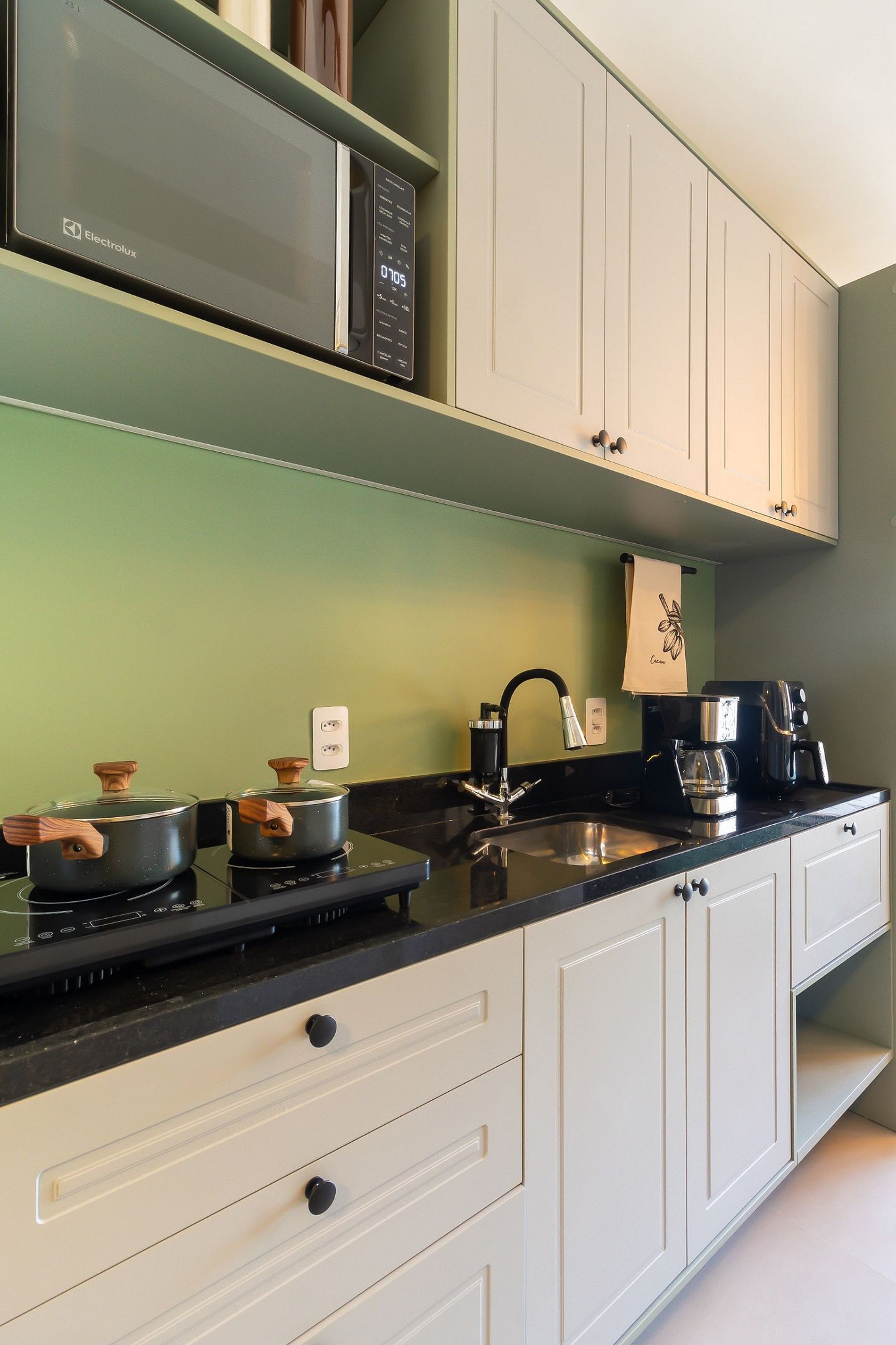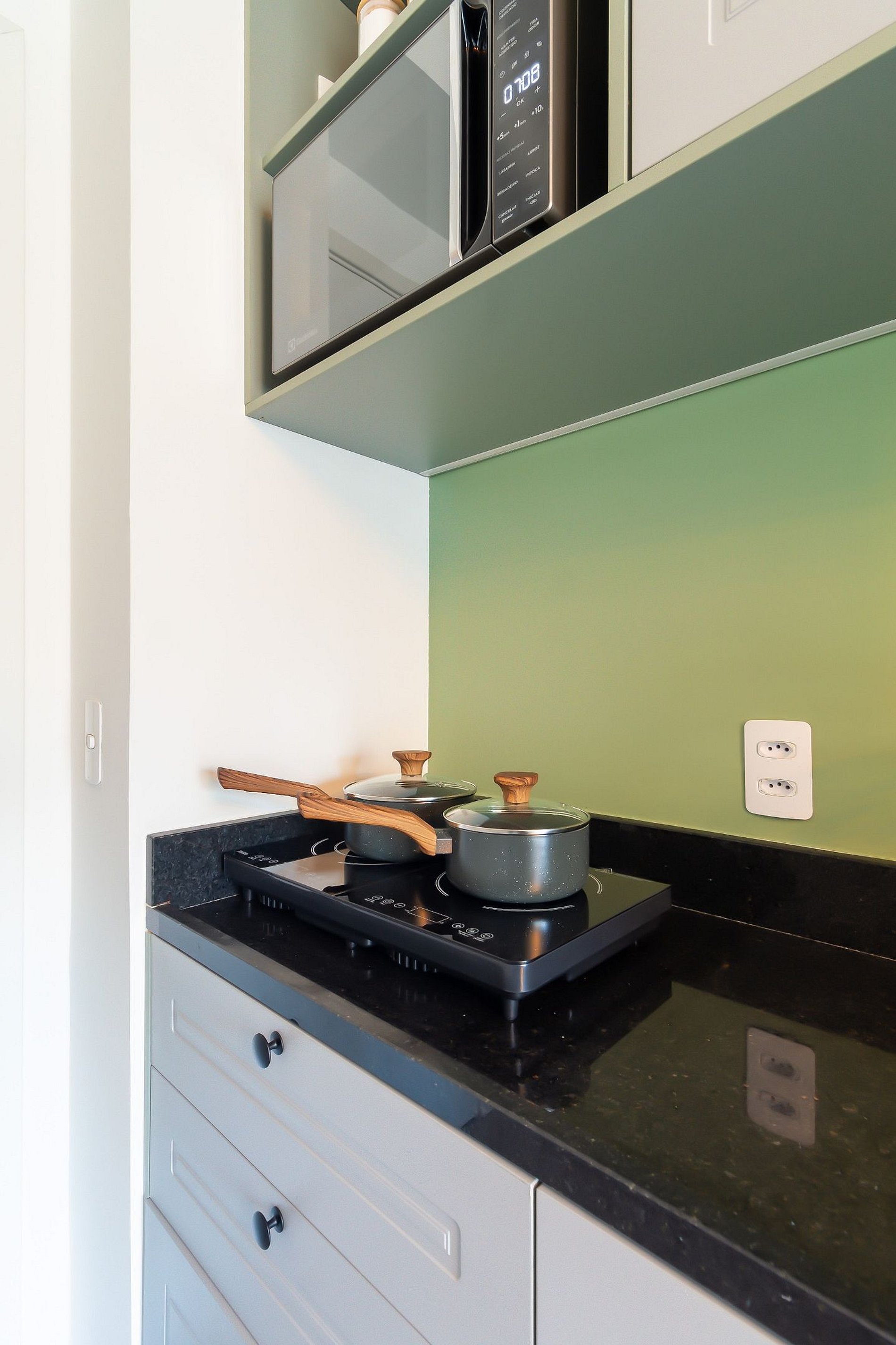 • Cozinha equipada com cooktop, micro-ondas, cafeteira, mixer e air fryer