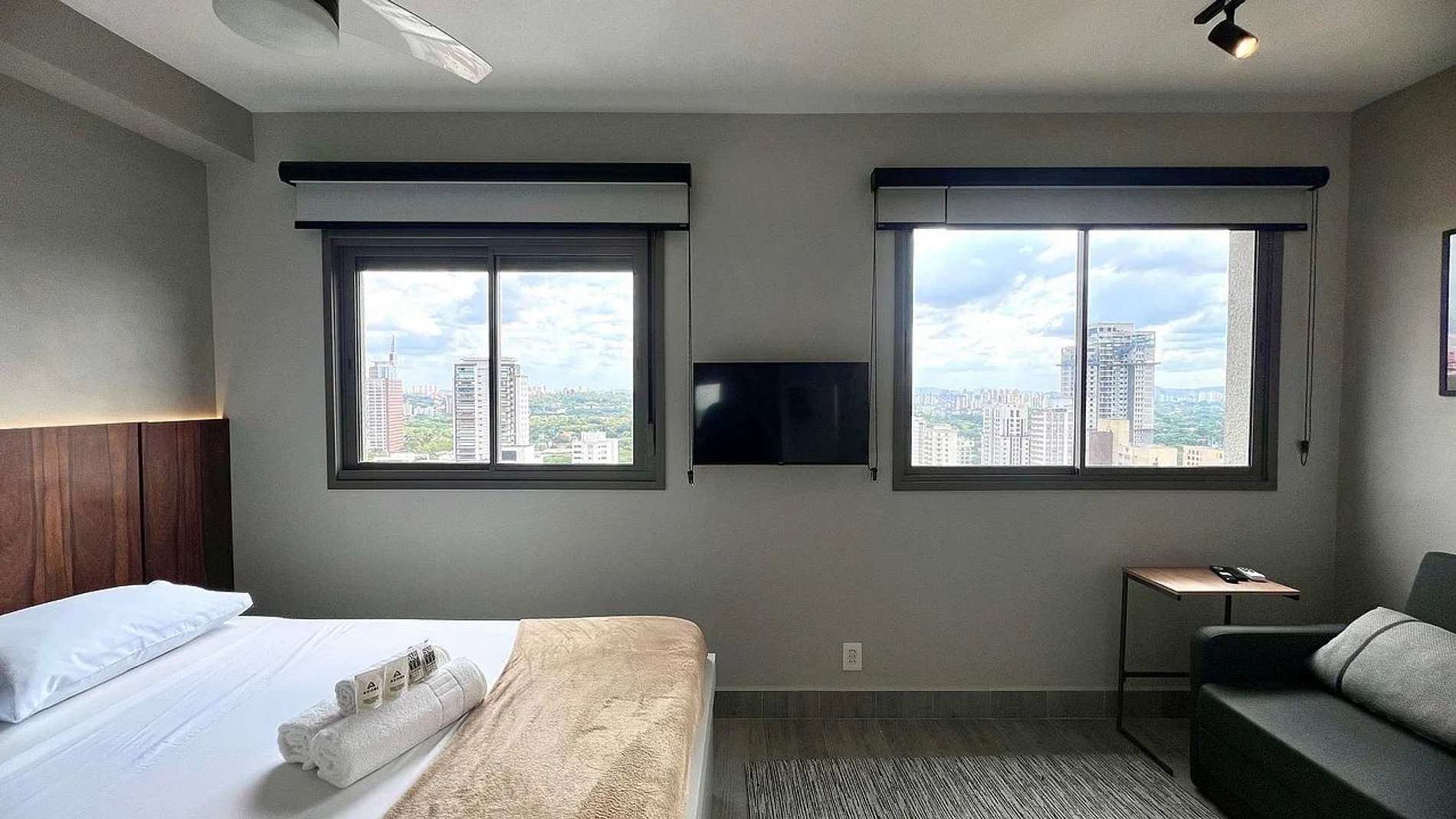 Um lindo Studio, situado no 22 º andar, com uma vista deslumbrante da cidade de São Paulo, todo reformado, localizado a 5 minutos a pé da estação de Metrô Faria Lima, com fácil acesso a diversos bares e restaurantes renomados da cidade.