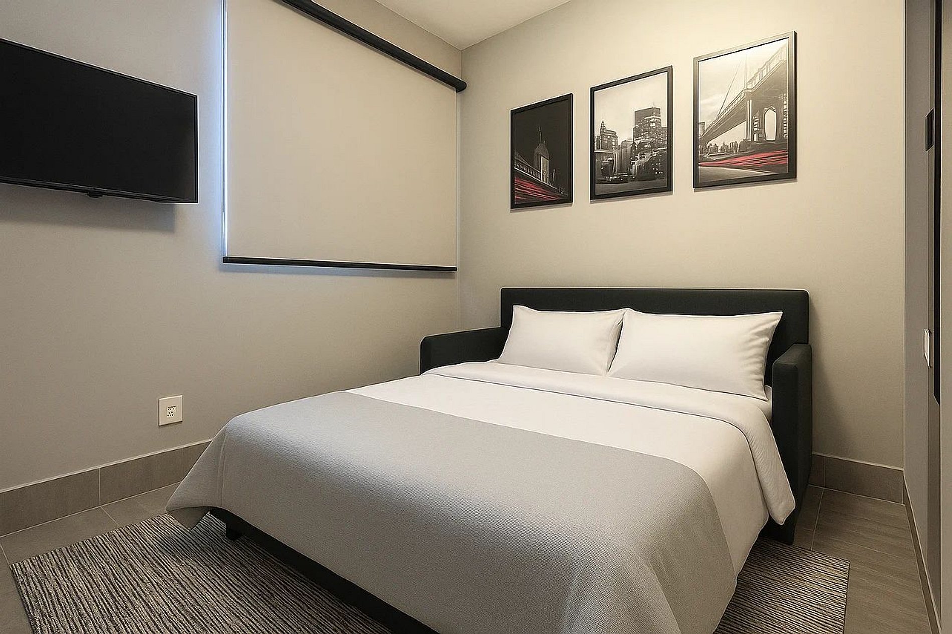 - Sofá-cama que recebe até duas pessoas confortavelmente.