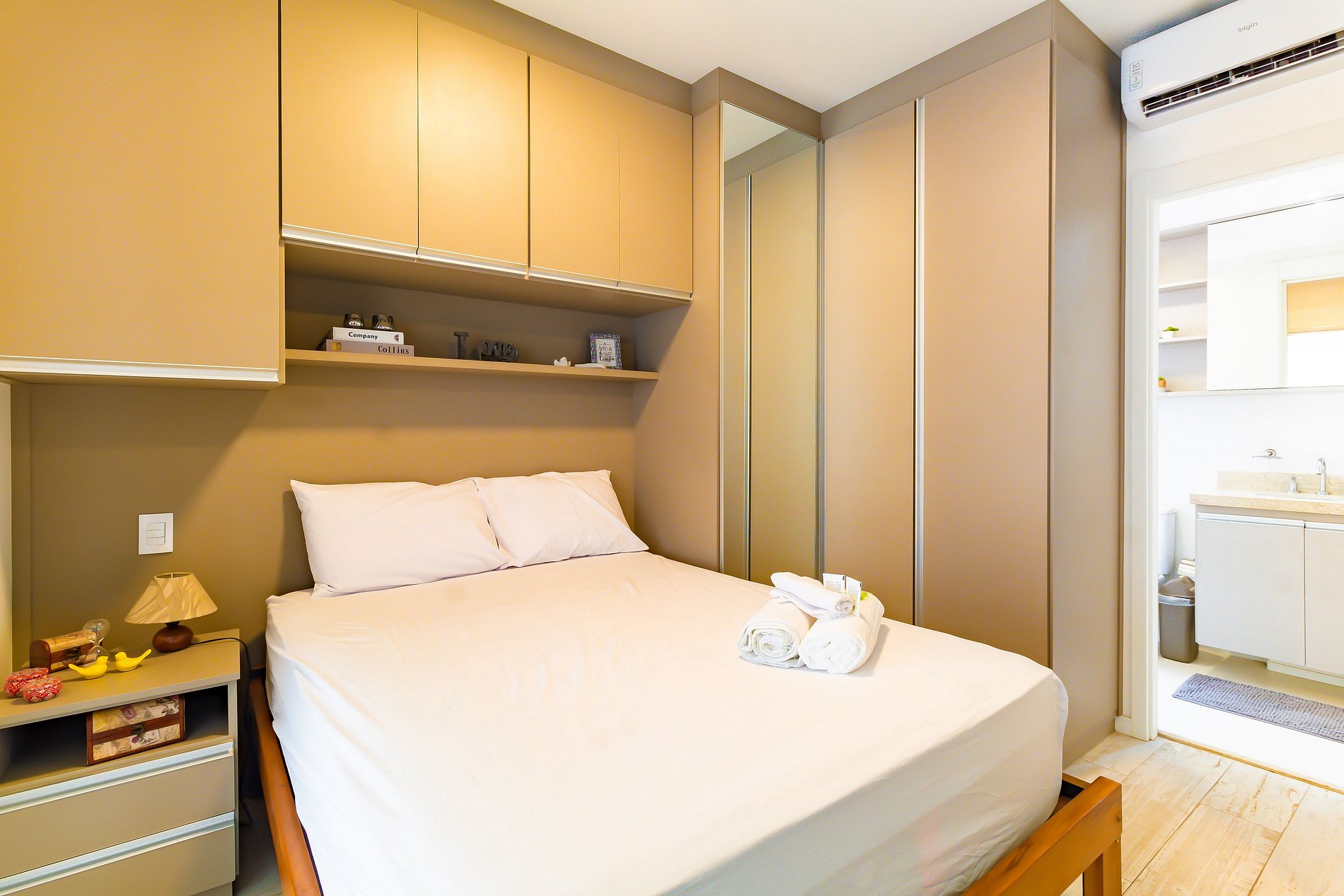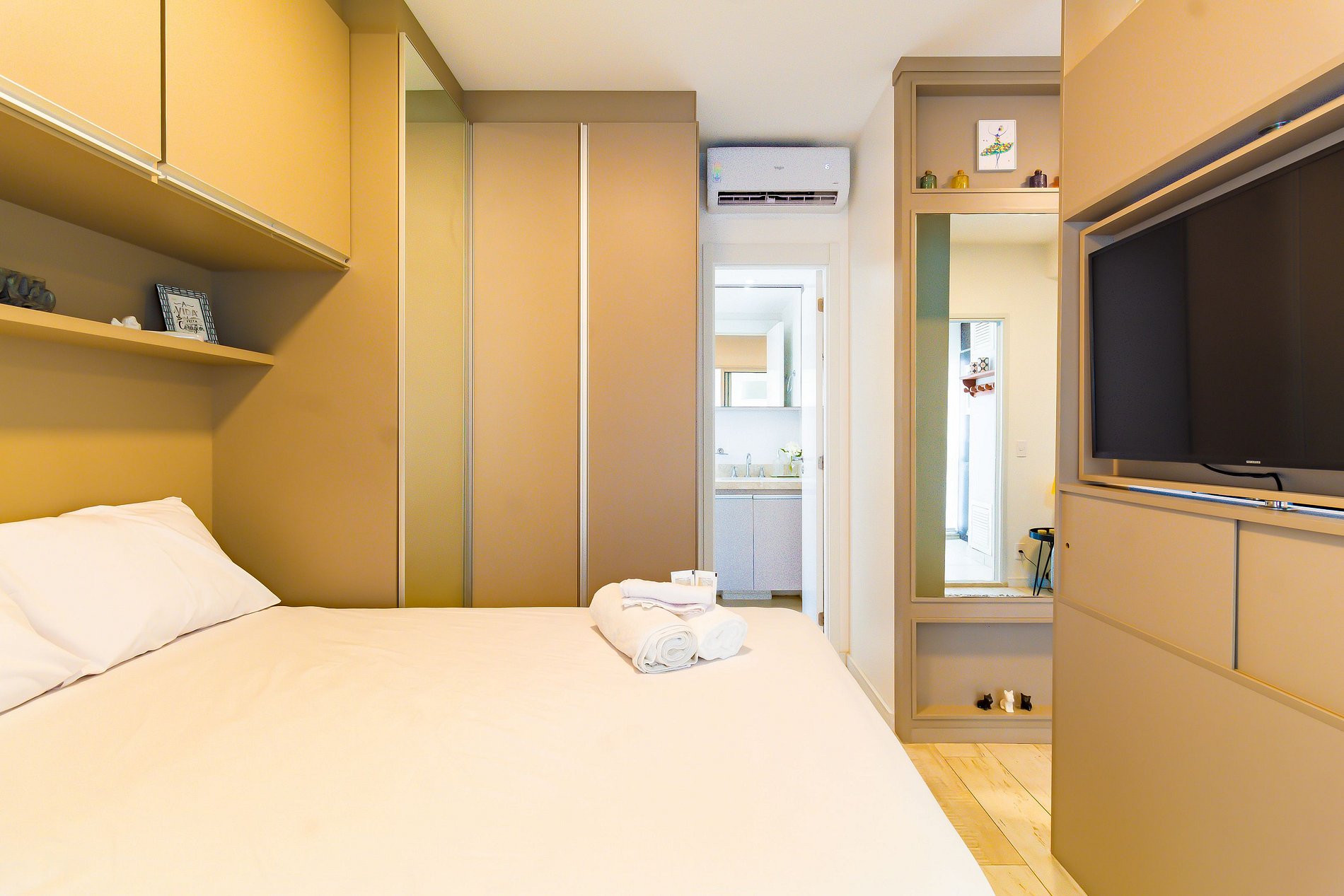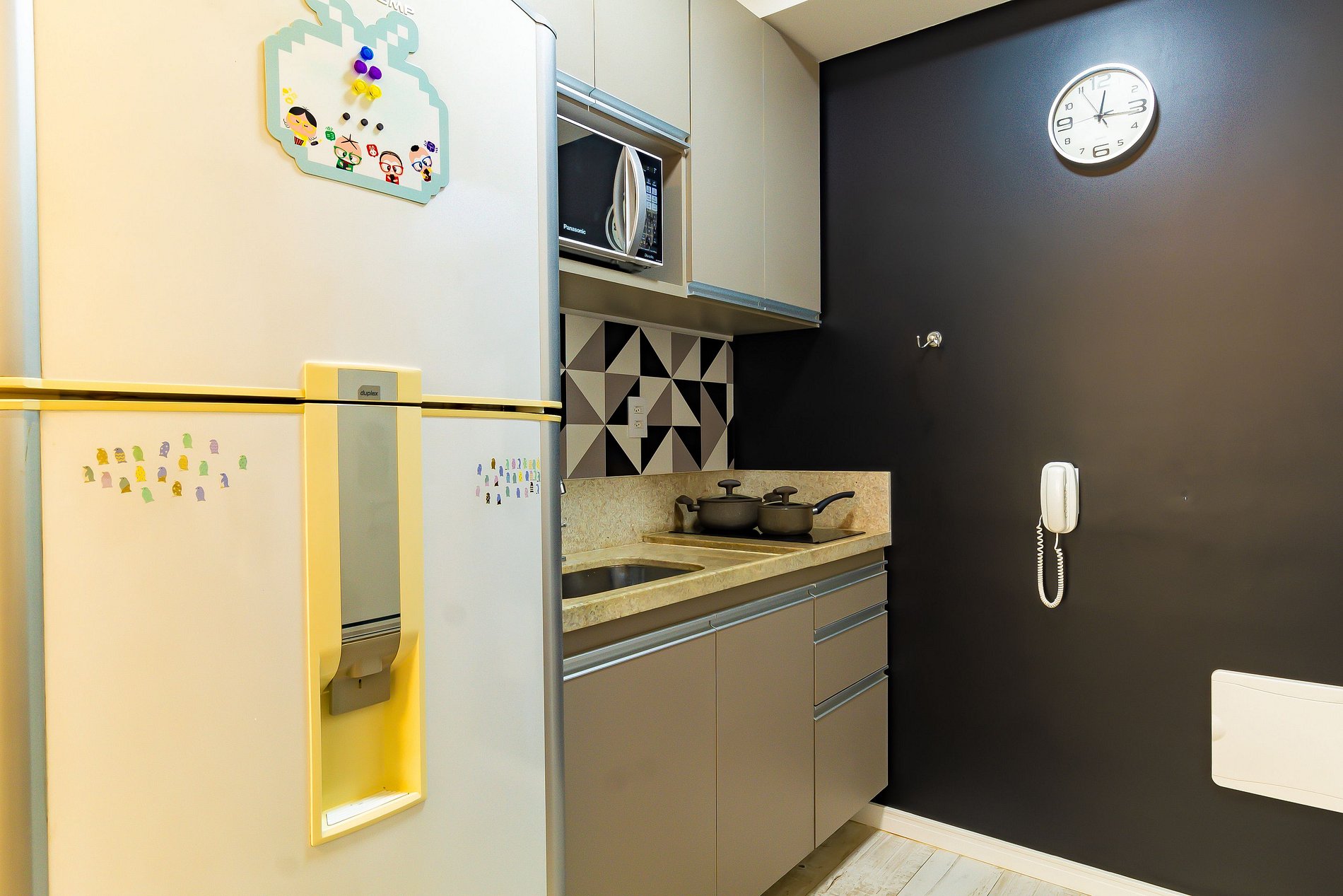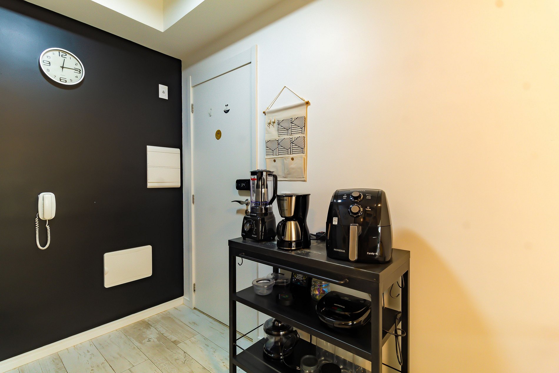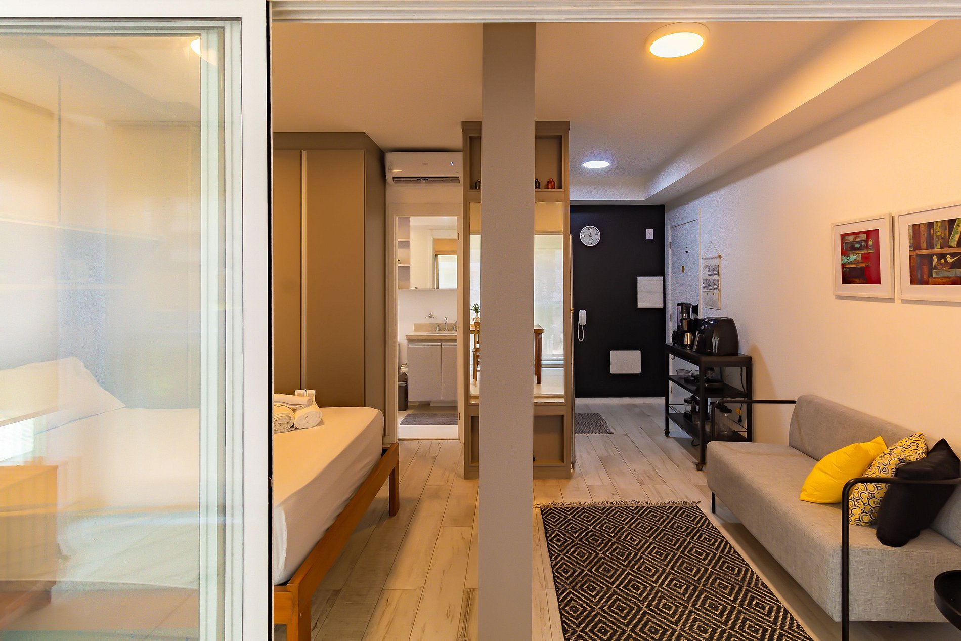 O espaço conta com ar-condicionado, cozinha compacta com itens básicos para preparo de refeições e uma charmosa varanda, ideal para relaxar após um dia na cidade. Um ambiente funcional e acolhedor, pensado para estadias a lazer ou a trabalho.