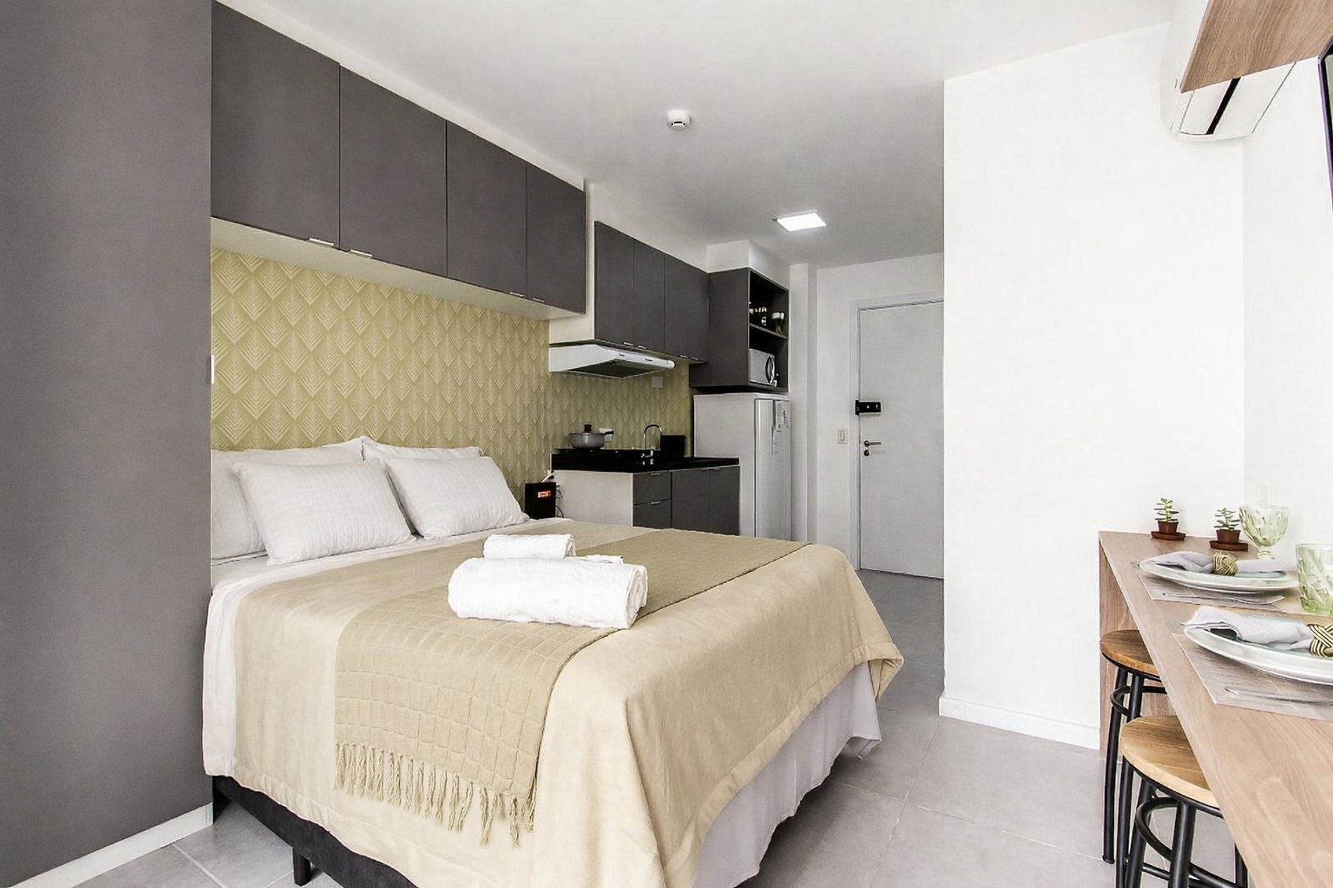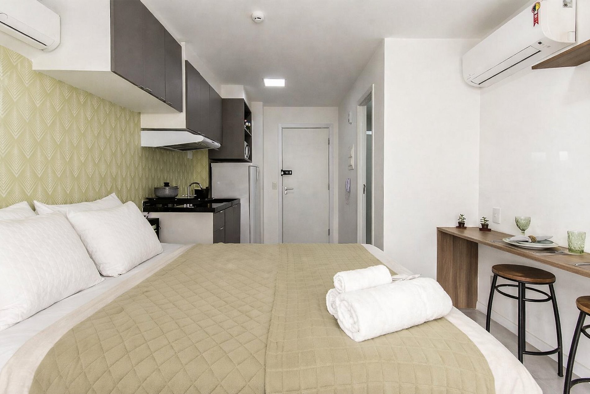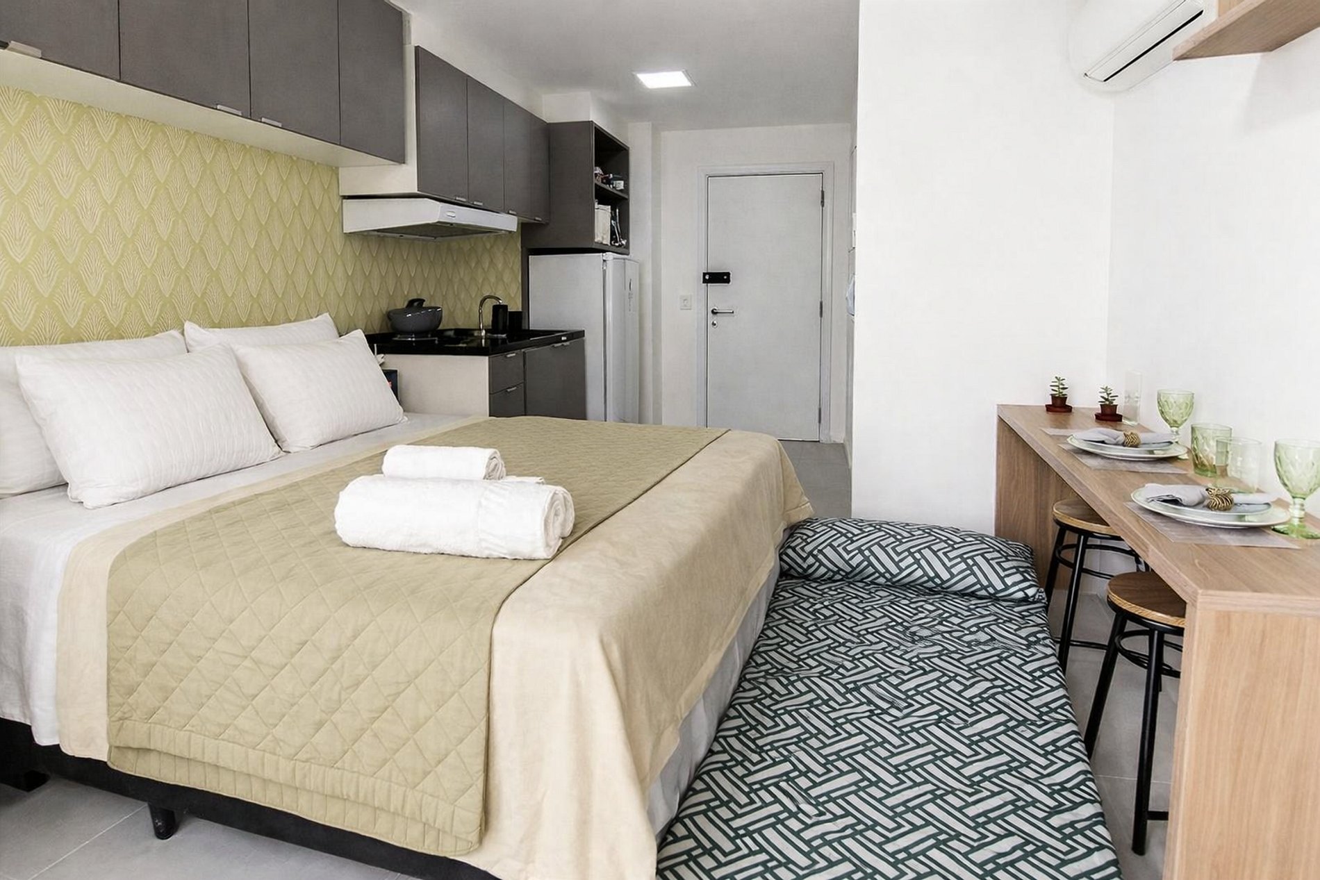 Apartamento confortável e bem localizado no Tatuapé, ideal para até três hóspedes. O espaço foi pensado para proporcionar praticidade e conforto durante a estadia, com cama de casal, colchão de solteiro, ar-condicionado, cozinha compacta equipada para preparo de refeições e máquina de lavar, ideal para estadias prolongadas.
