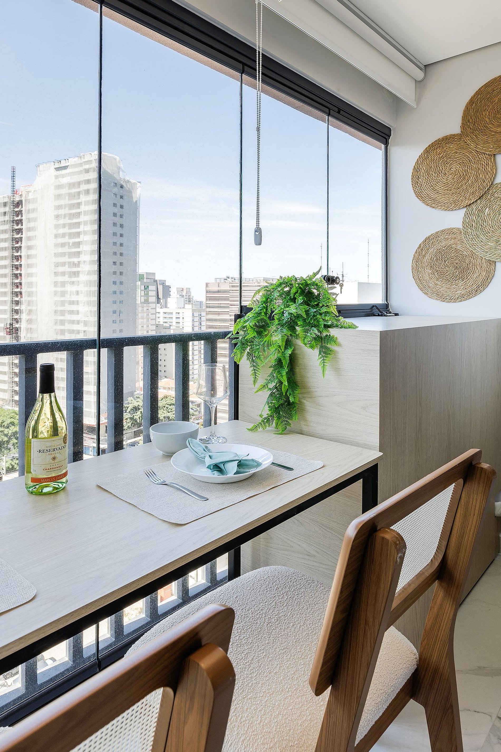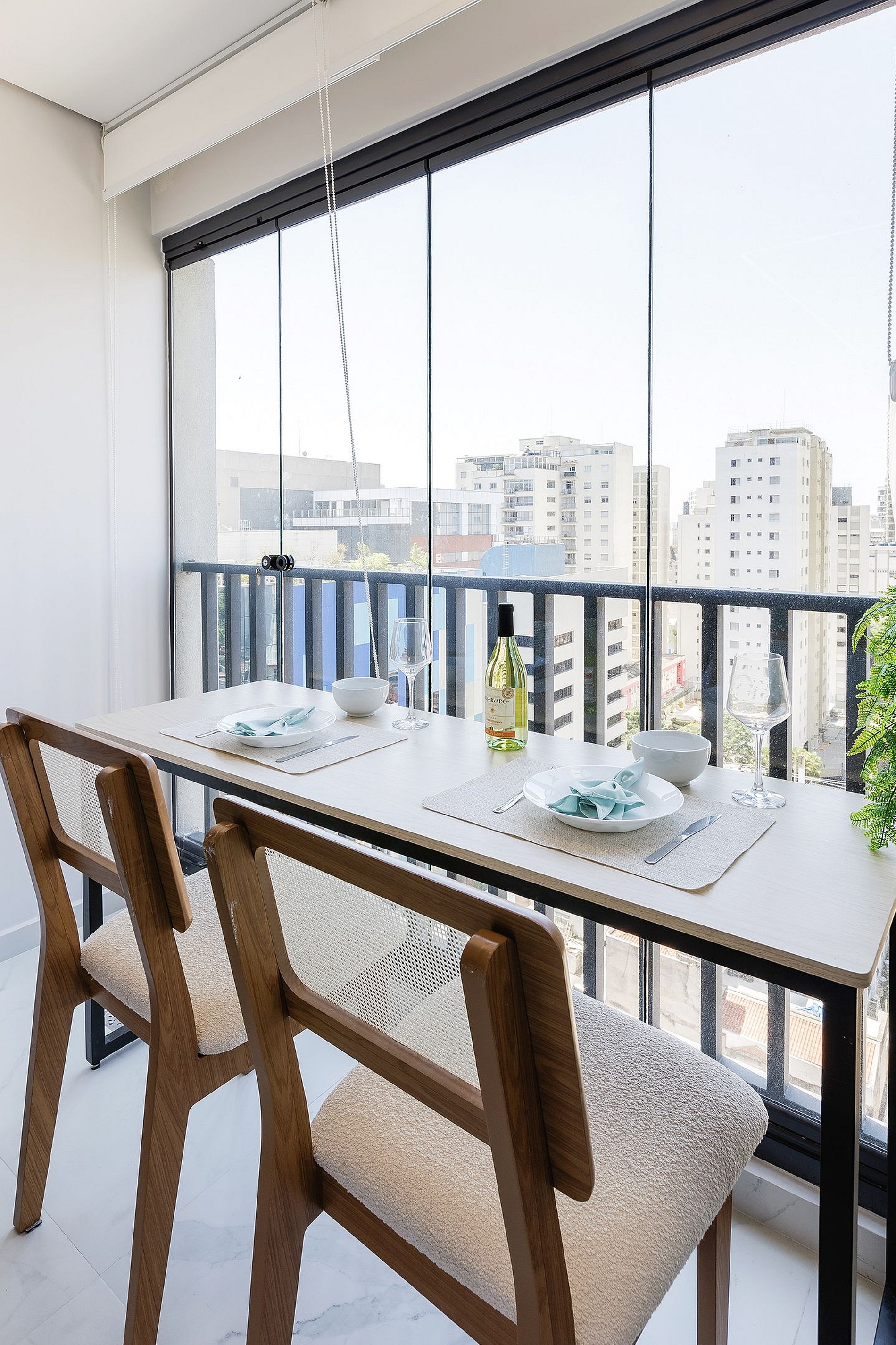 Sacada: Desfrute de uma linda vista para a cidade de São Paulo em um ambiente silencioso, perfeito para relaxar e apreciar uma taça de vinho.