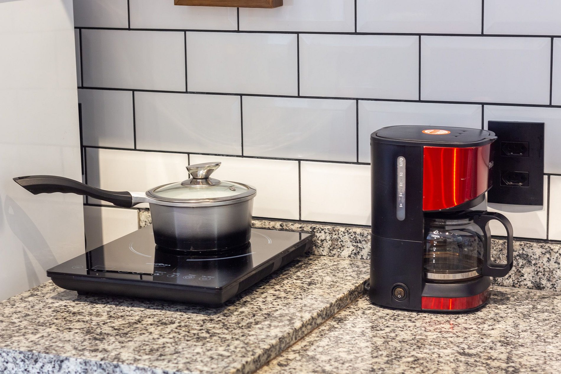 Cozinha completa: Fogão de indução, máquina de café e todos os utensílios para suas refeições.