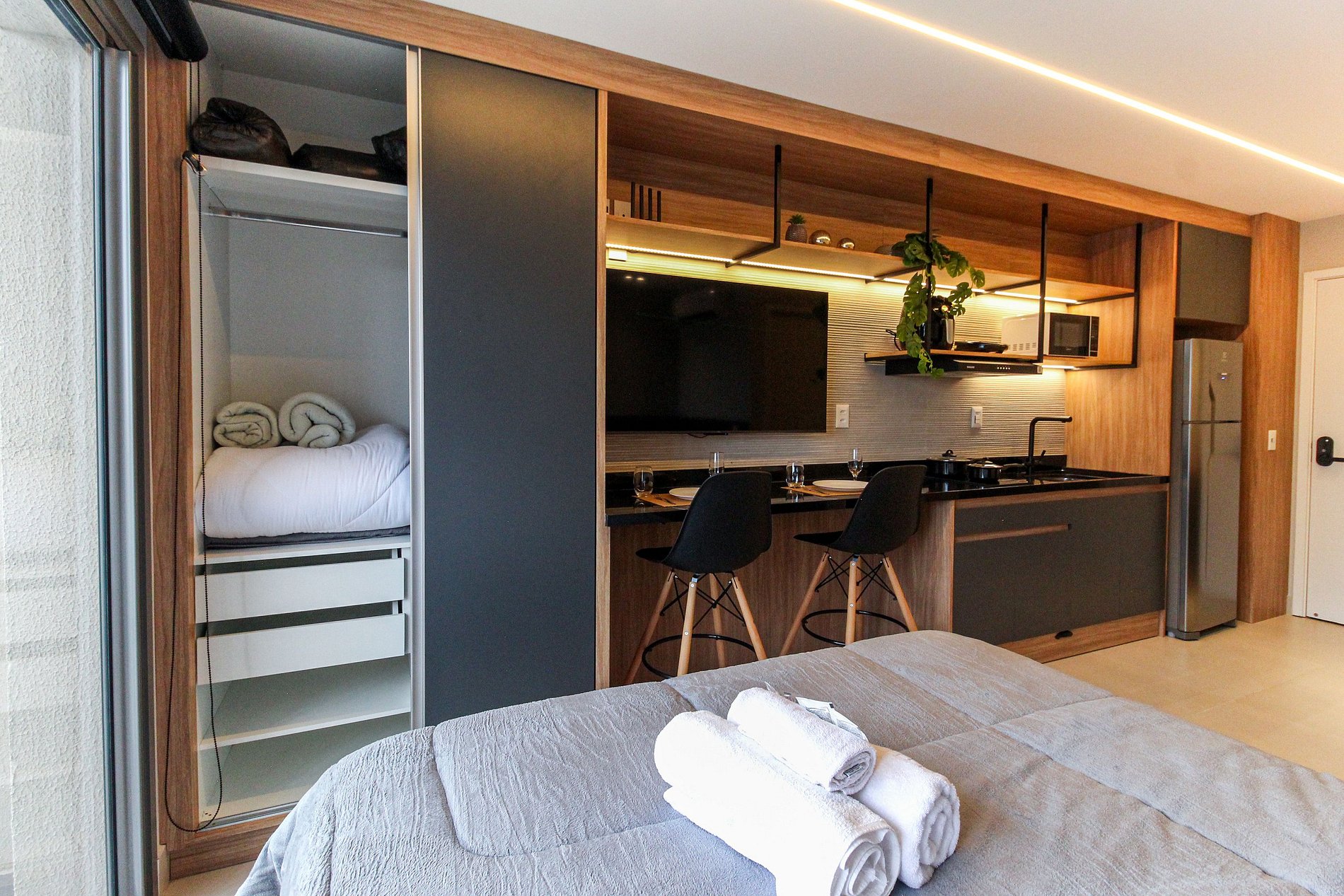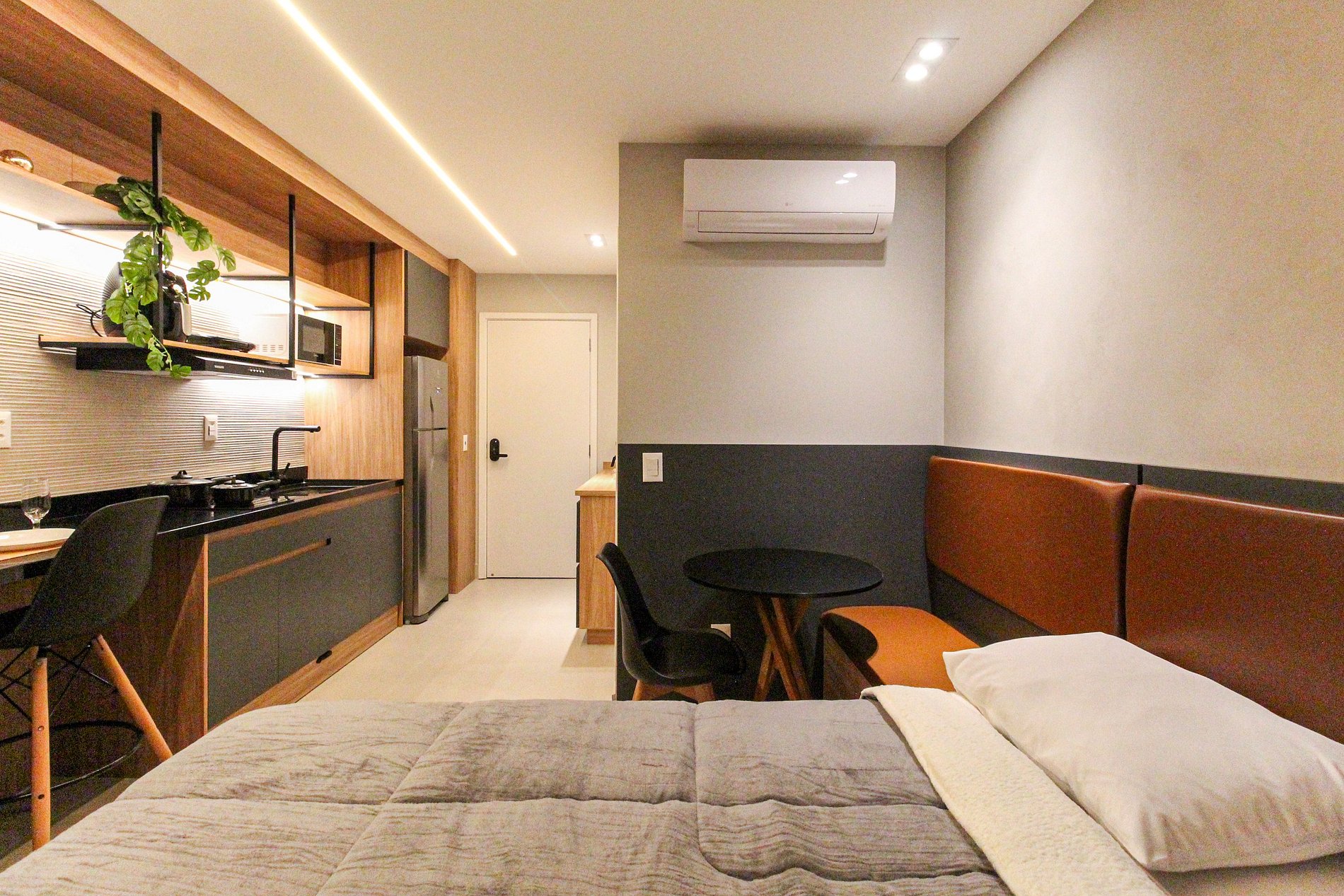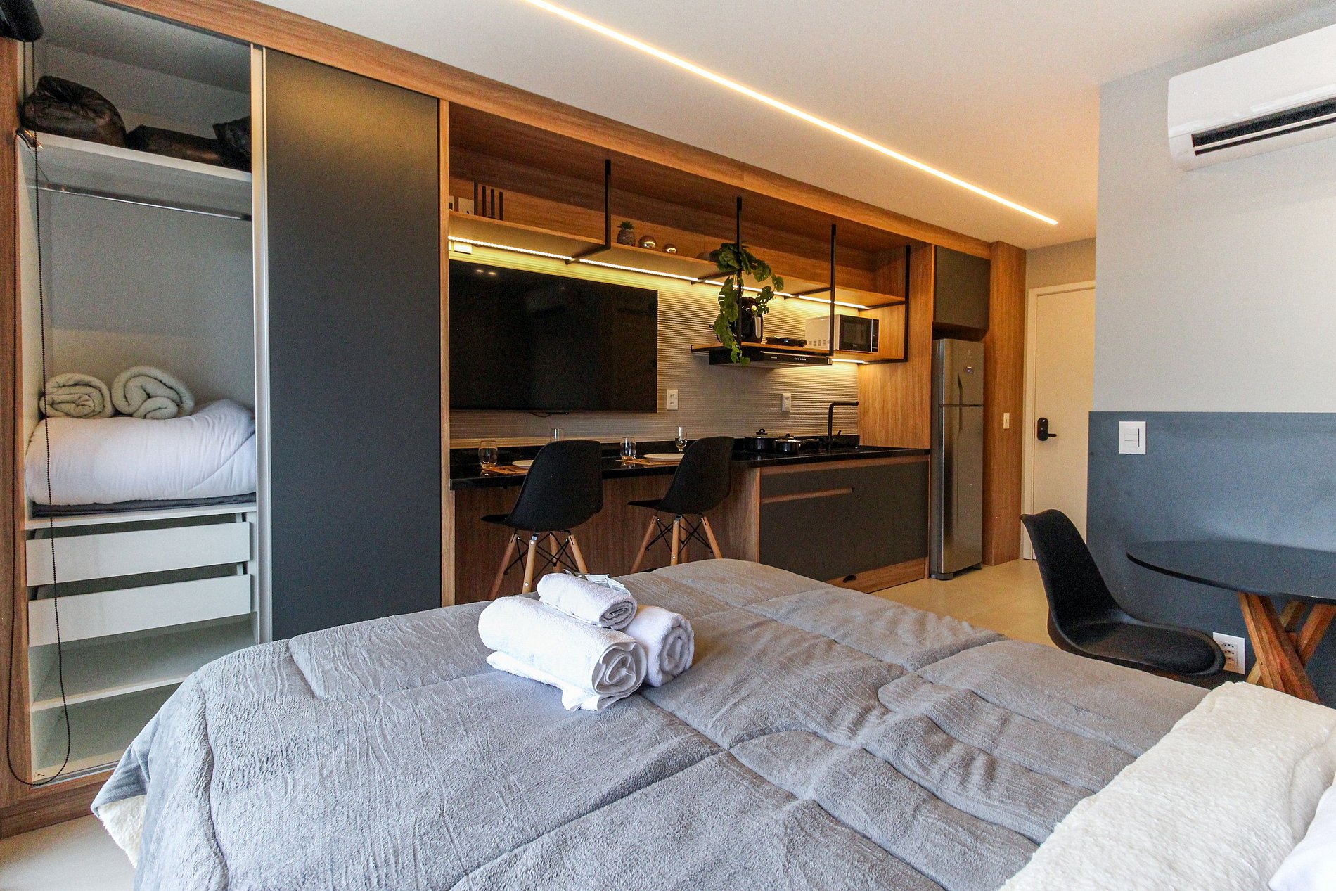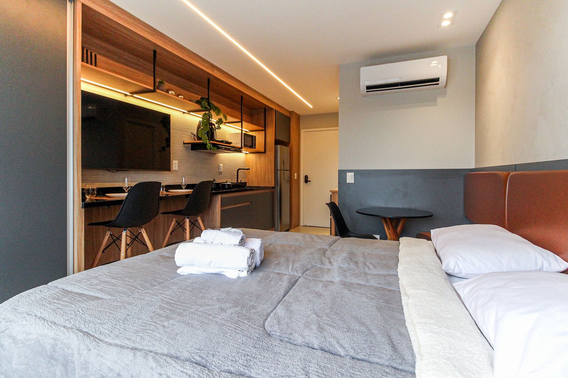 As comodidades no apto incluem: Fechadura digital, cozinha completa, eletrodomésticos essenciais, Smart TV de 4K, ar-condicionado dual split (Frio/Quente), internet de alta velocidade e enxoval completo.