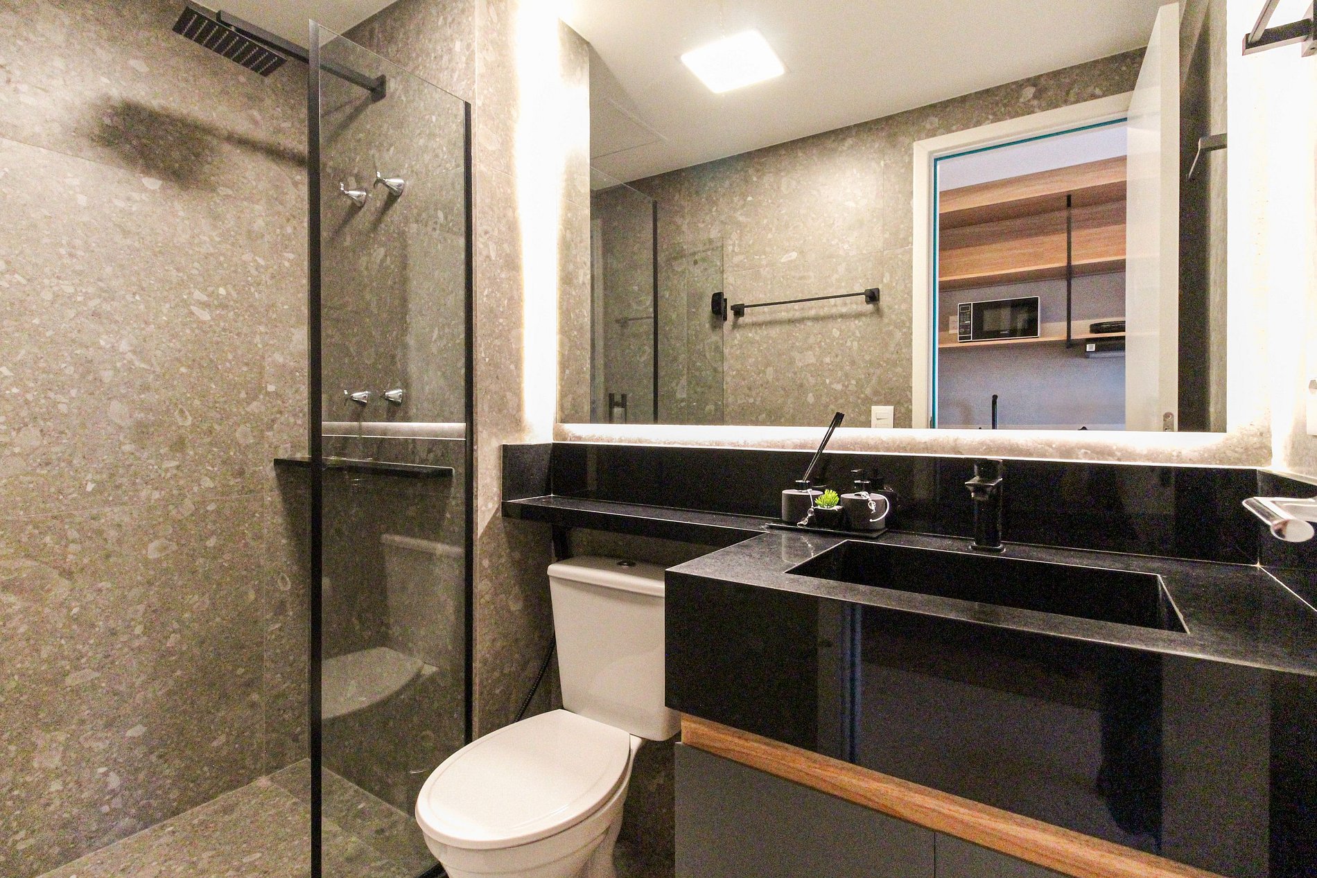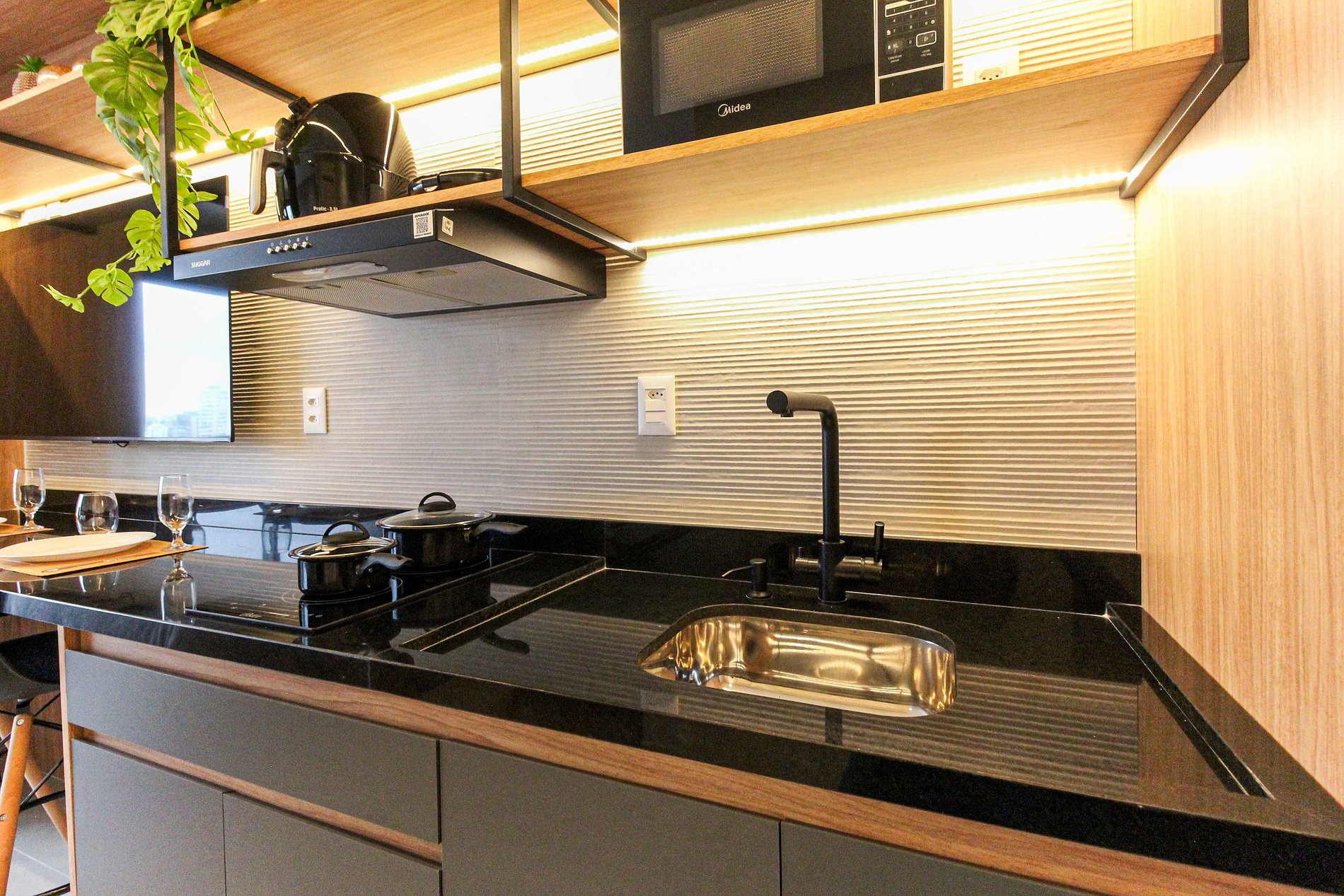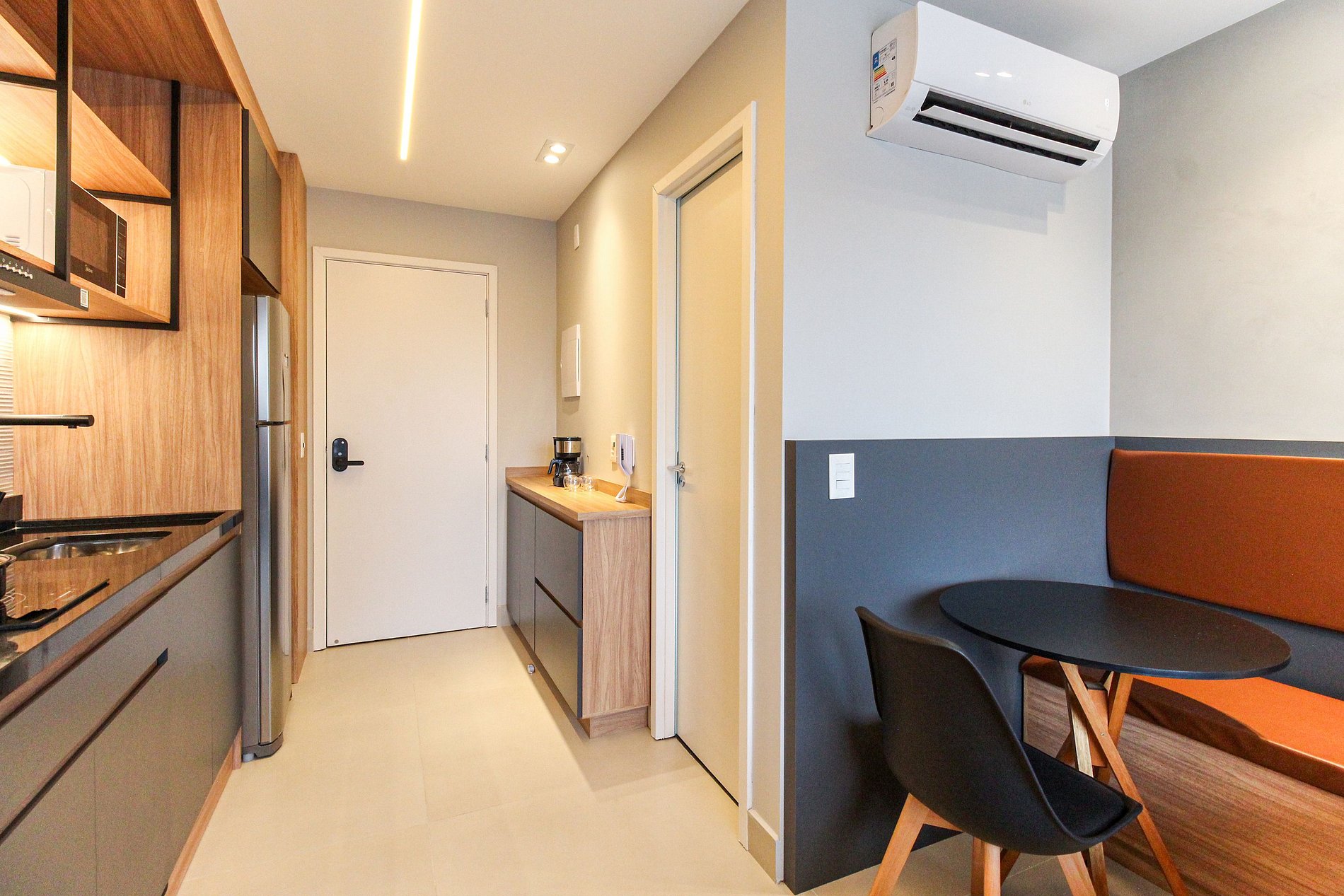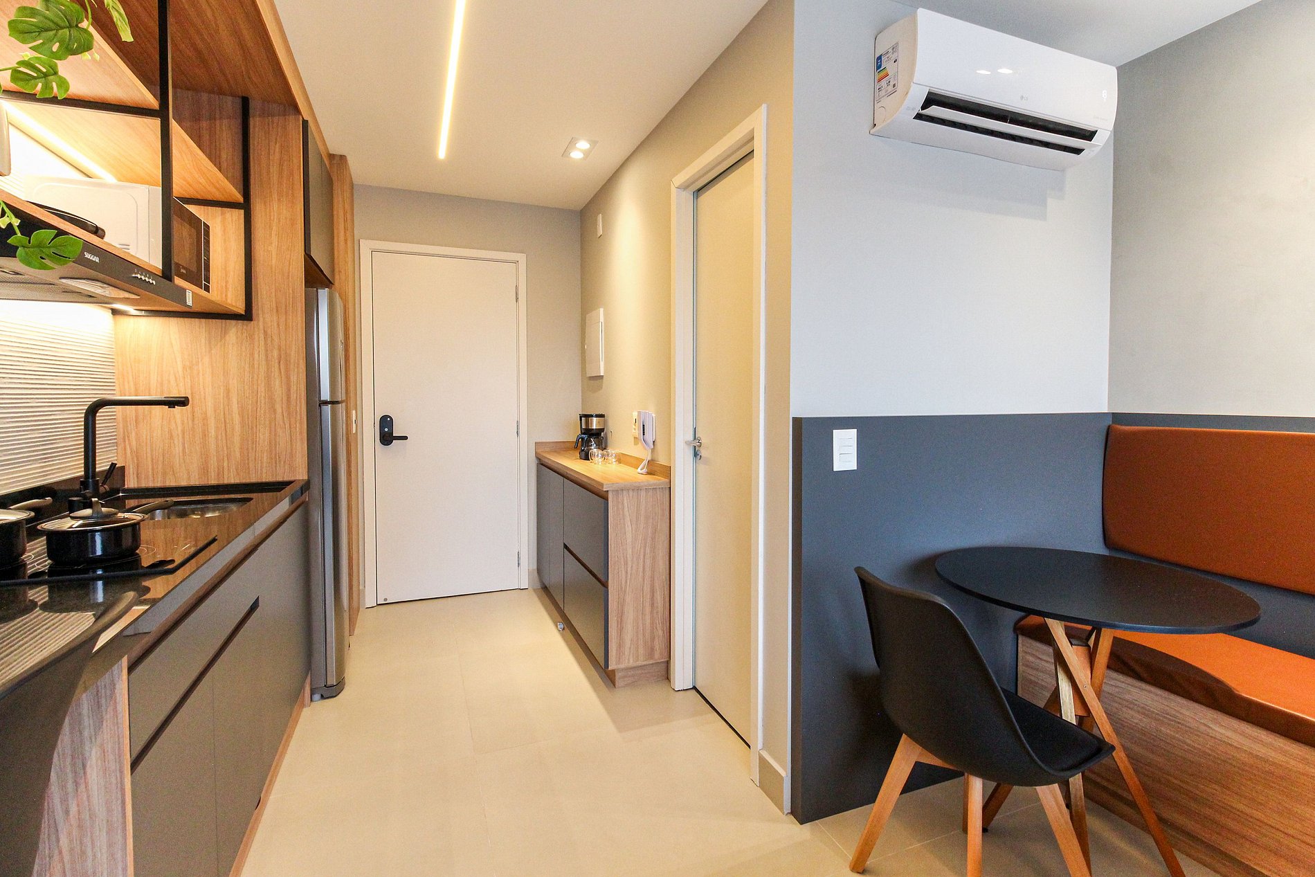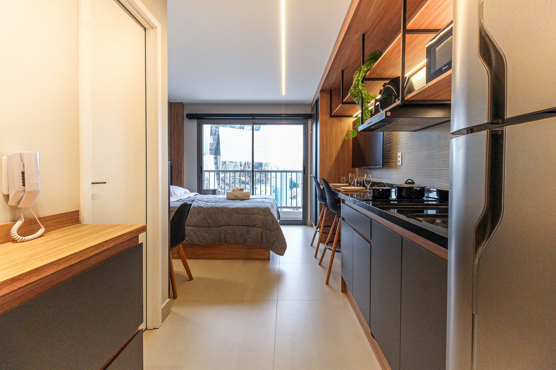 As comodidades no apto incluem: Fechadura digital, cozinha completa, eletrodomésticos essenciais, Smart TV de 4K, ar-condicionado dual split (Frio/Quente), internet de alta velocidade e enxoval completo.