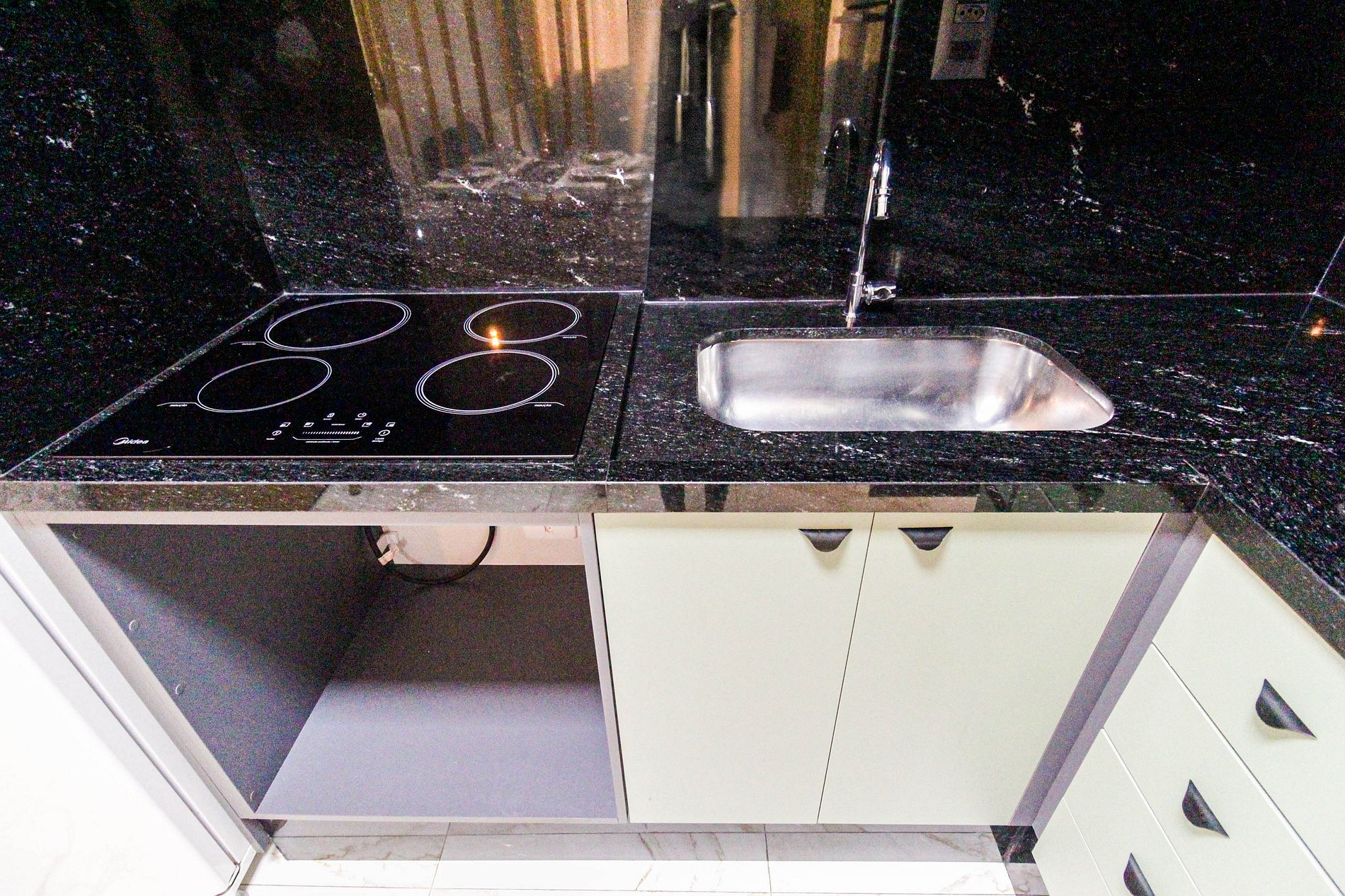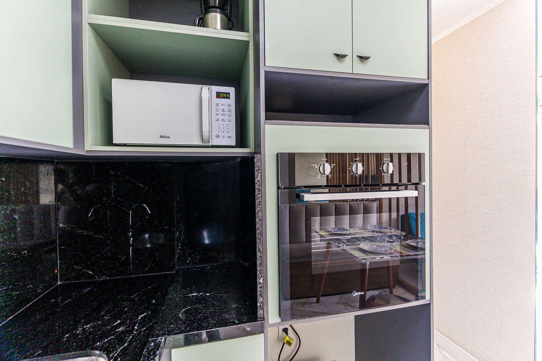 - Cozinha equipada com utensílios, geladeira, fogão e micro-ondas.