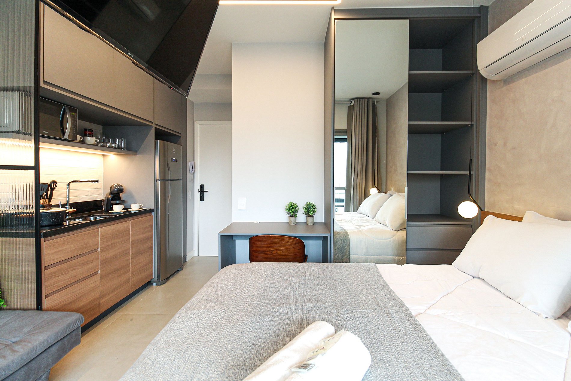 Este studio está localizado no condomínio Wonder Brooklin, na Rua das Margaridas, 308, no bairro Brooklin, São Paulo. A unidade acomoda até 4 pessoas, oferecendo cama de casal, sofá-cama, ar-condicionado, varanda privativa, Wi-Fi e enxoval de hotelaria.