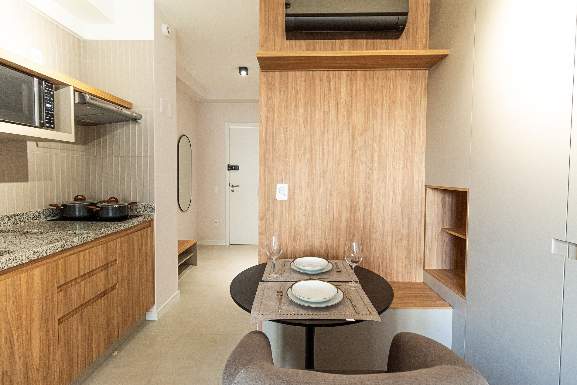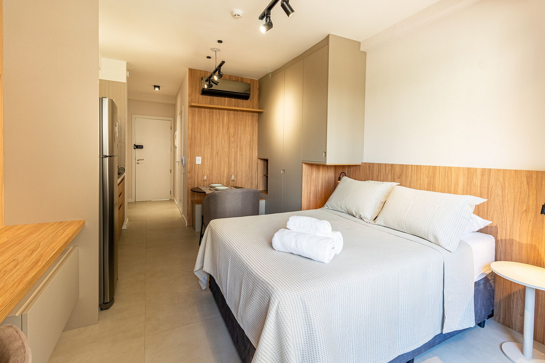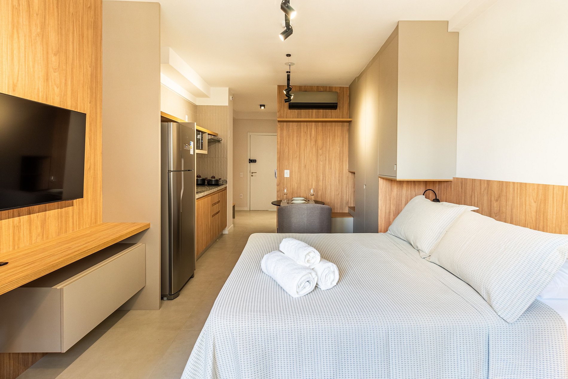 Studio moderno na Vila Nova Conceição, ao lado do Parque Ibirapuera. Ideal para duas pessoas, oferece ar-condicionado, armários espaçosos, enxoval de hotelaria, mesa de jantar e cozinha equipada e portaria 24h. Próximo a restaurantes renomados, mercados, farmácias e com fácil acesso ao metrô e principais vias da cidade.