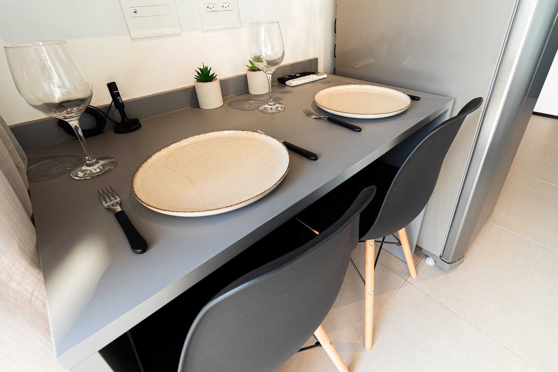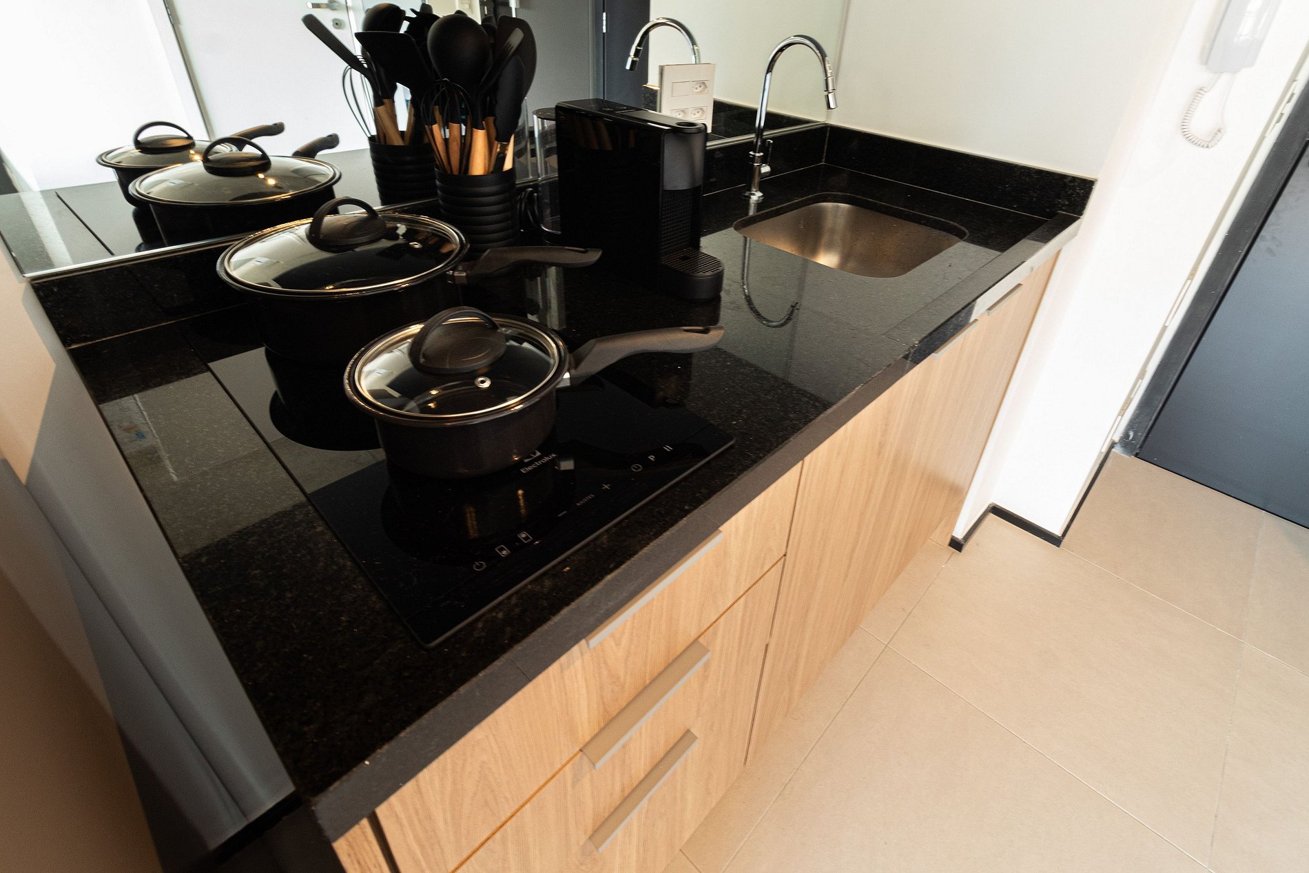 - Cozinha compacta equipada com geladeira, cooktop e micro-ondas
