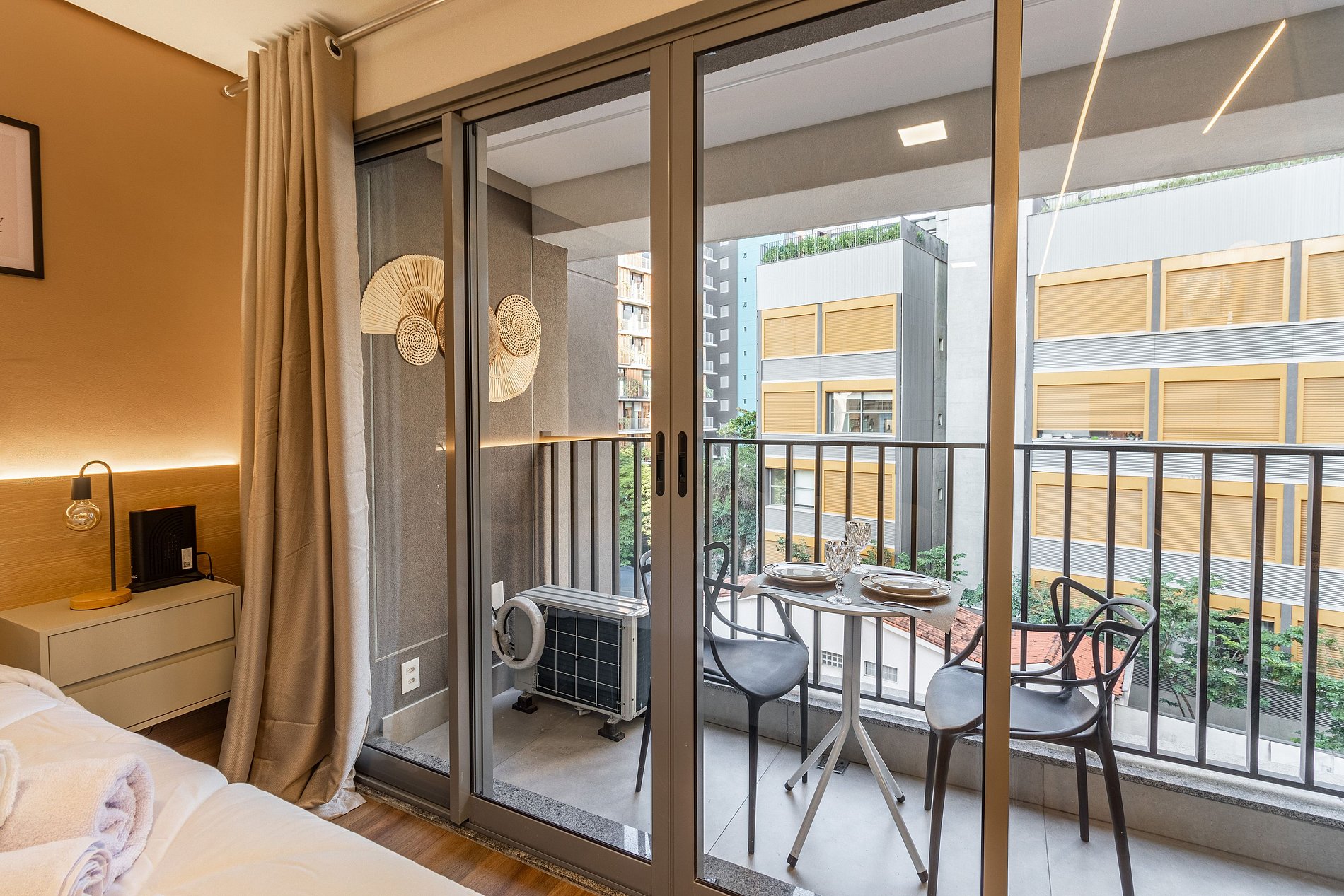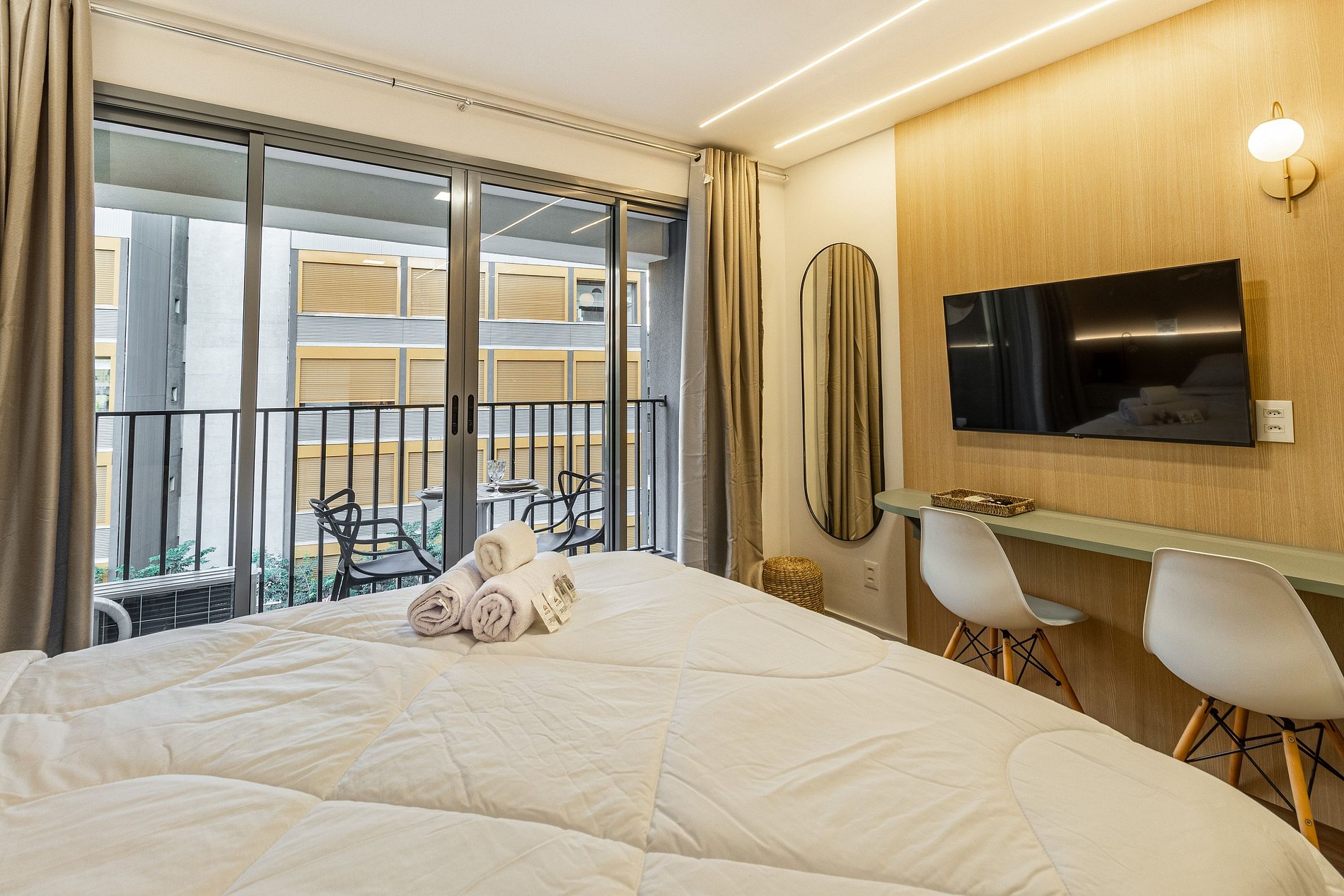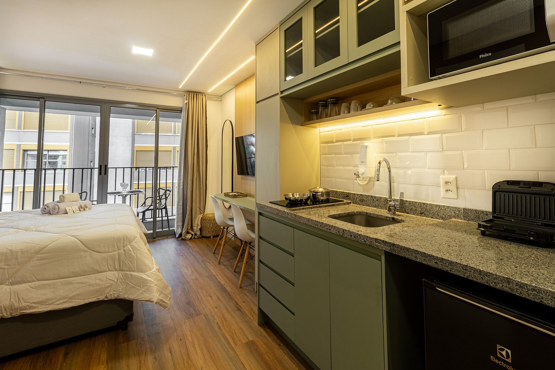 Studio acolhedor para duas pessoas, com cama de casal, ar‑condicionado e varanda privativa. Desfrute de piscina, academia e lavanderia no condomínio. Localizado na Rua da Harmonia, a poucos passos do metrô Vila Madalena, Beco do Batman, bares, cafés e centros culturais. Ideal para quem quer conforto, praticidade e explorar a vida boêmia e criativa da cidade.