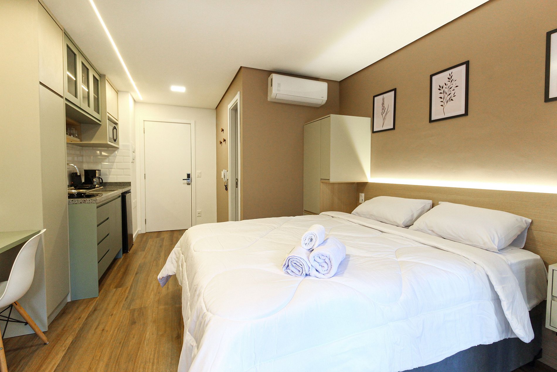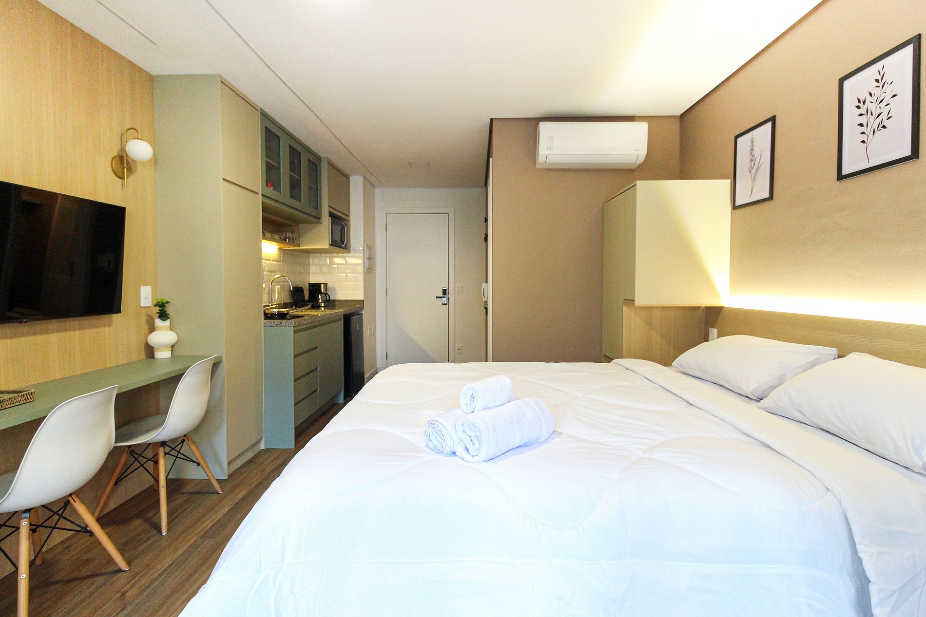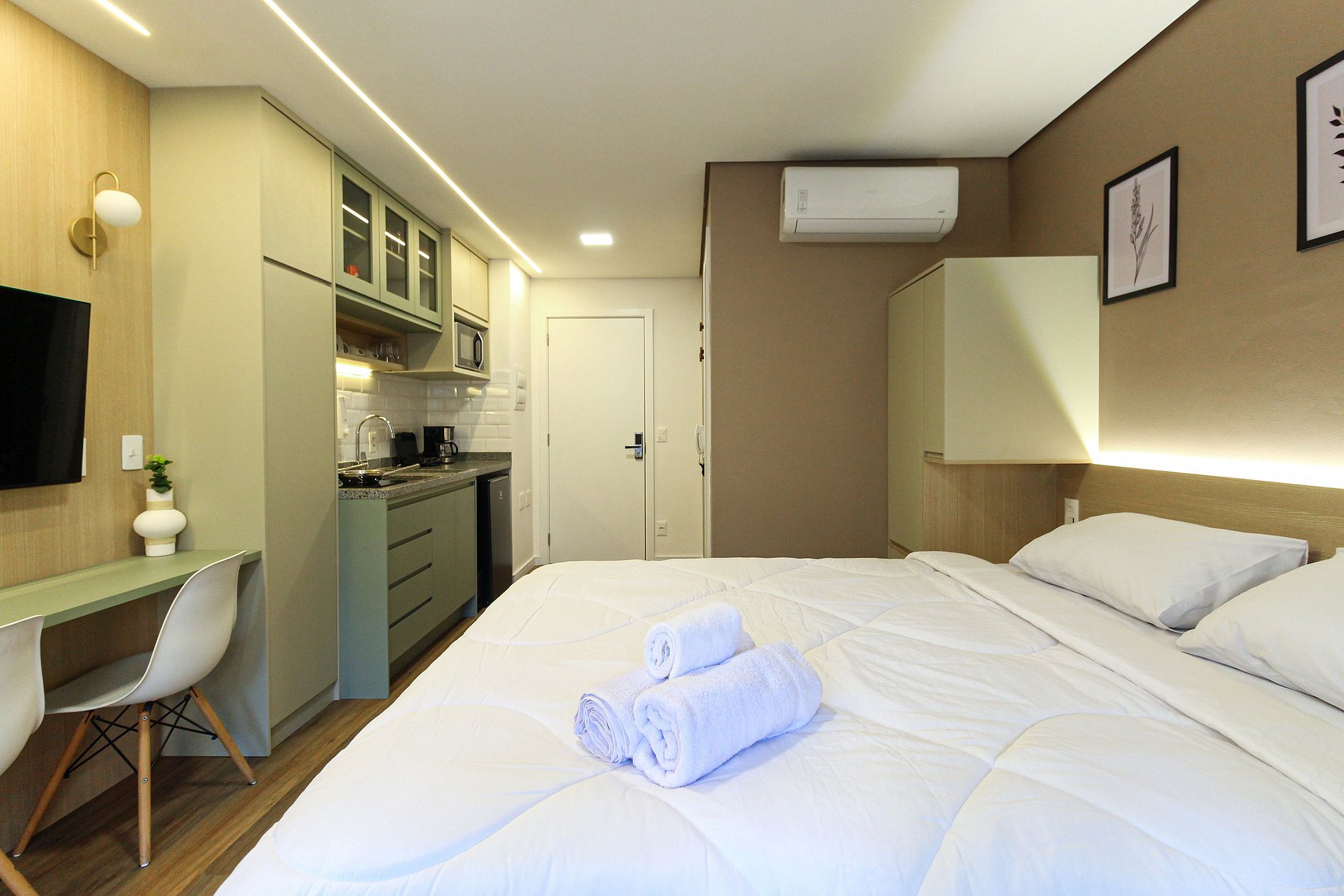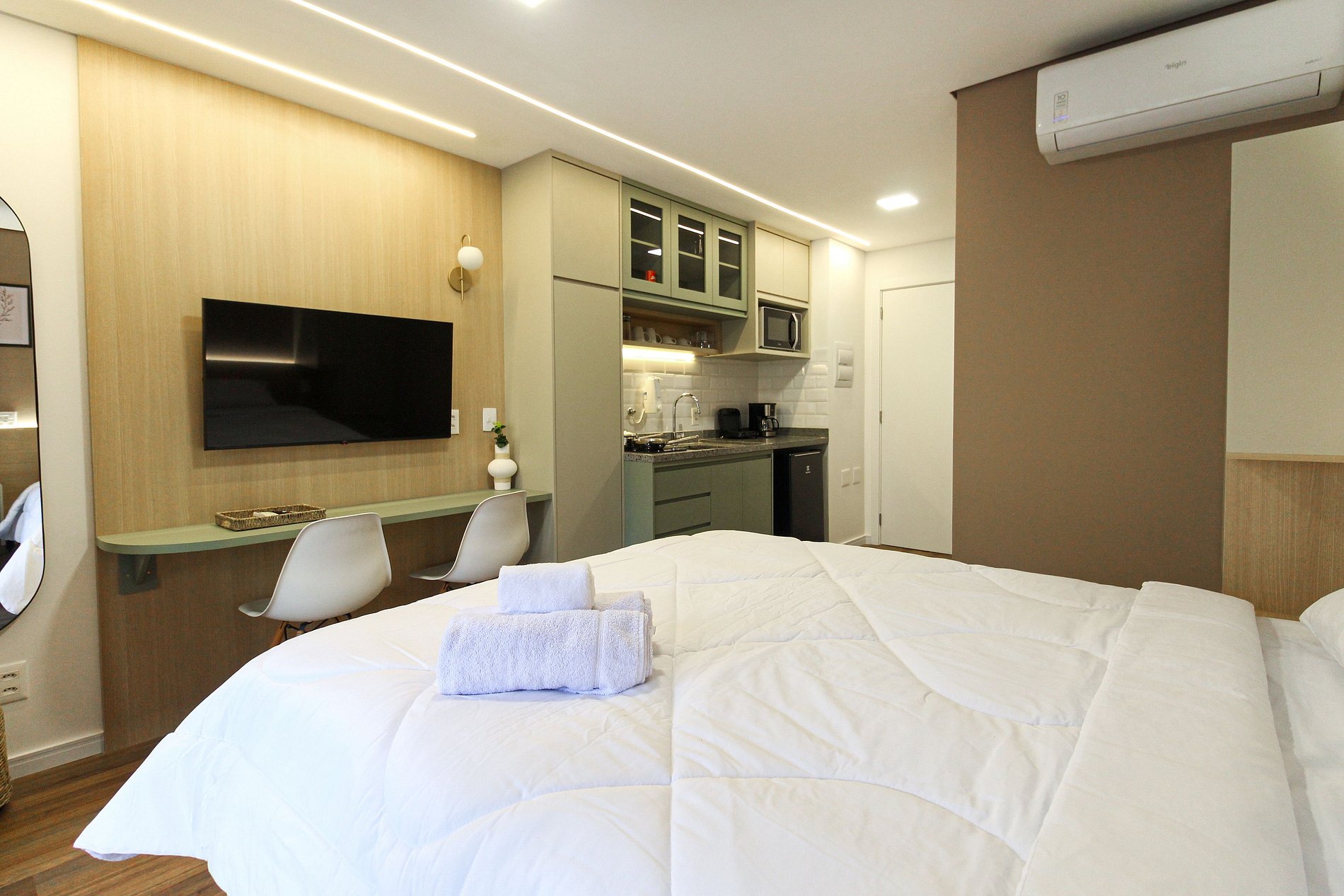 Este studio compacto e funcional é ideal para duas pessoas, oferecendo cama de casal, ar‑condicionado, varanda com vista para o bairro, cozinha equipada e banheiro privativo. O condomínio é completo: piscina adulto e infantil, academia moderna, lavanderia coletiva, churrasqueira, brinquedoteca, salão de festas, elevadores e portaria 24 horas.