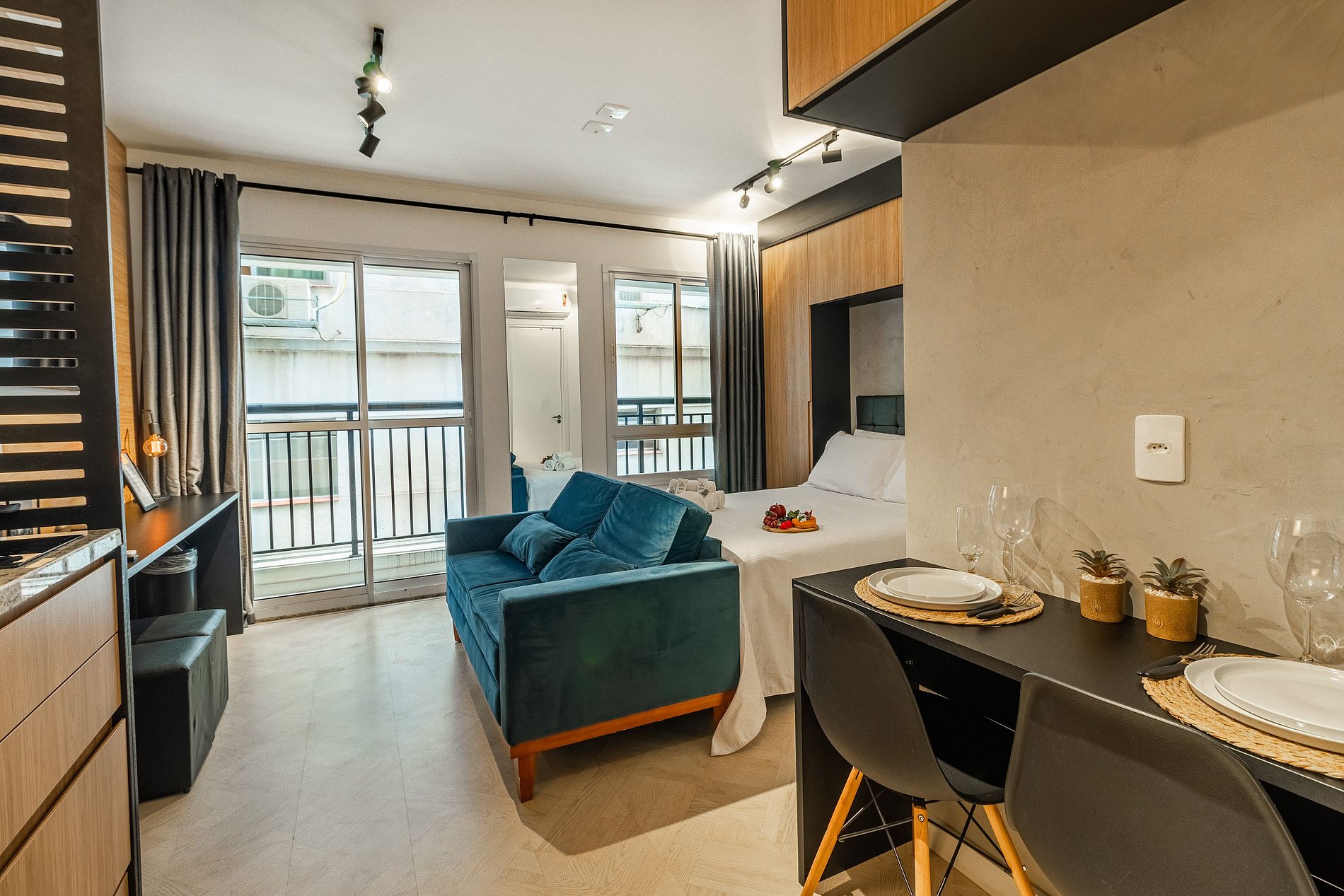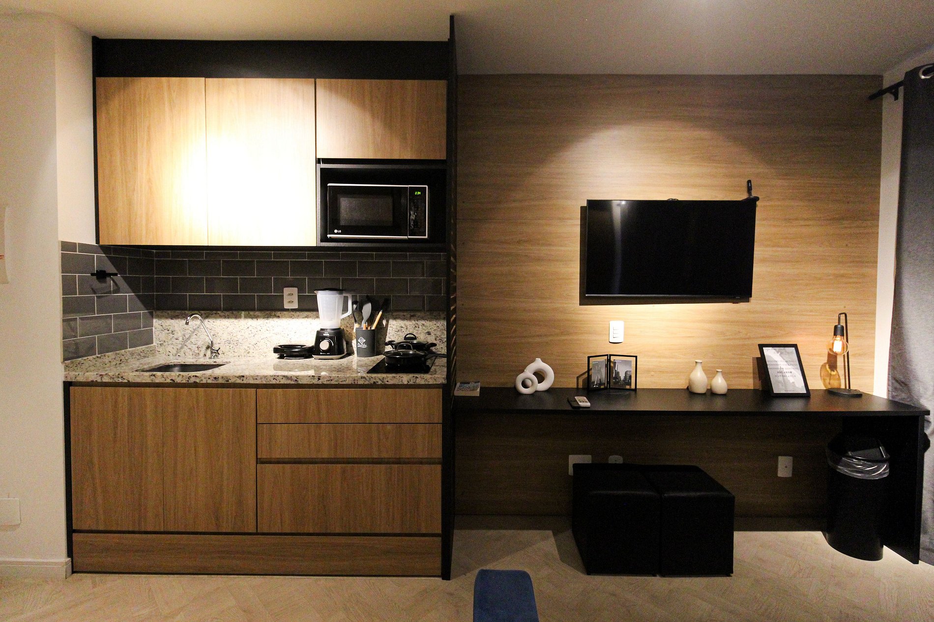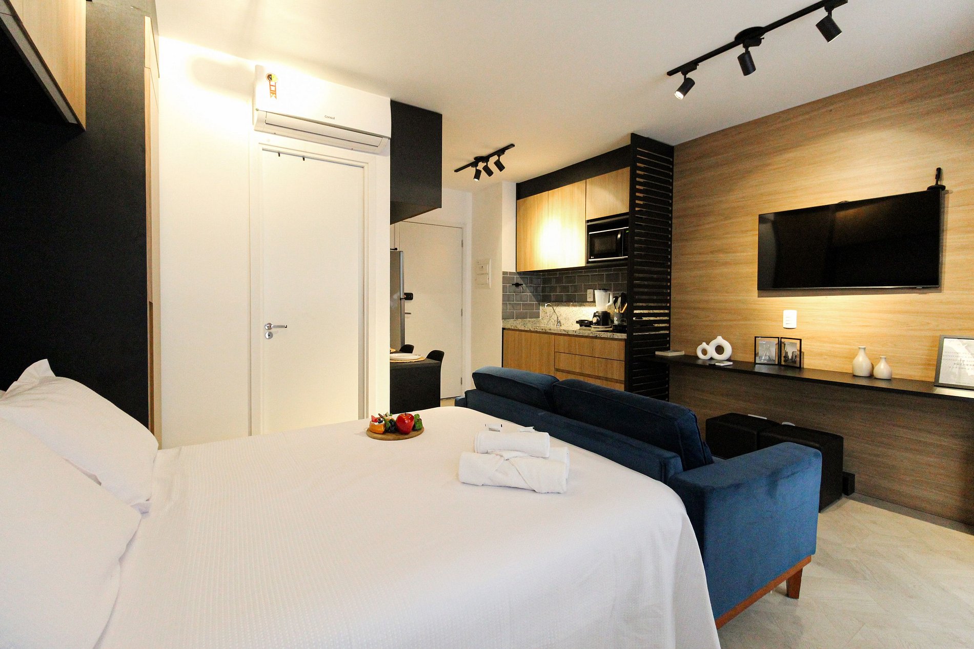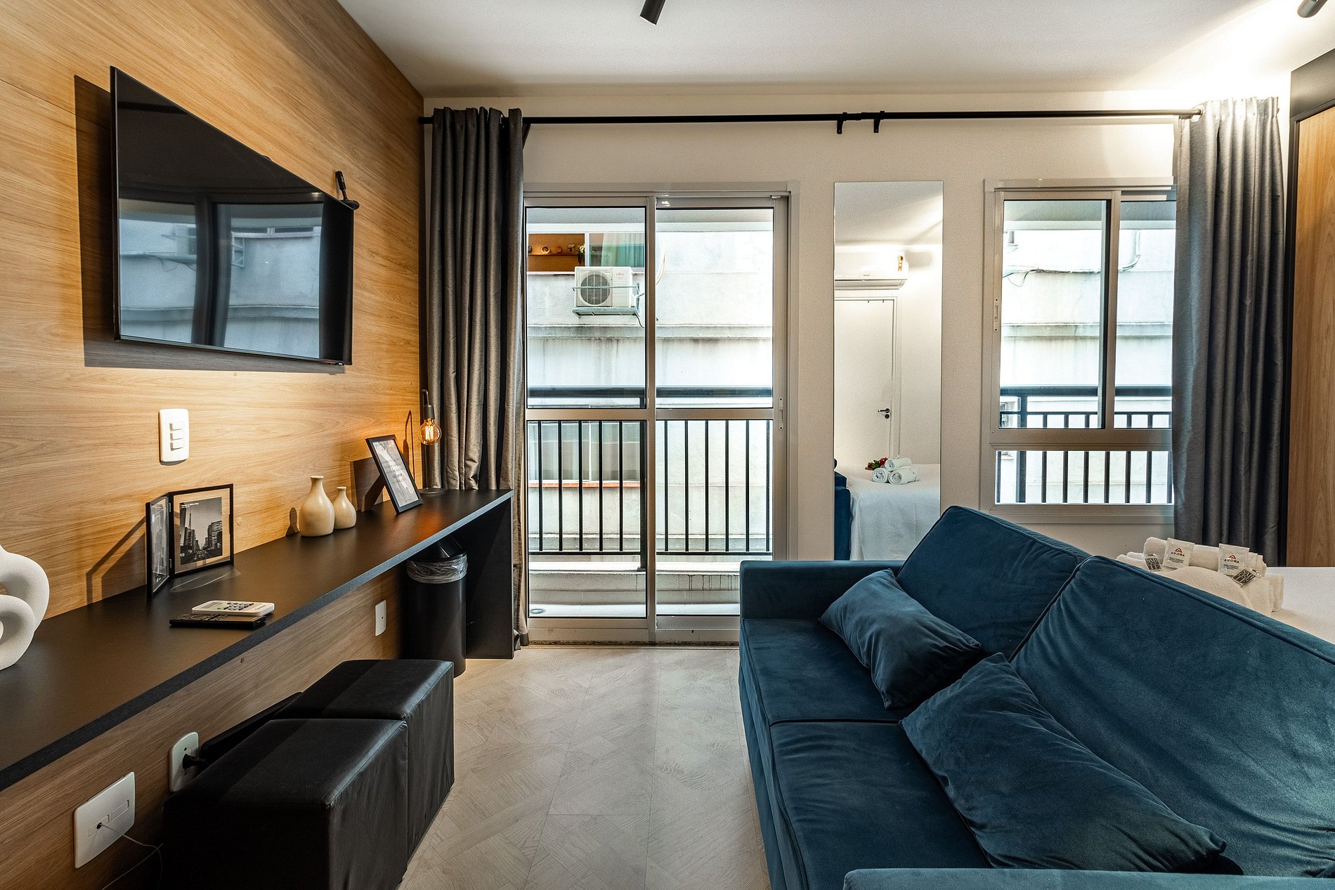Studio:- Dormitório integrado com cama de casal confortável e roupa de cama estilo hotelaria. - Sala de estar com sofá, TV de tela grande e varanda que proporciona luz natural e vista urbana. - Cozinha compacta equipada com geladeira, fogão 2 bocas, micro‑ondas, utensílios básicos e bancada para refeições. - Ar‑condicionado, wi‑fi de alta velocidade, armário, ferro de passar e espaço organizado. - Extras de conforto: kit de banho e amenidades alinhadas a um padrão de hospedagem.