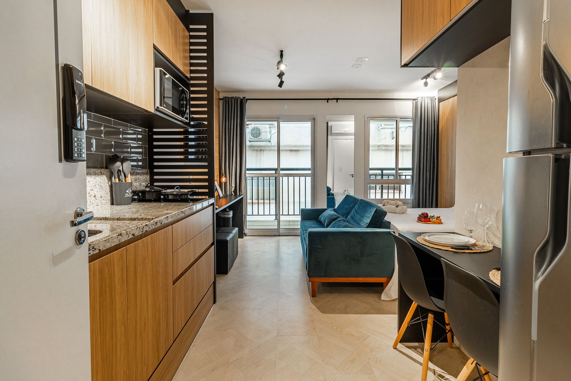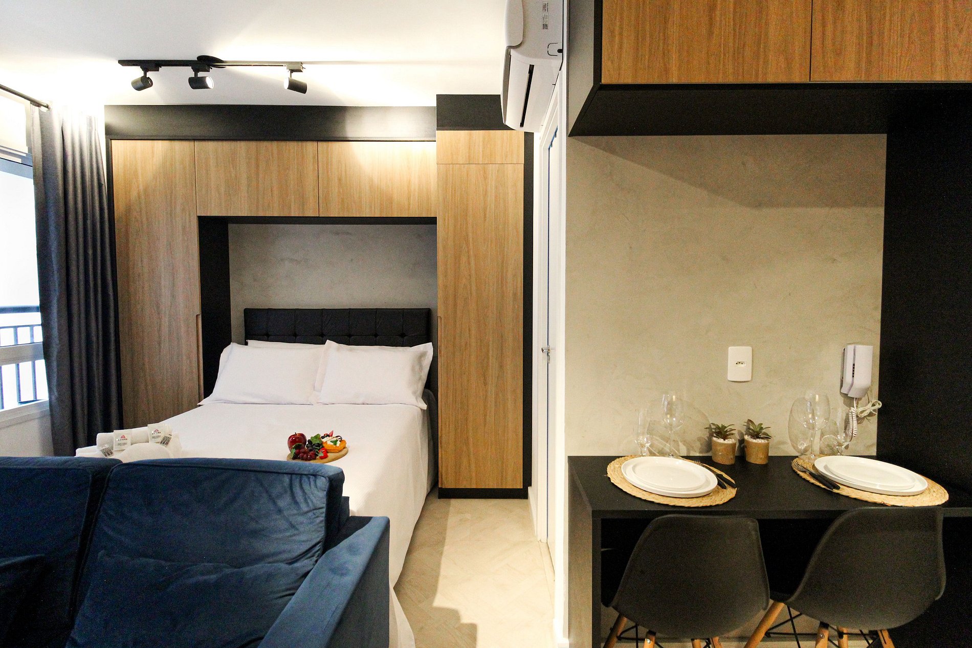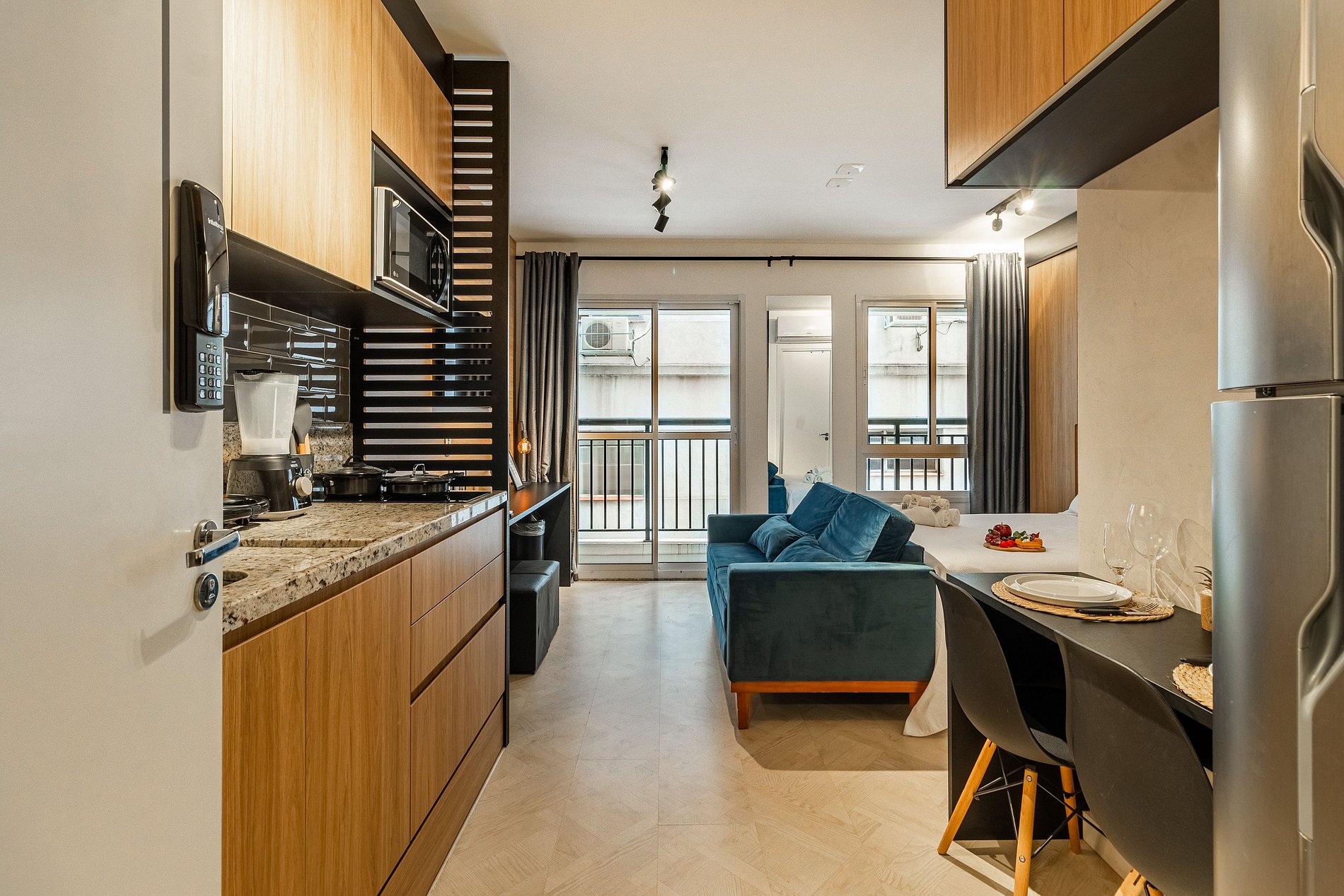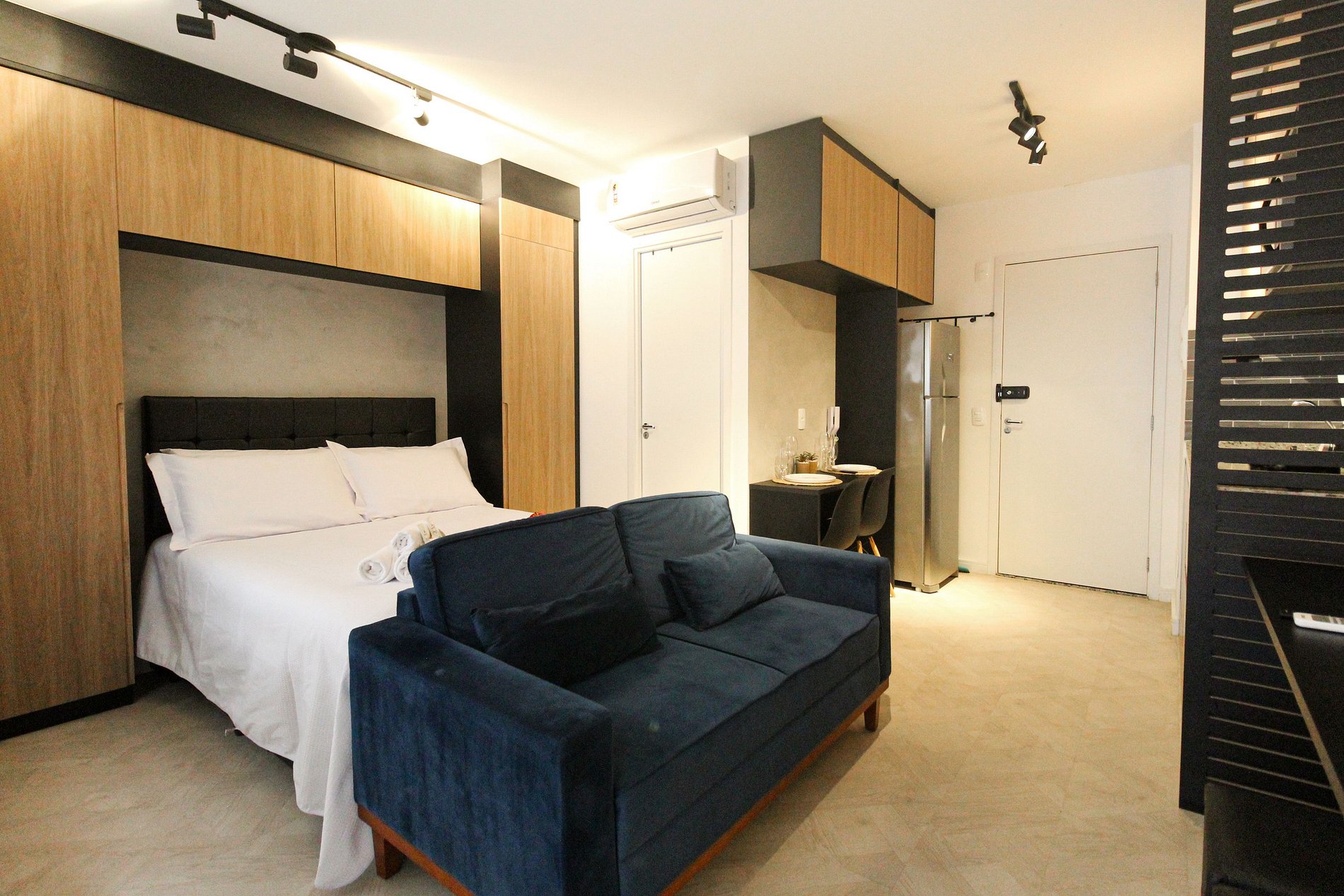 Studio:- Dormitório integrado com cama de casal confortável e roupa de cama estilo hotelaria. - Sala de estar com sofá, TV de tela grande e varanda que proporciona luz natural e vista urbana. - Cozinha compacta equipada com geladeira, fogão 2 bocas, micro‑ondas, utensílios básicos e bancada para refeições. - Ar‑condicionado, wi‑fi de alta velocidade, armário, ferro de passar e espaço organizado. - Extras de conforto: kit de banho e amenidades alinhadas a um padrão de hospedagem.
