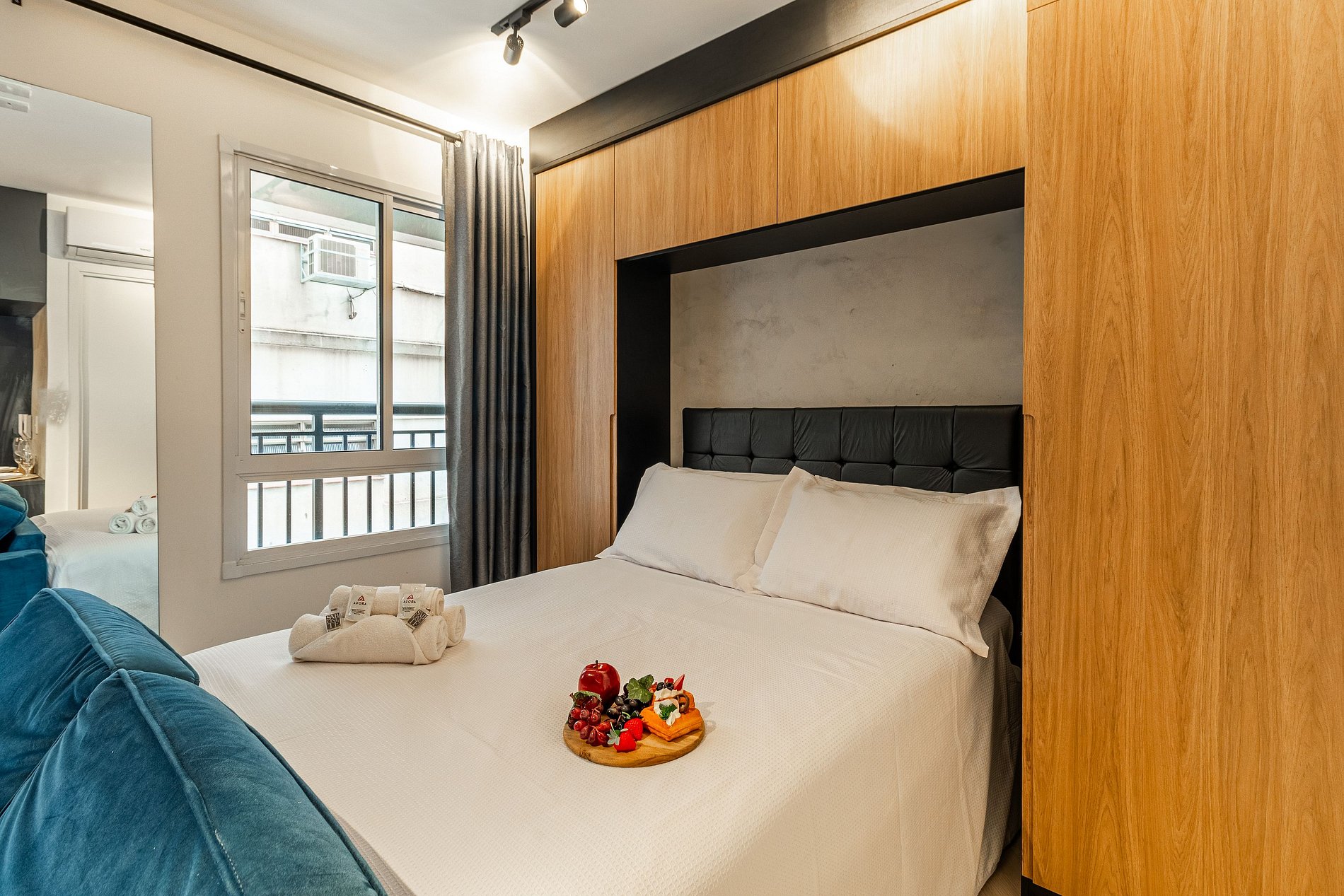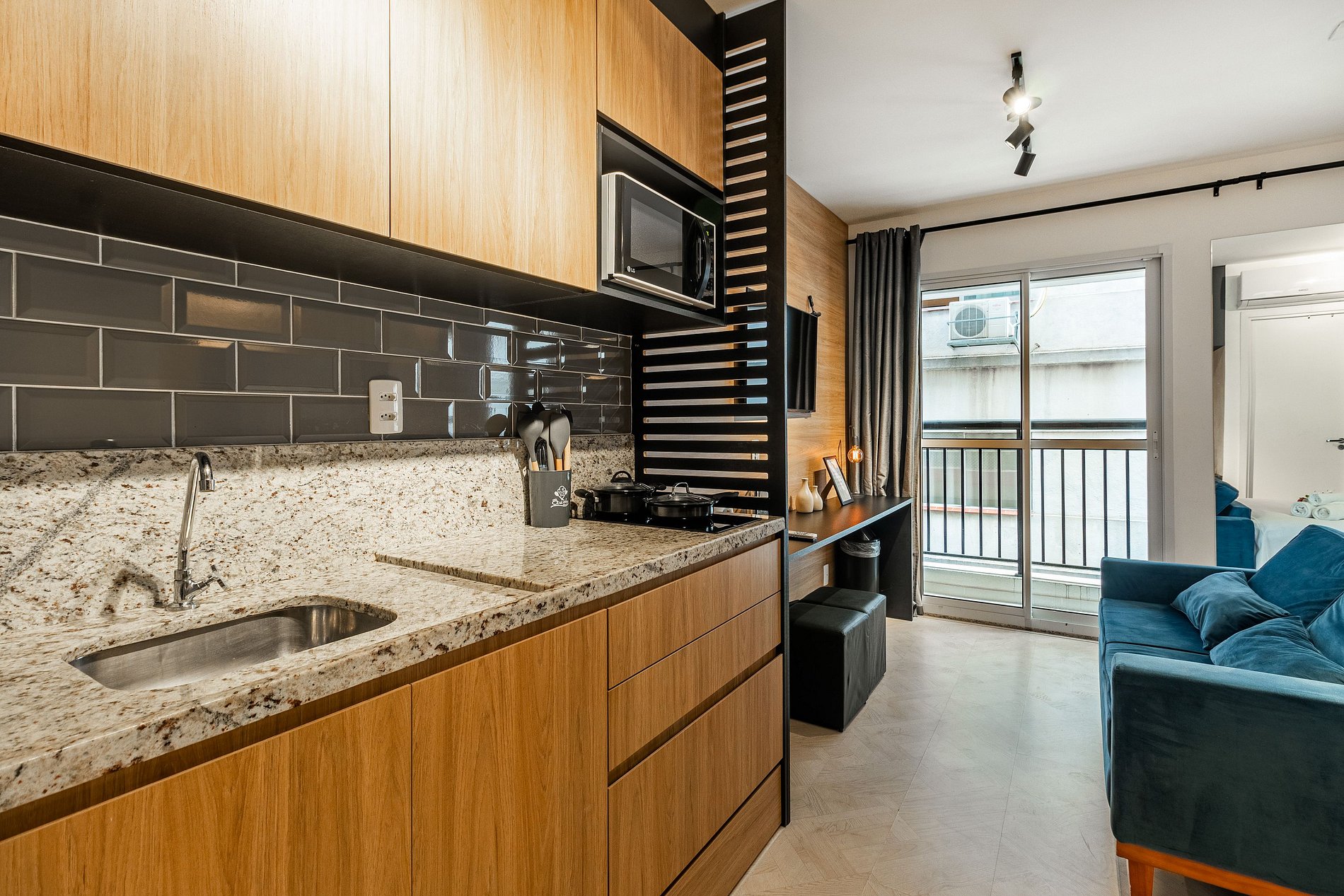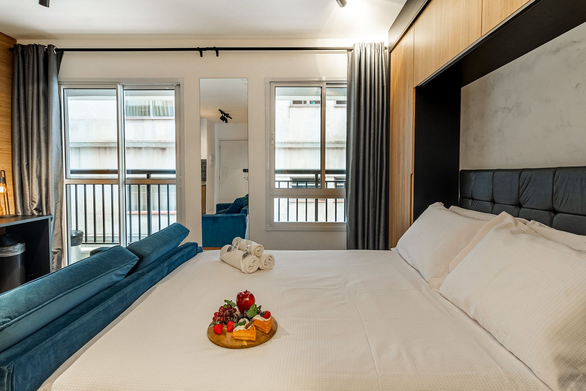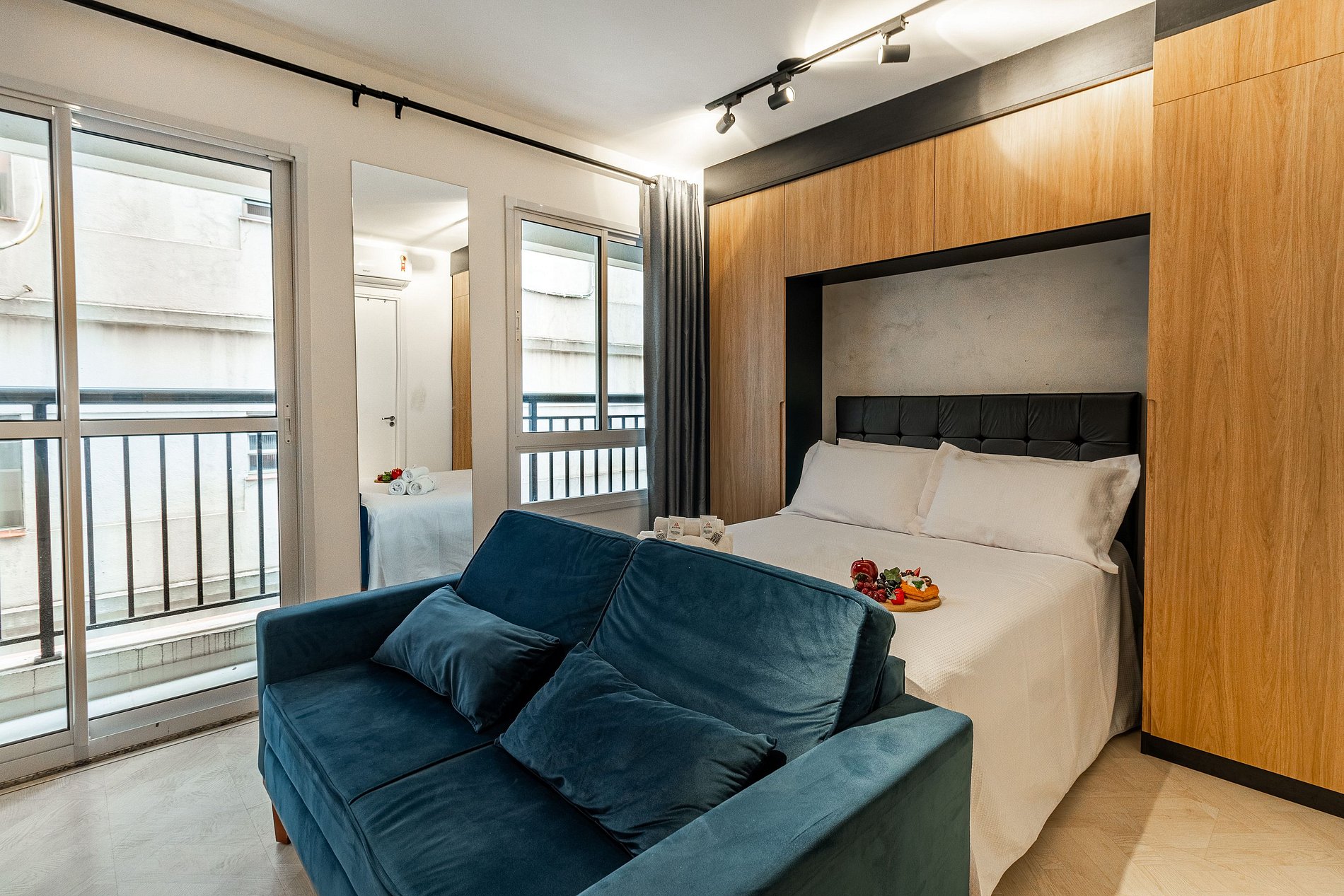 Studio:- Dormitório integrado com cama de casal confortável e roupa de cama estilo hotelaria. - Sala de estar com sofá, TV de tela grande e varanda que proporciona luz natural e vista urbana. - Cozinha compacta equipada com geladeira, fogão 2 bocas, micro‑ondas, utensílios básicos e bancada para refeições. - Ar‑condicionado, wi‑fi de alta velocidade, armário, ferro de passar e espaço organizado. - Extras de conforto: kit de banho e amenidades alinhadas a um padrão de hospedagem.