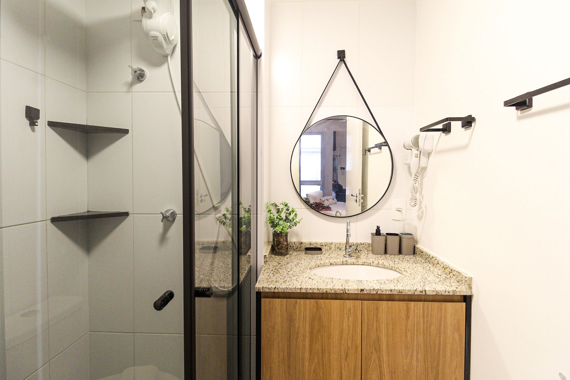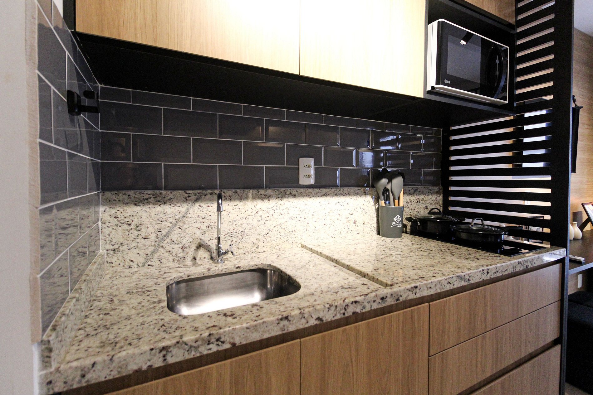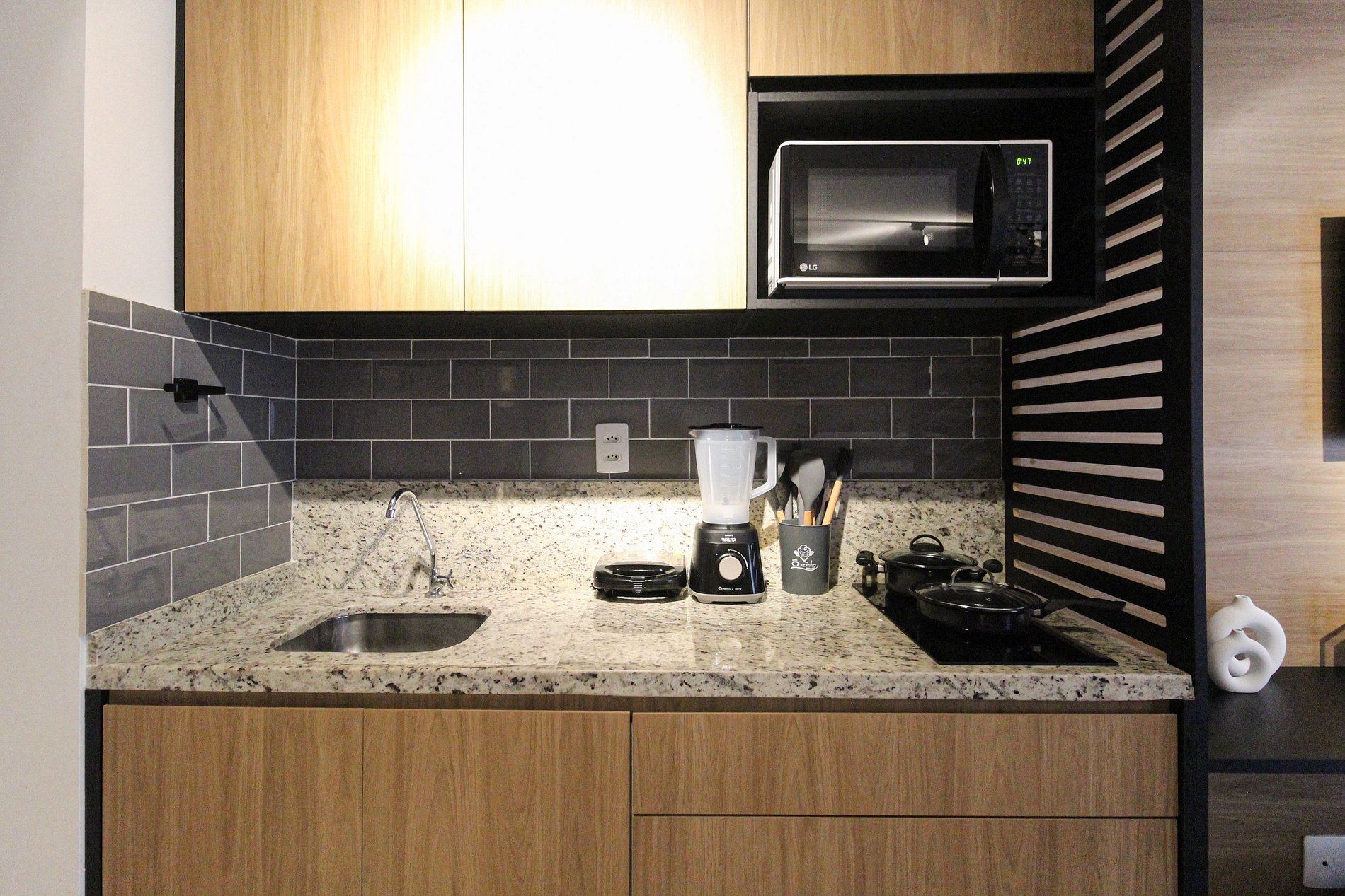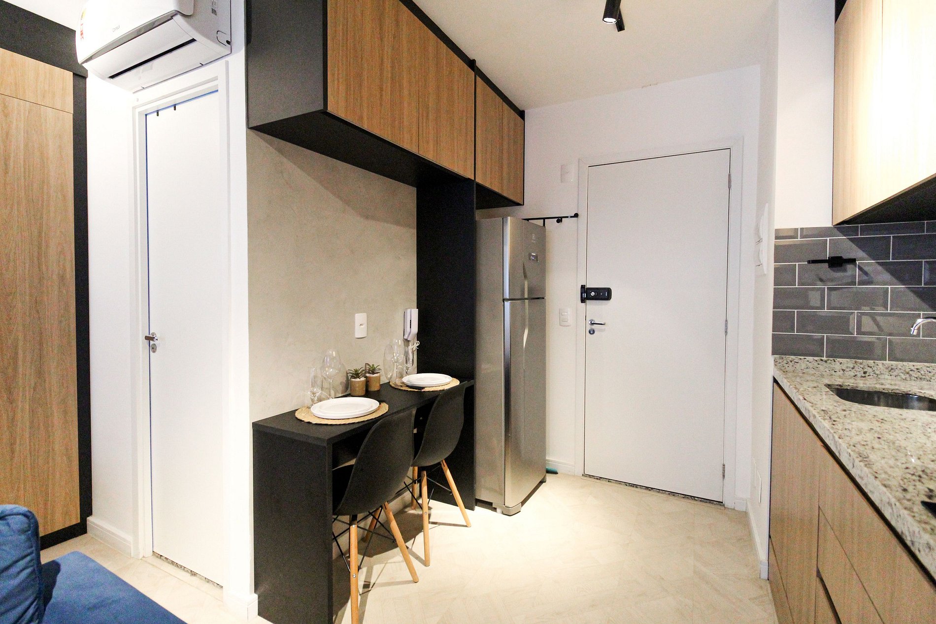 Studio:- Dormitório integrado com cama de casal confortável e roupa de cama estilo hotelaria. - Sala de estar com sofá, TV de tela grande e varanda que proporciona luz natural e vista urbana. - Cozinha compacta equipada com geladeira, fogão 2 bocas, micro‑ondas, utensílios básicos e bancada para refeições. - Ar‑condicionado, wi‑fi de alta velocidade, armário, ferro de passar e espaço organizado. - Extras de conforto: kit de banho e amenidades alinhadas a um padrão de hospedagem.
