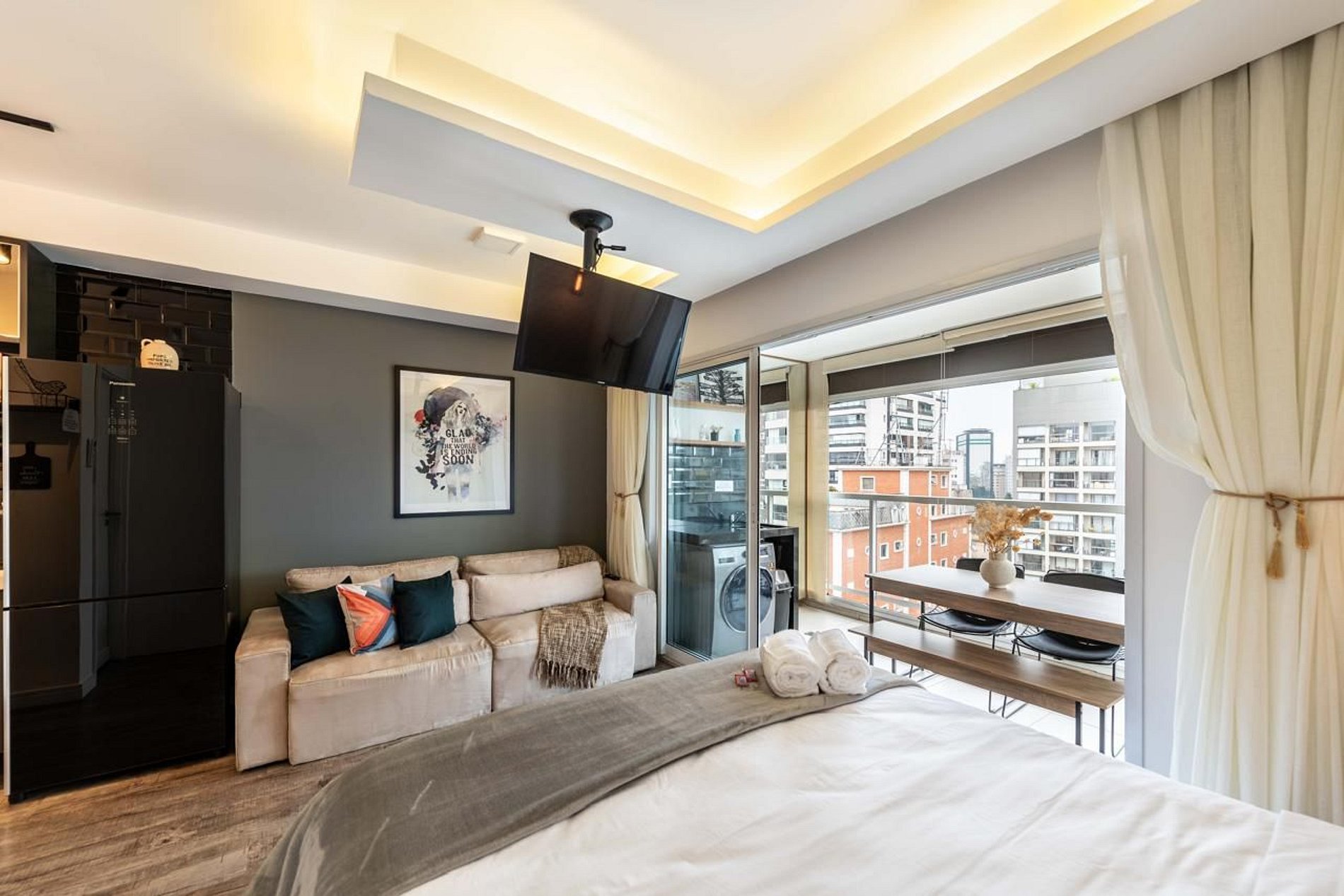 - Sala integrada com sofá confortável, TV de tela grande e espaço para refeições.