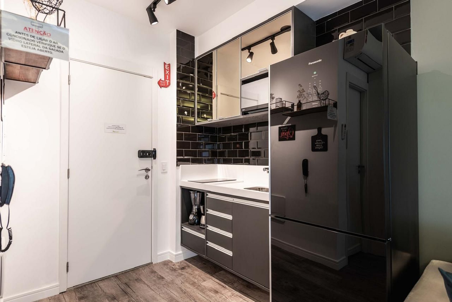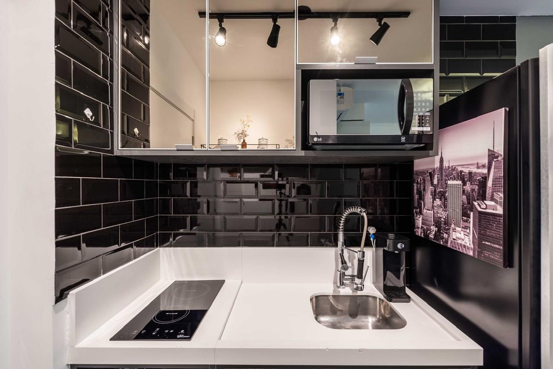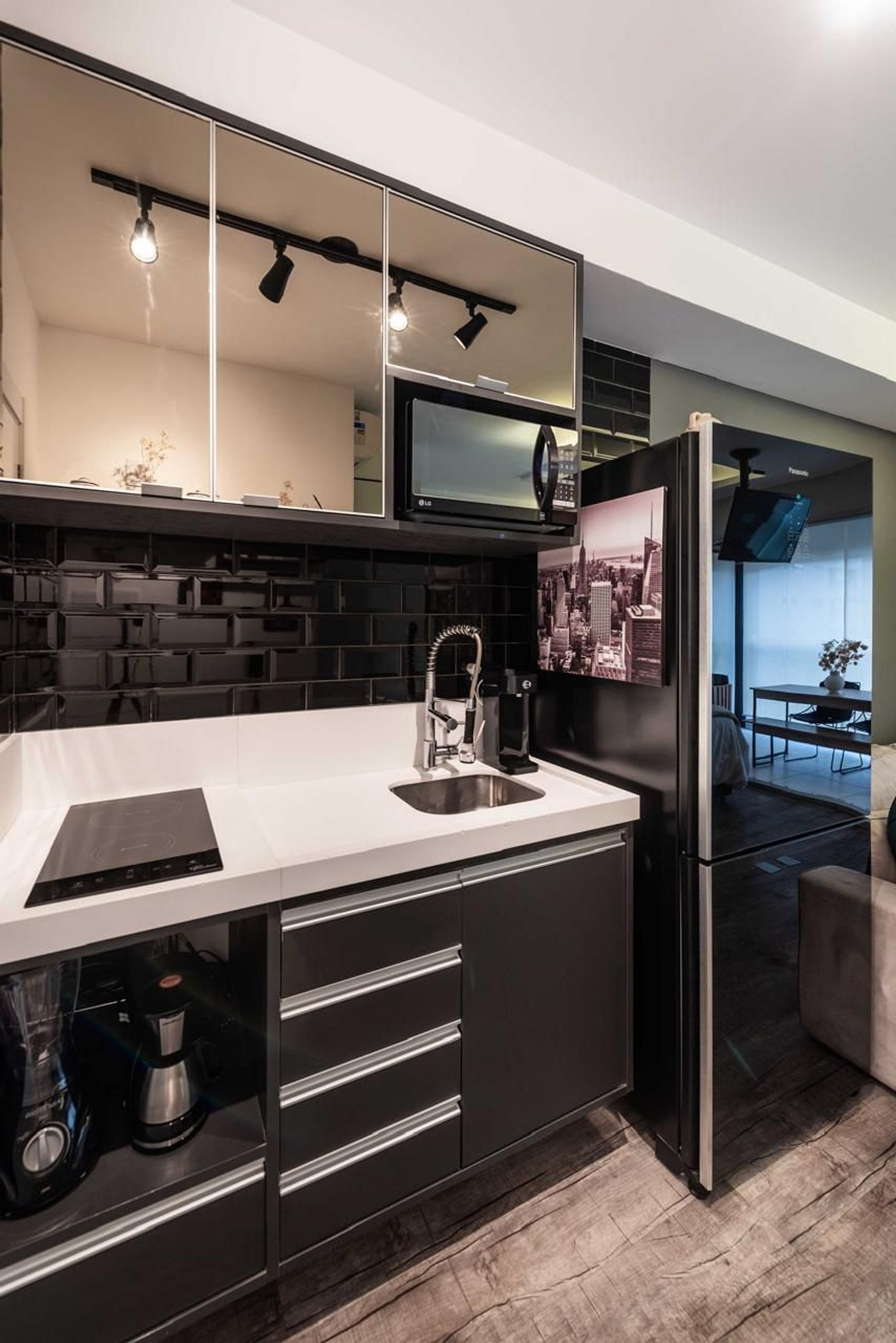 - Cozinha compacta equipada com geladeira, fogão, micro‑ondas e utensílios.