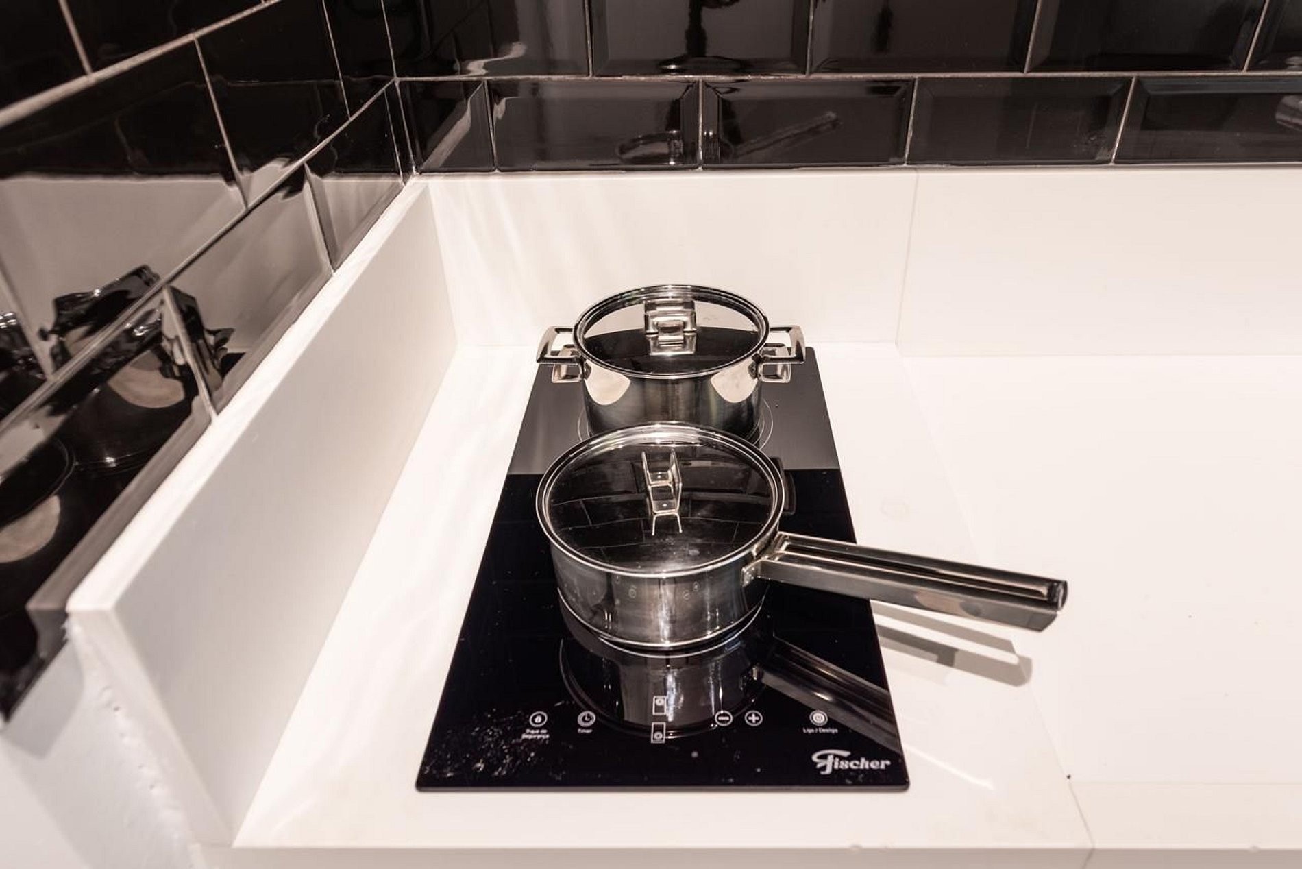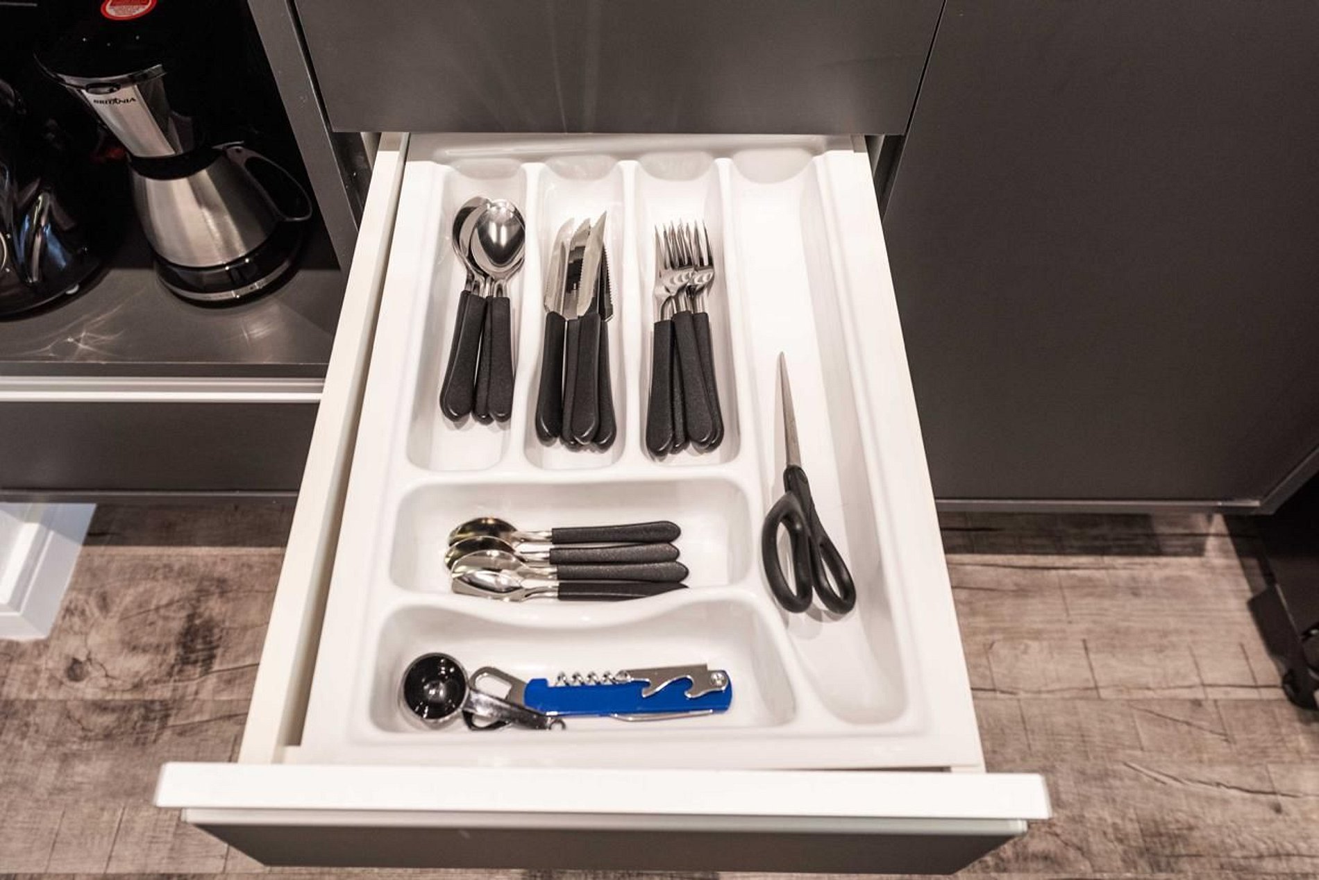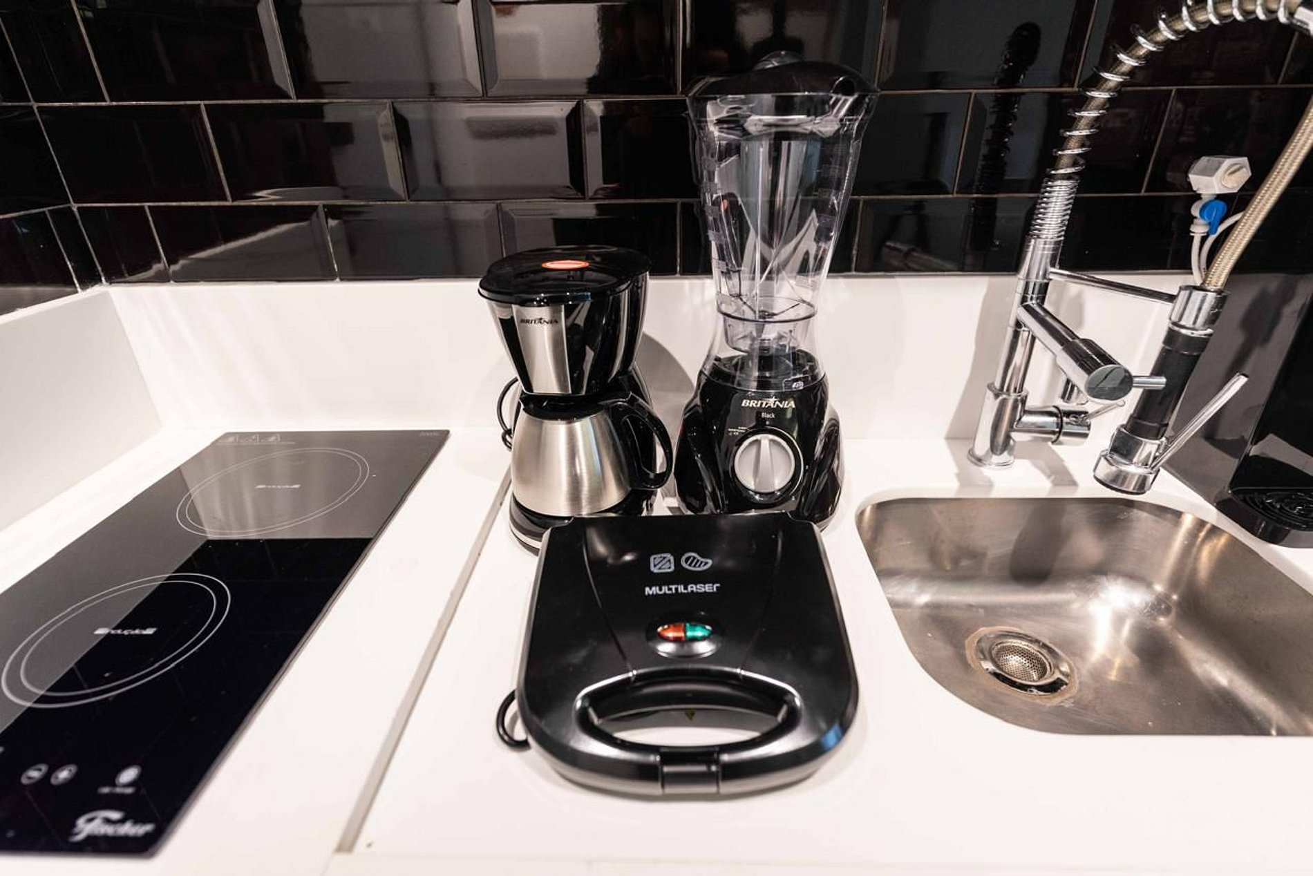 - Cozinha compacta equipada com geladeira, fogão, micro‑ondas e utensílios.