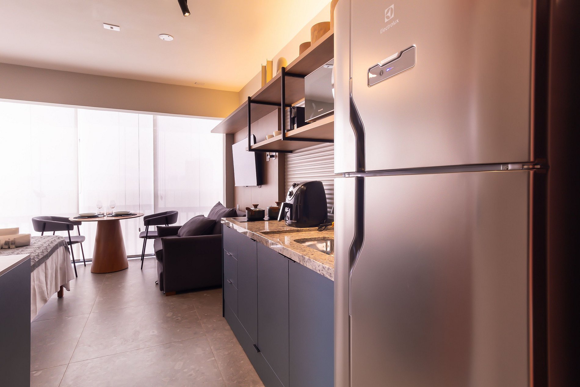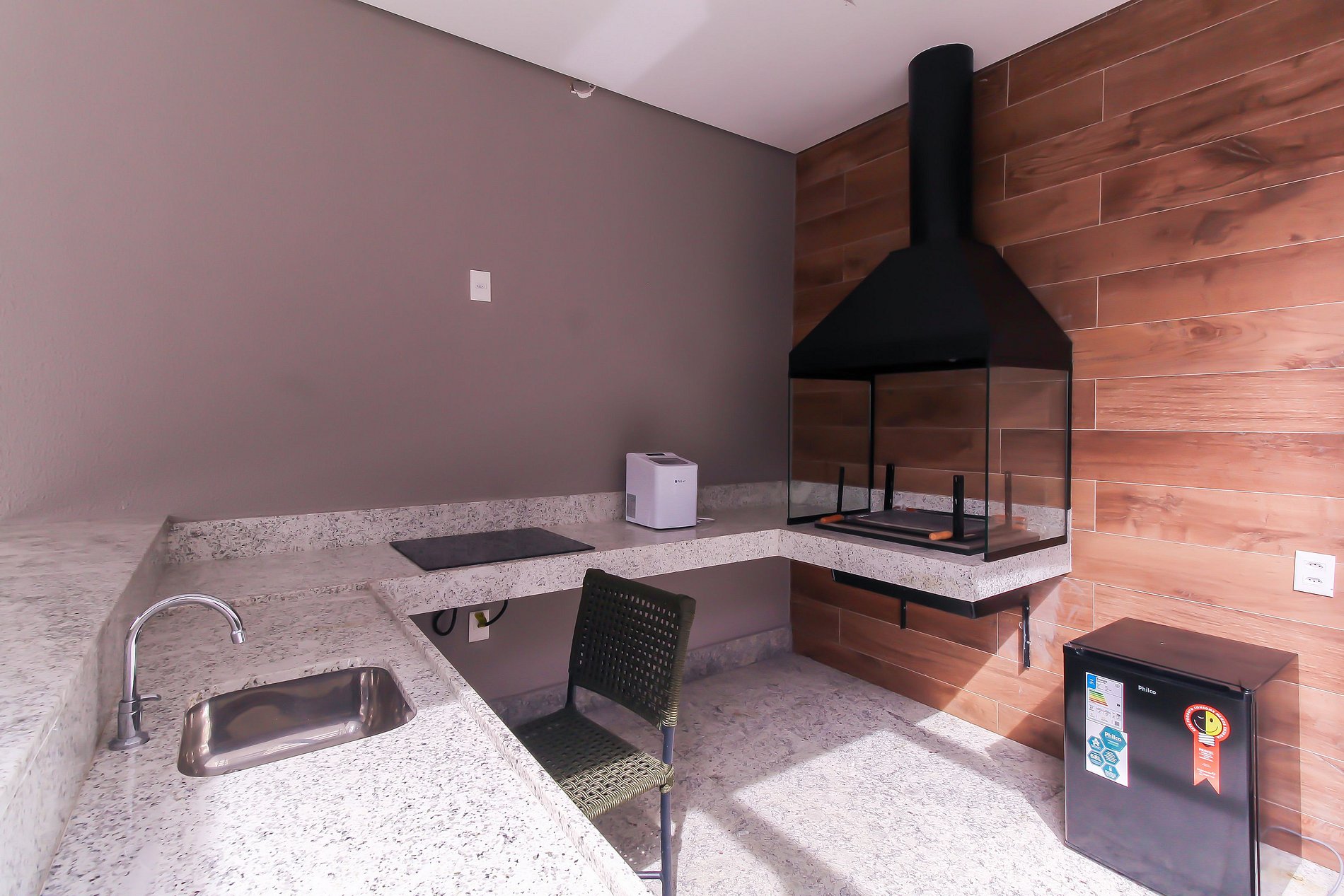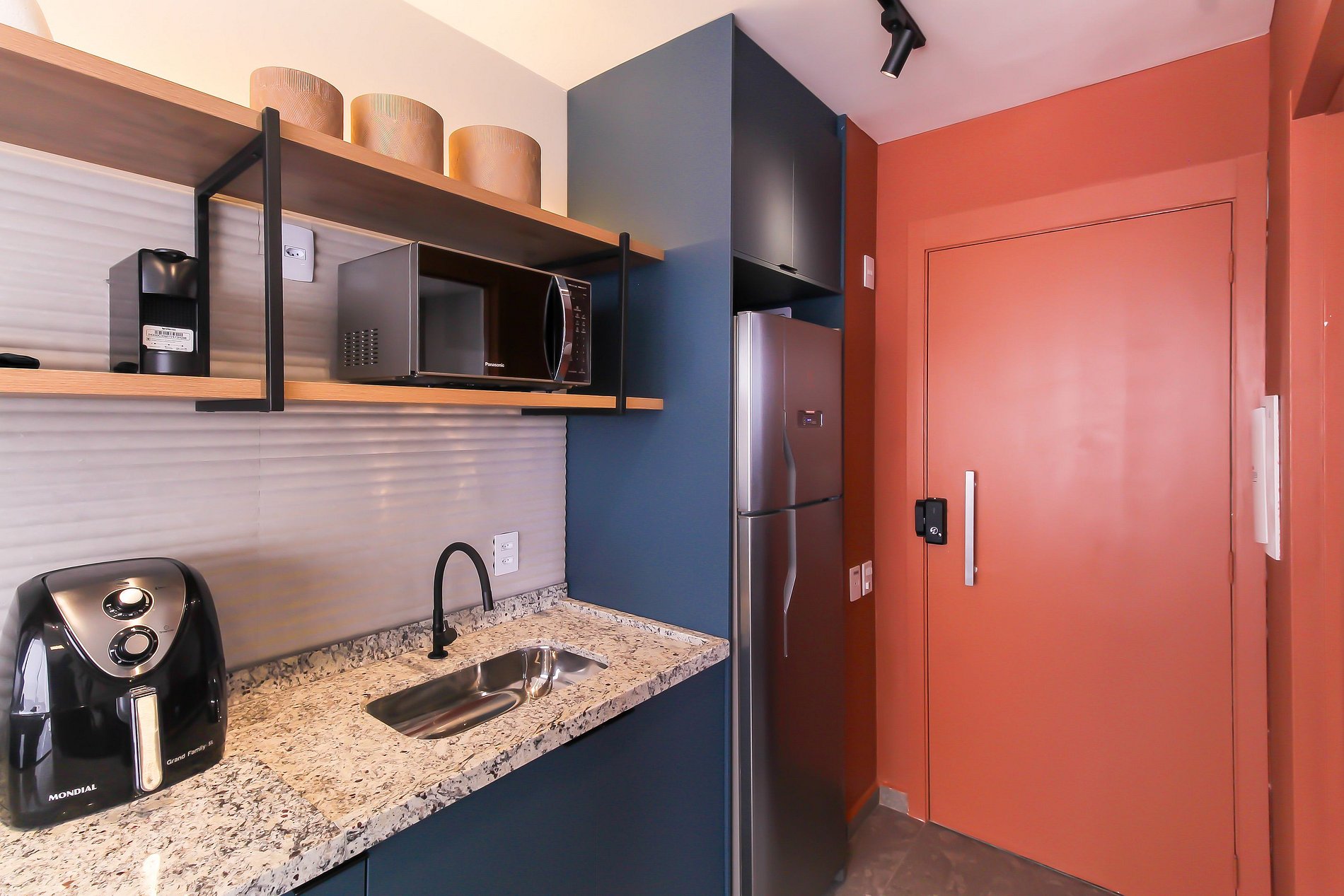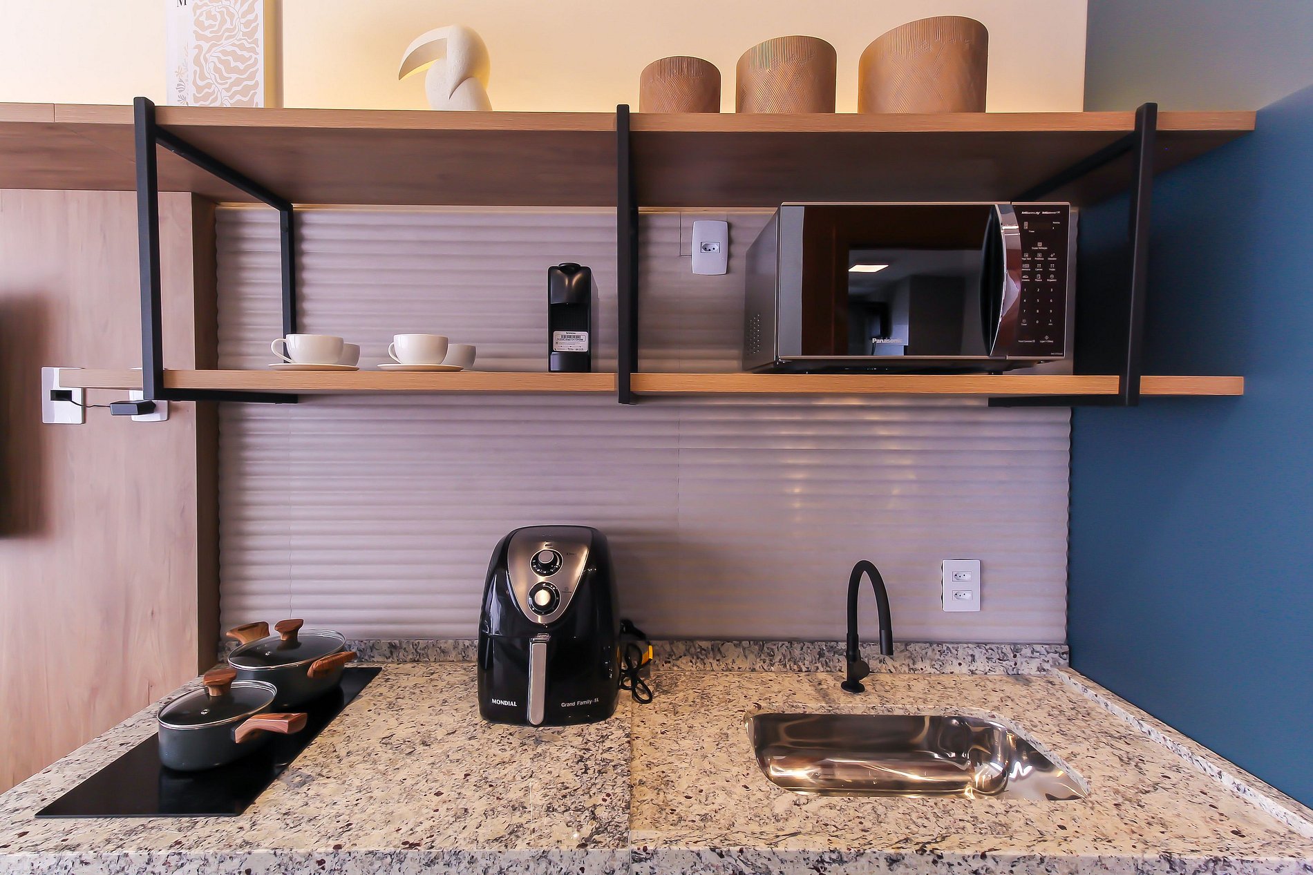 A cozinha é compacta, equipada com geladeira, cooktop, micro-ondas e utensílios básicos, ideal para refeições rápidas. O condomínio oferece piscina, academia equipada, lavanderia com máquinas de lavar e secar e portaria 24 horas, garantindo segurança e comodidade.