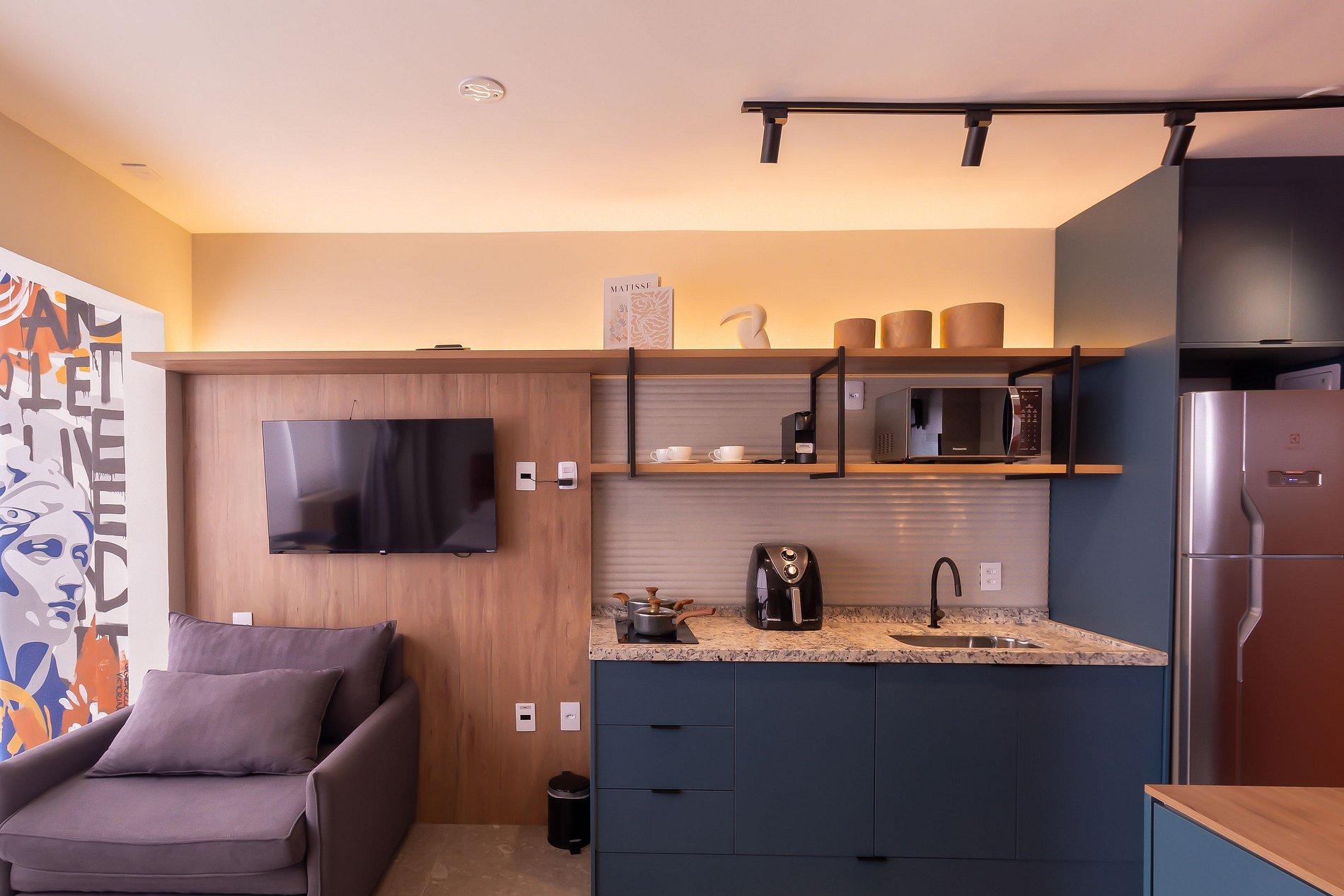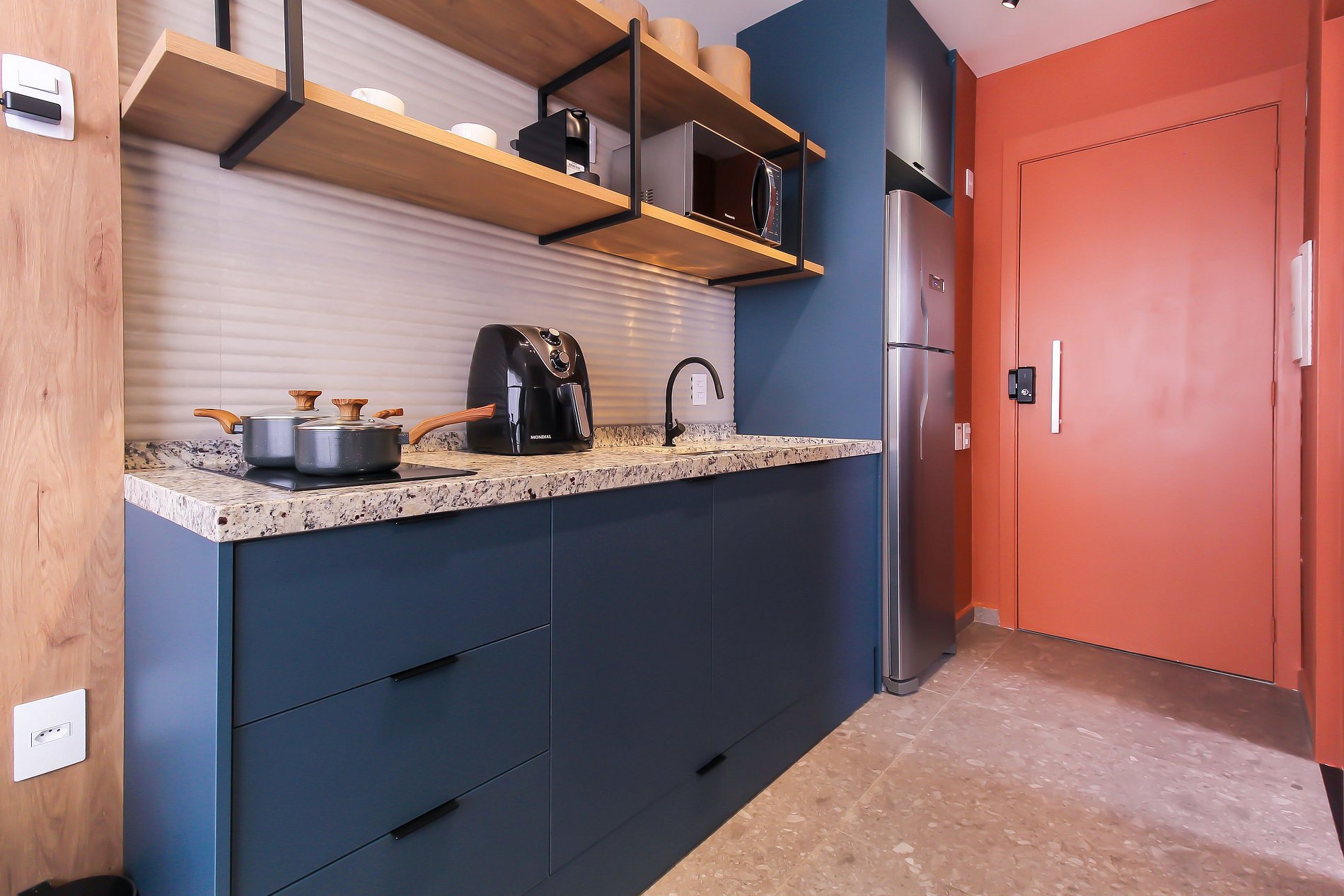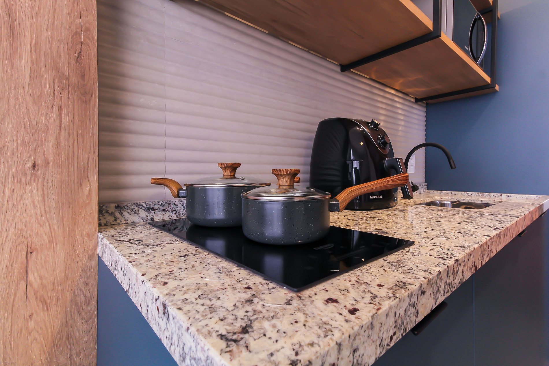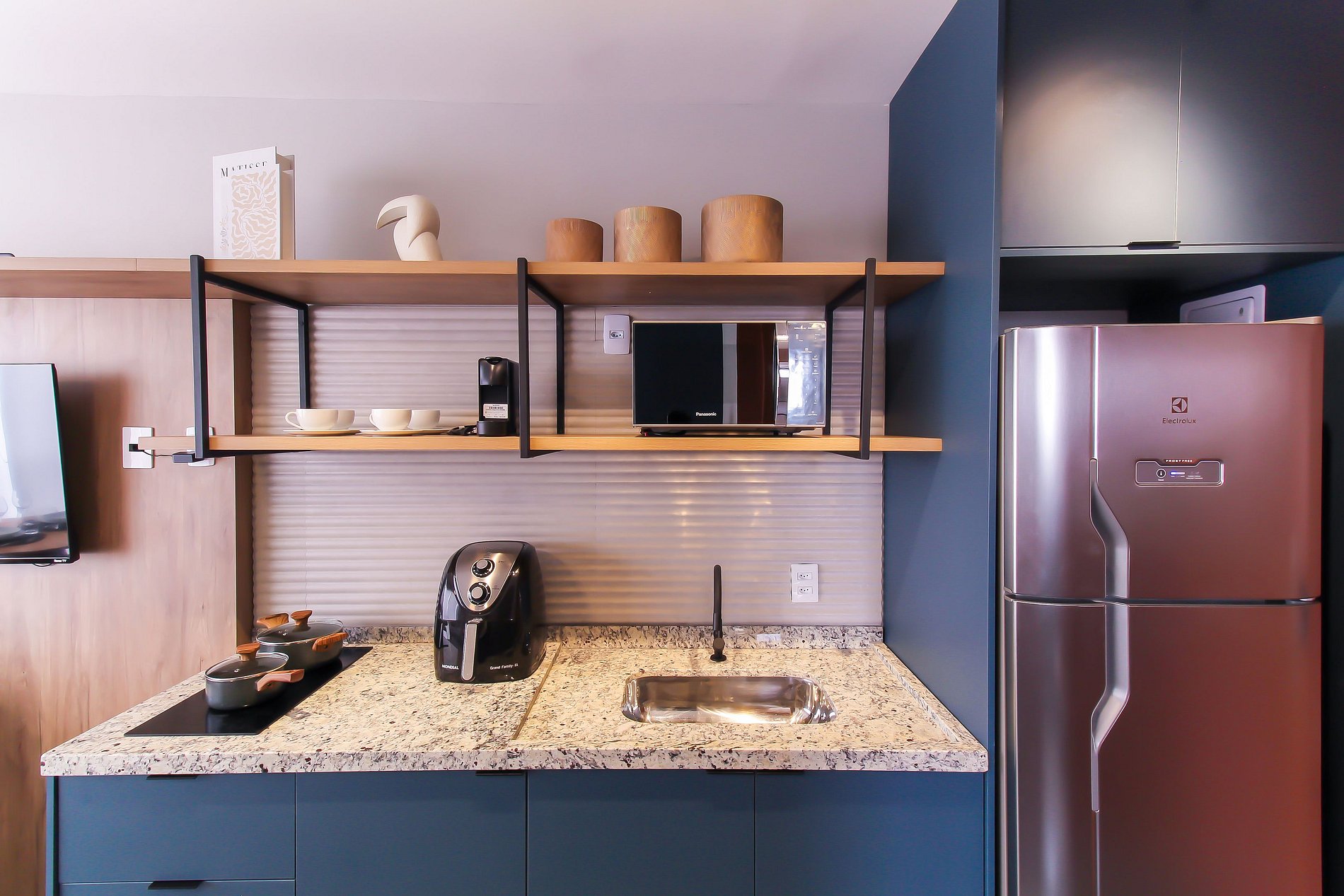 A cozinha é compacta, equipada com geladeira, cooktop, micro-ondas e utensílios básicos, ideal para refeições rápidas. O condomínio oferece piscina, academia equipada, lavanderia com máquinas de lavar e secar e portaria 24 horas, garantindo segurança e comodidade.