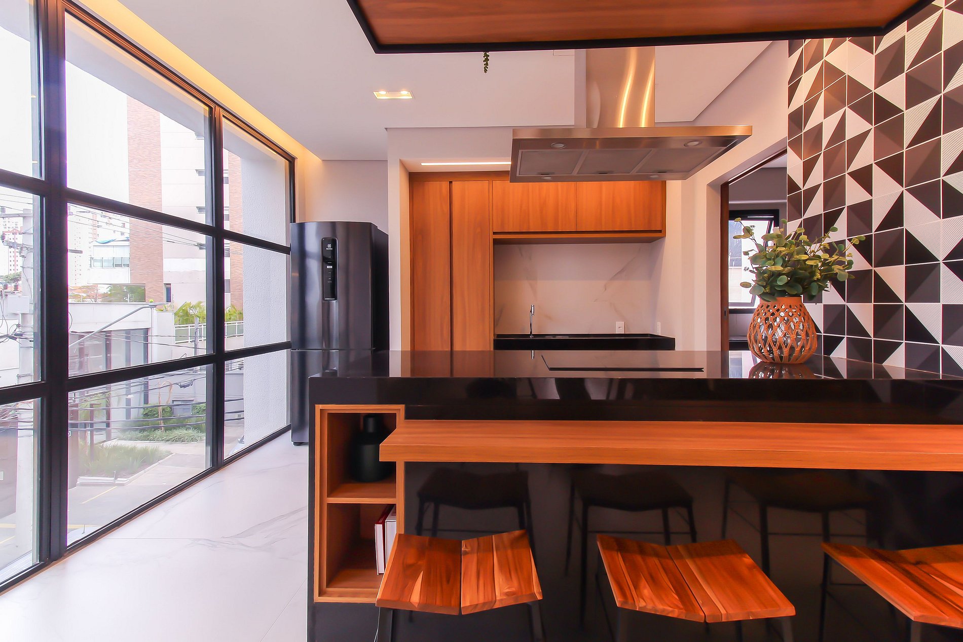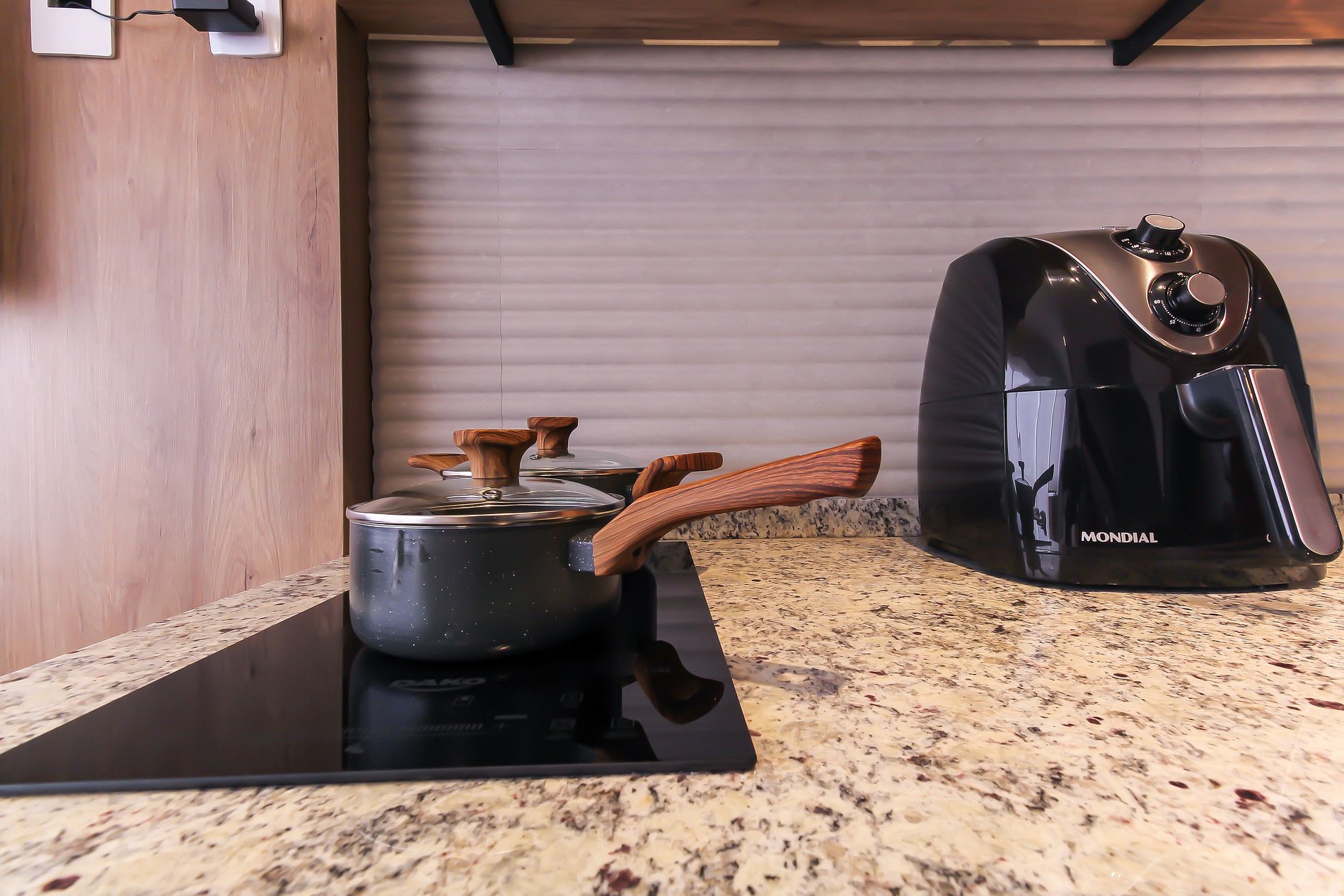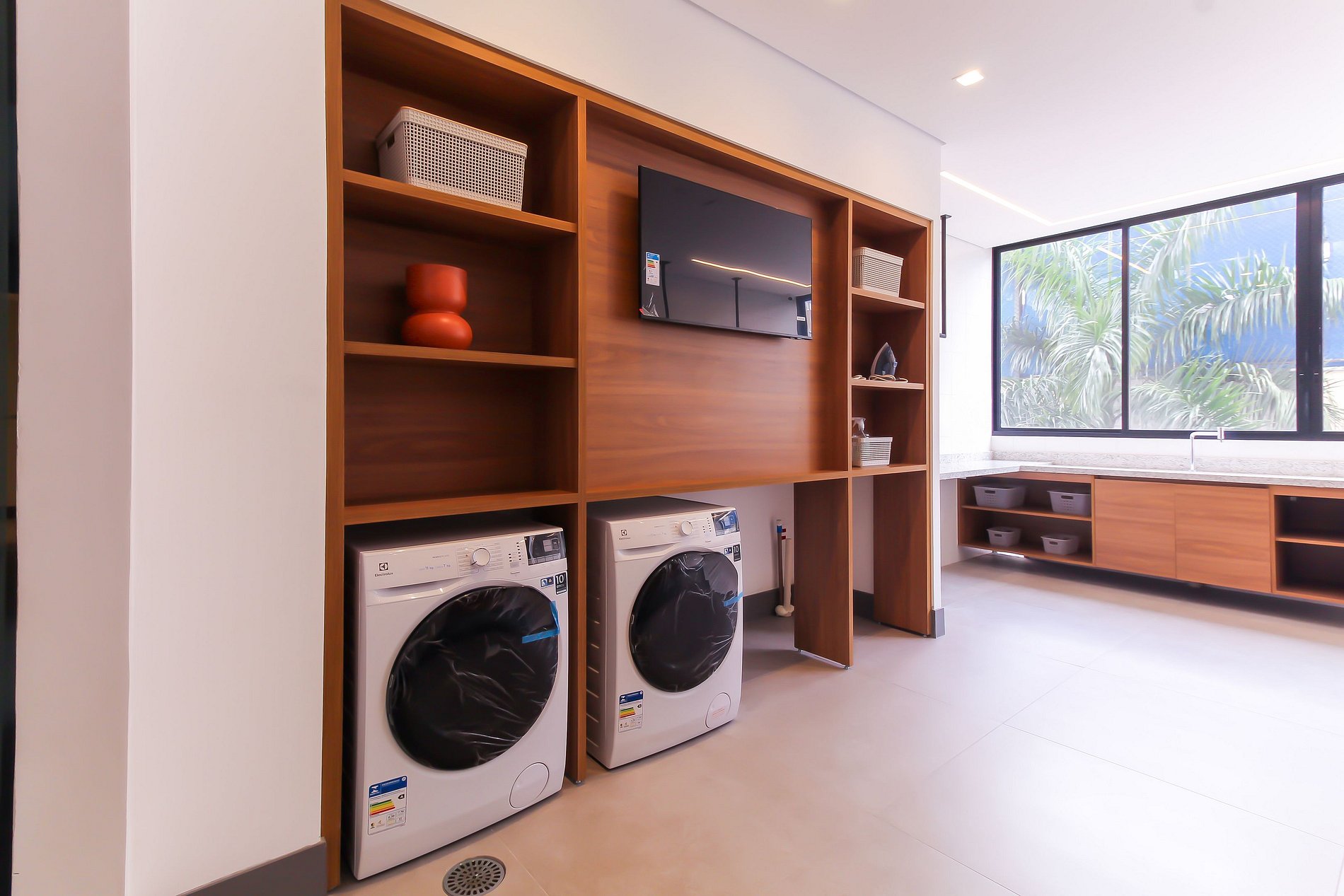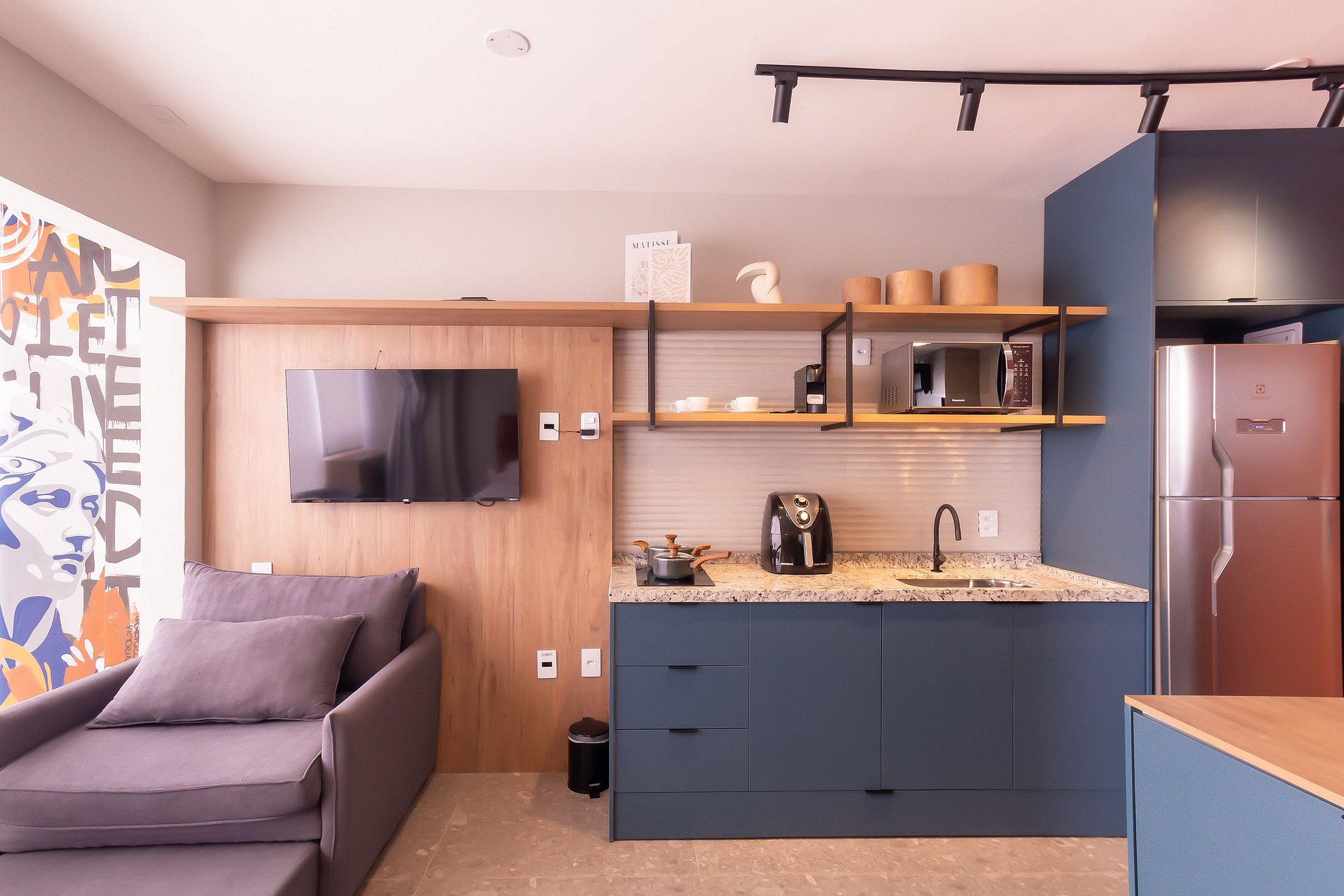 A cozinha é compacta, equipada com geladeira, cooktop, micro-ondas e utensílios básicos, ideal para refeições rápidas. O condomínio oferece piscina, academia equipada, lavanderia com máquinas de lavar e secar e portaria 24 horas, garantindo segurança e comodidade.